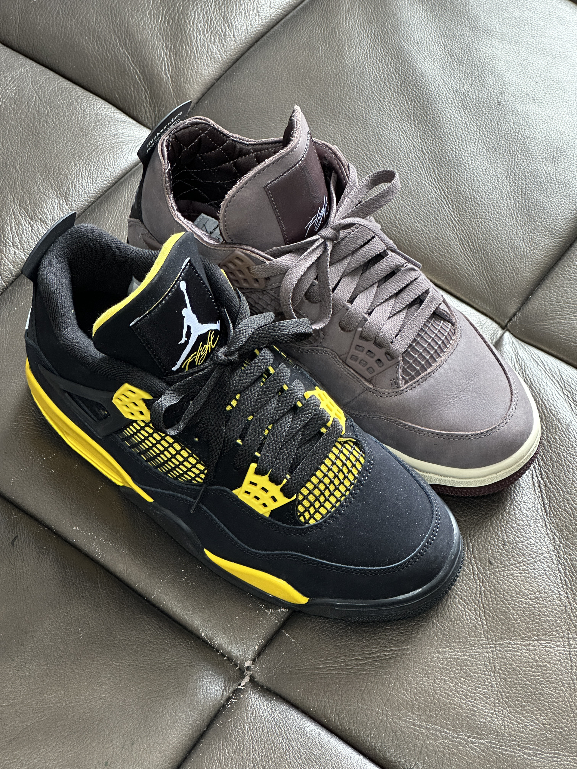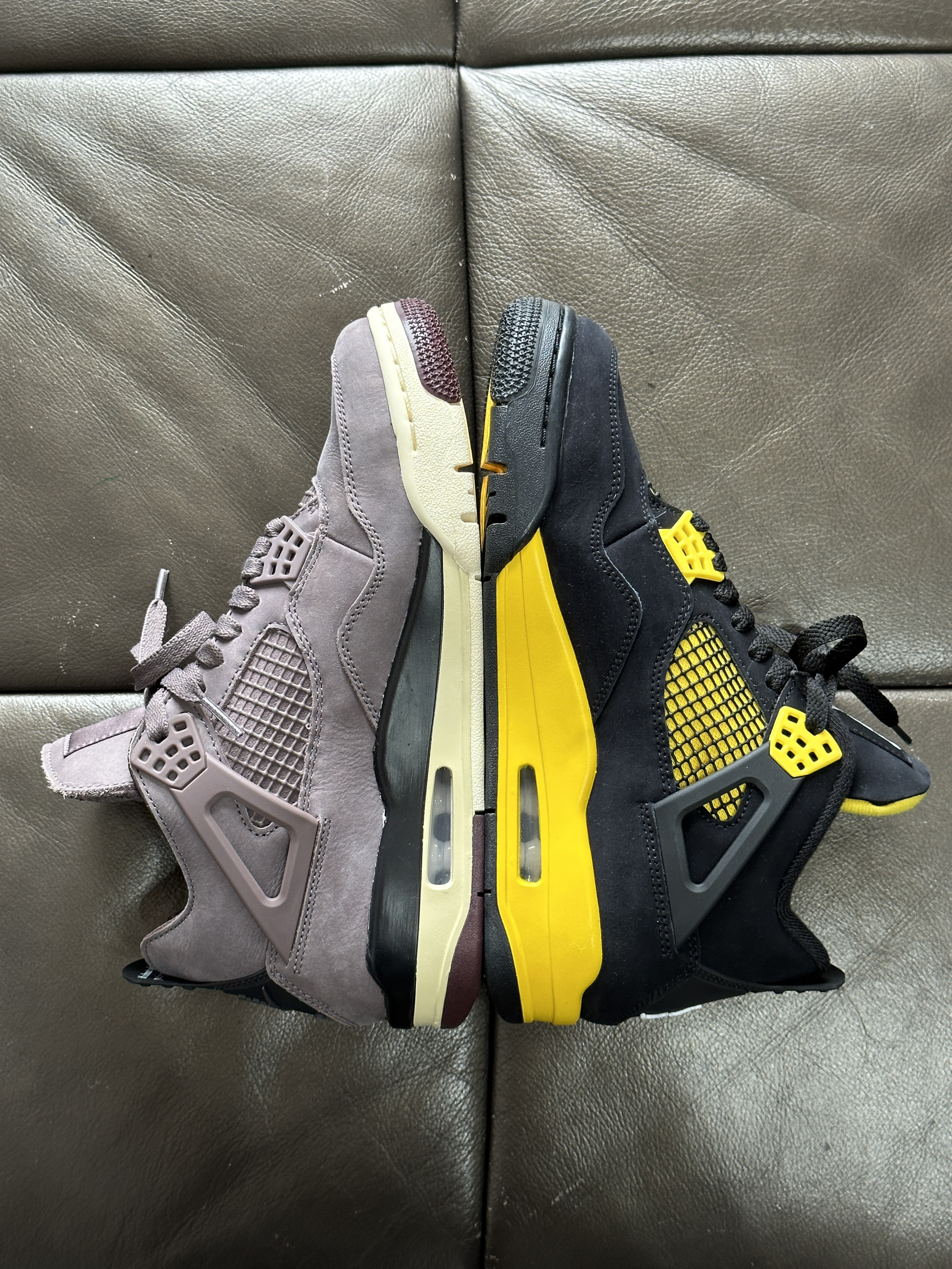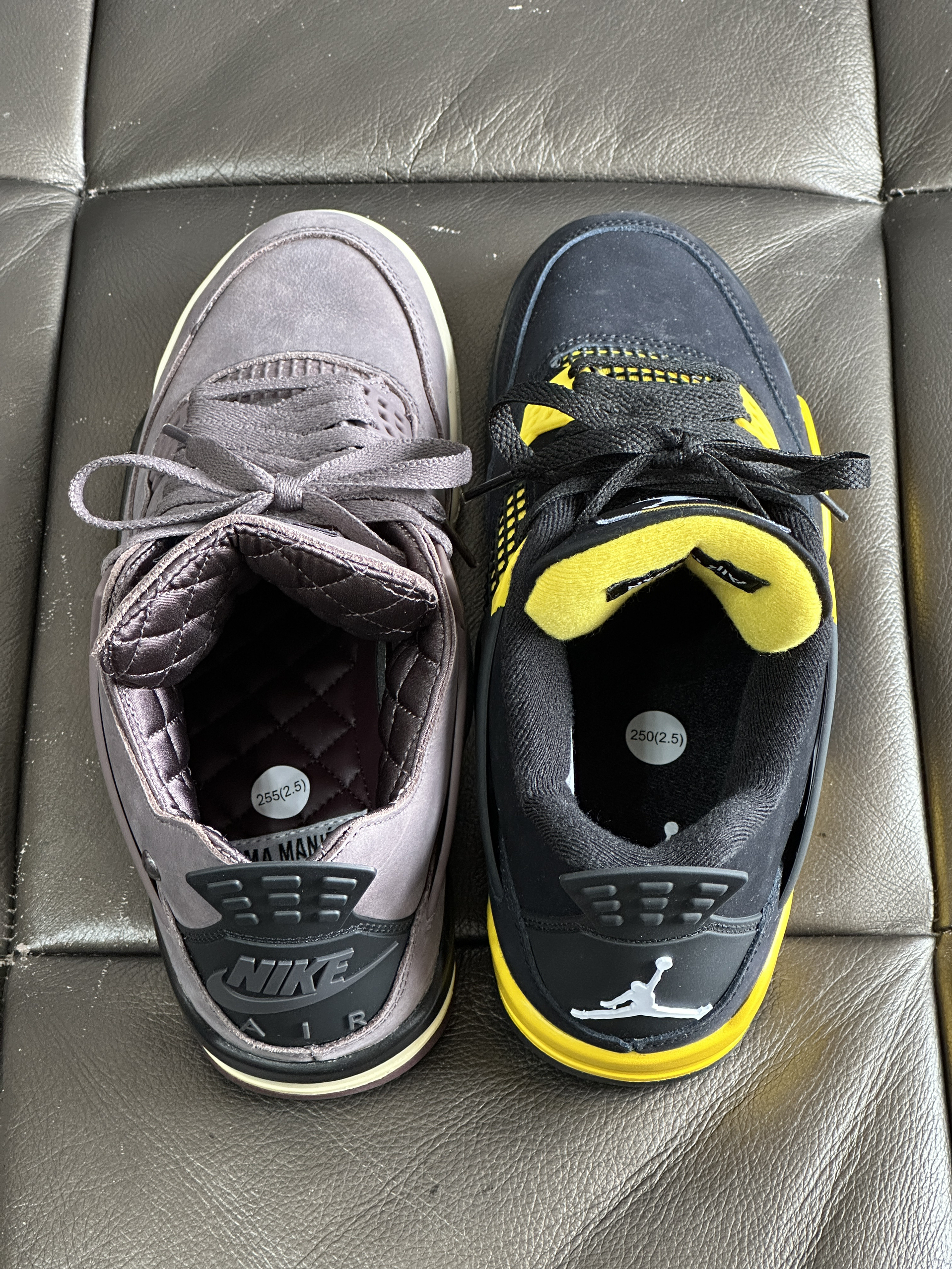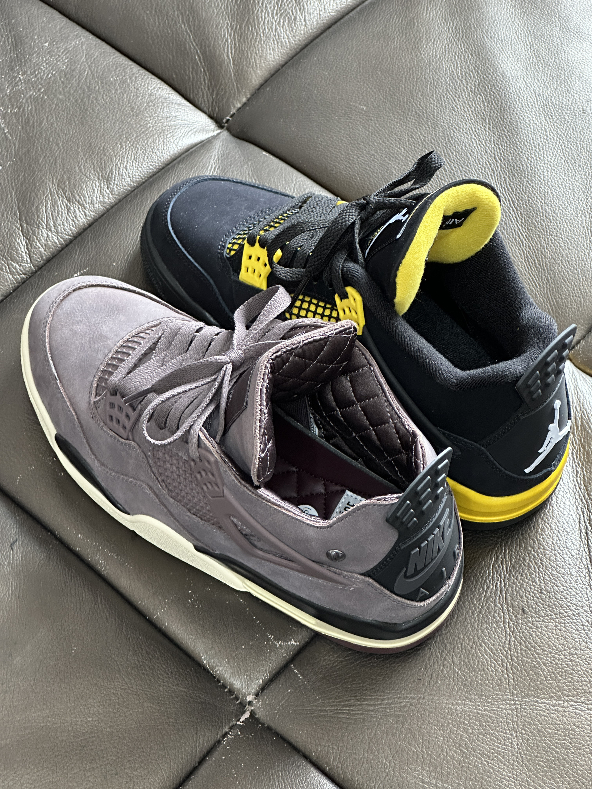 ▶两双都是麂皮的AJ4质感真的很出众!你更喜欢哪双? ▶AJ4雷公除了黑色麂皮容易粘灰以外好像没什么缺点!上脚太好看啦!加入的黄色点缀没有给人很突兀的感觉很赞! AJ4深酒红这双鞋值得细细品味,AMM联名款 细节堪称完美!菱形格的内衬和鞋垫让它可以伴你四季! ▶尺码方面:雷公标准,AMM偏小需要买大半码;