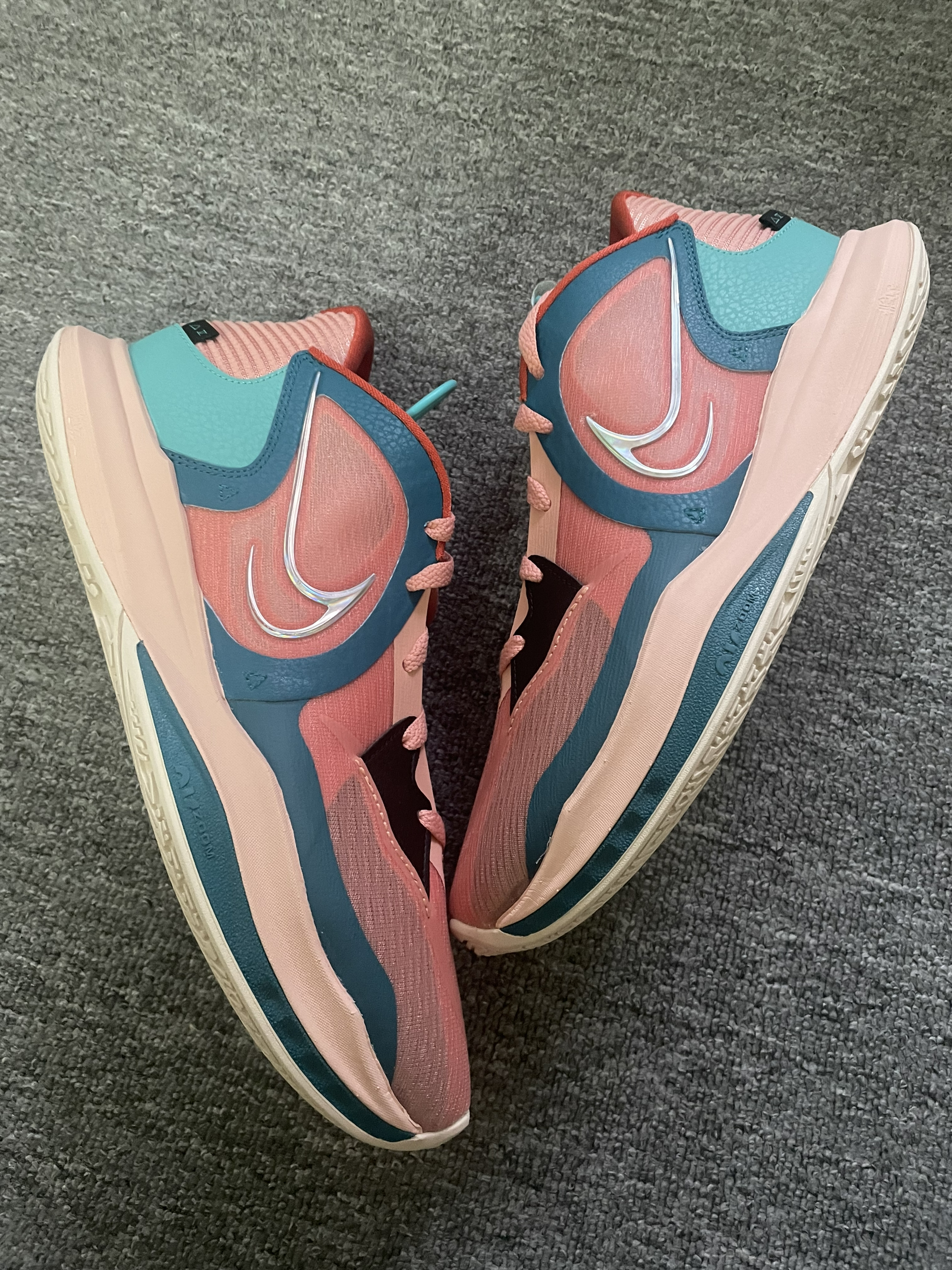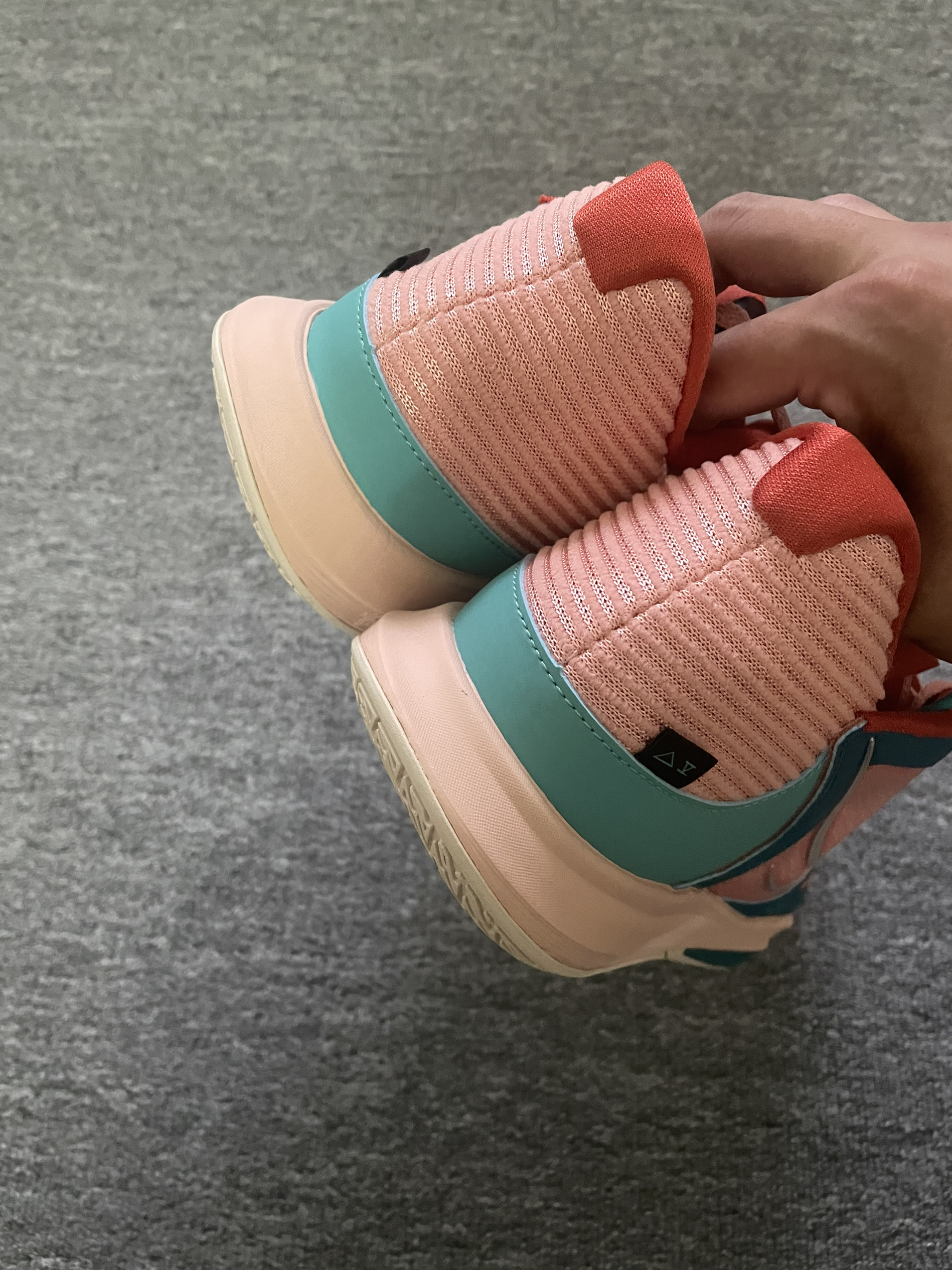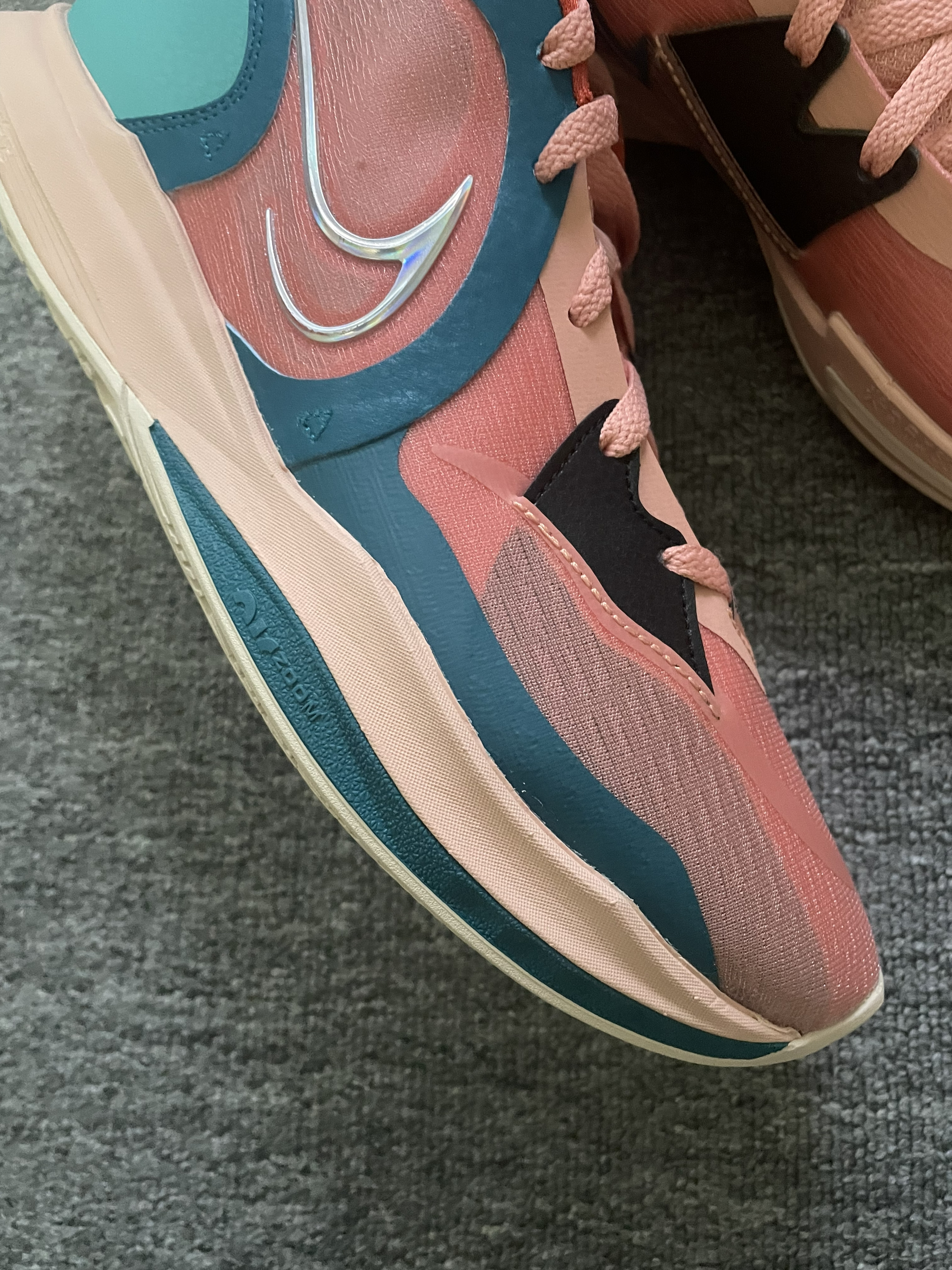 Nike Kyrie Low 5 EP 粉绿 低帮欧文球鞋颜值确实更高一些,上脚更好穿搭。 前掌气垫启动还是能感受到的,场地感出色。 编织鞋面加皮革的补强包裹感还行,透气性一般。脚踝处需要磨合,有点卡脚,整体来说还是很值得尝试的一双球鞋,毕竟Nike的欧文球鞋以后不会再有了⁉️⁉️