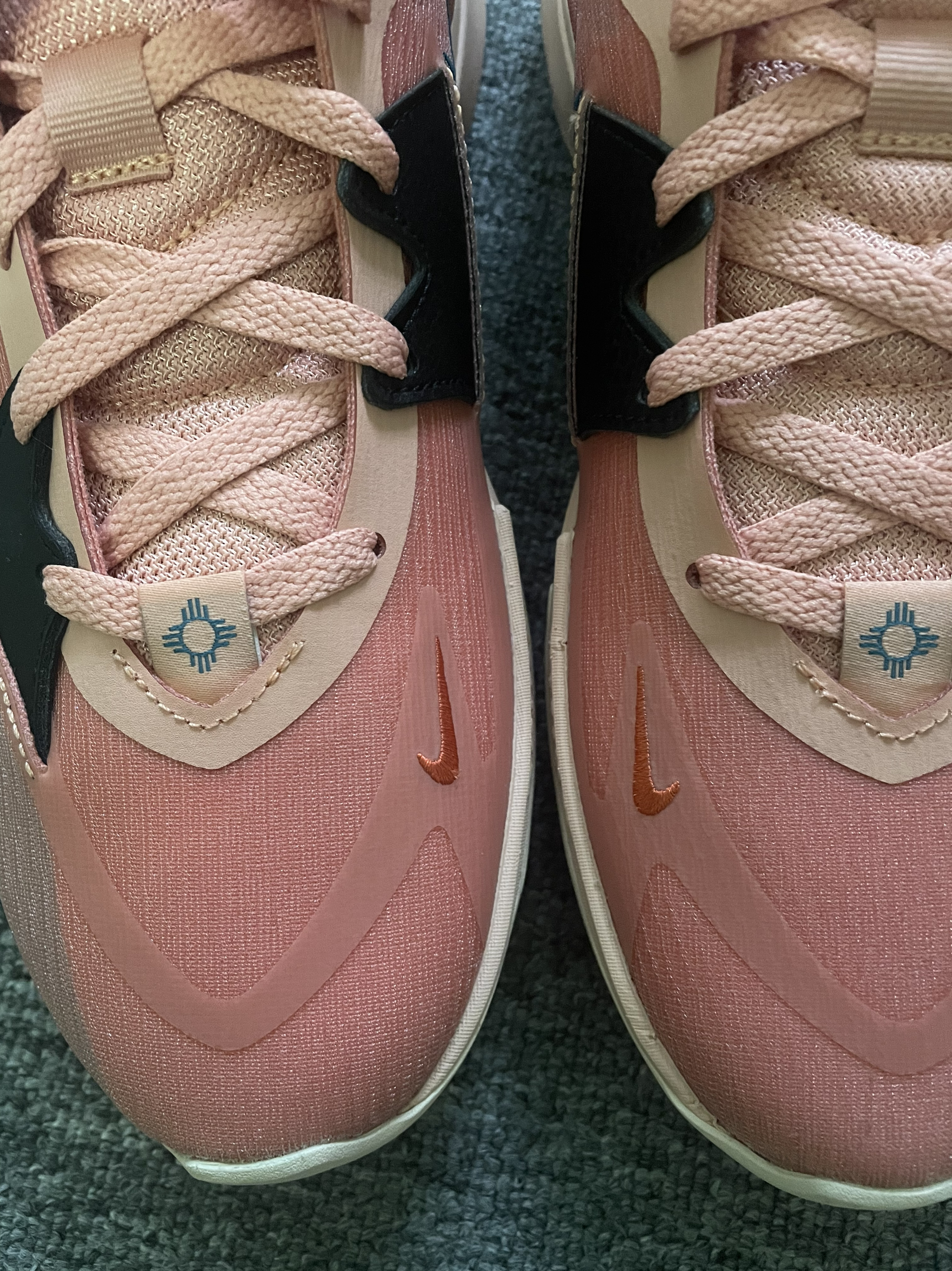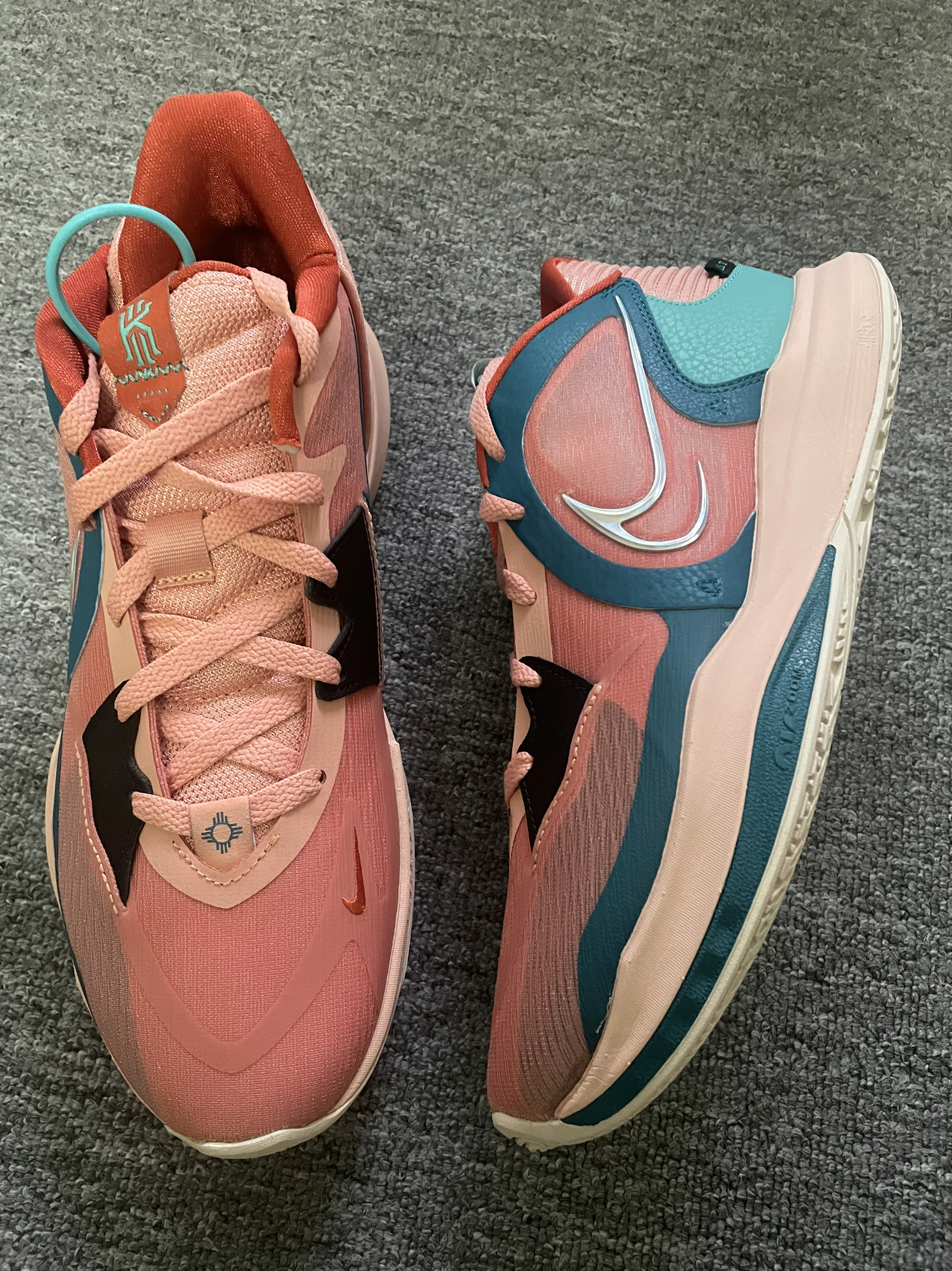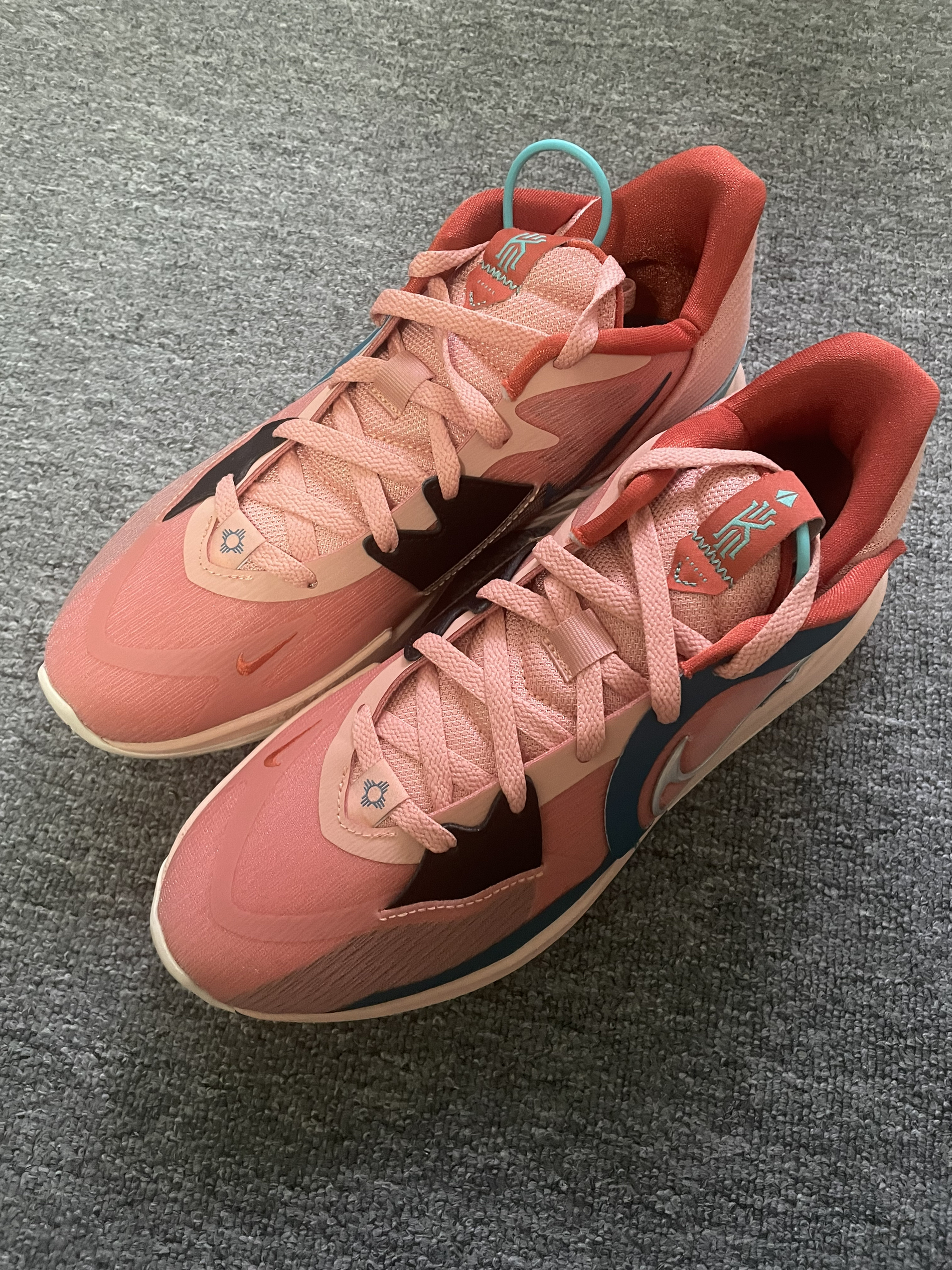 Nike Kyrie Low 5 EP 粉绿 低帮欧文球鞋颜值确实更高一些,上脚更好穿搭。 前掌气垫启动还是能感受到的,场地感出色。 编织鞋面加皮革的补强包裹感还行,透气性一般。脚踝处需要磨合,有点卡脚,整体来说还是很值得尝试的一双球鞋,毕竟Nike的欧文球鞋以后不会再有了⁉️⁉️