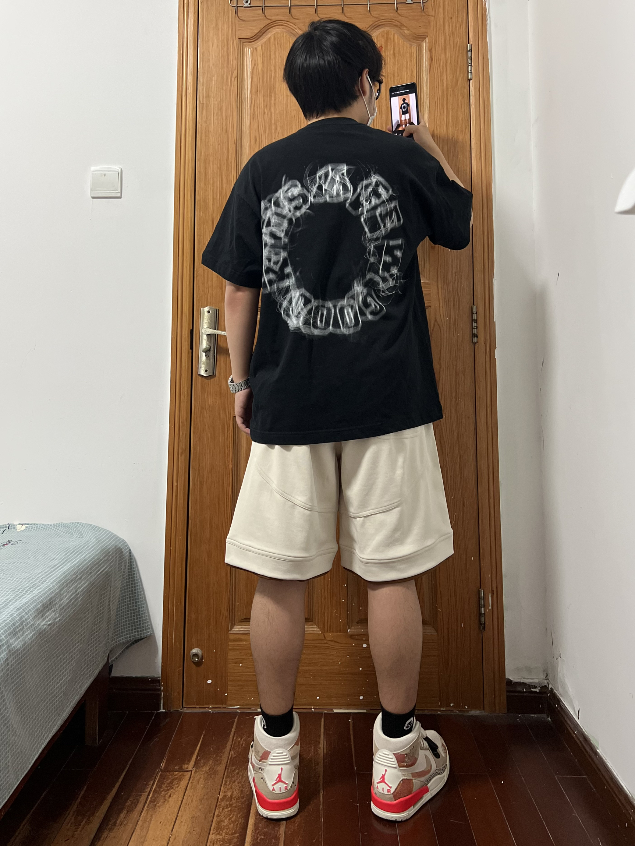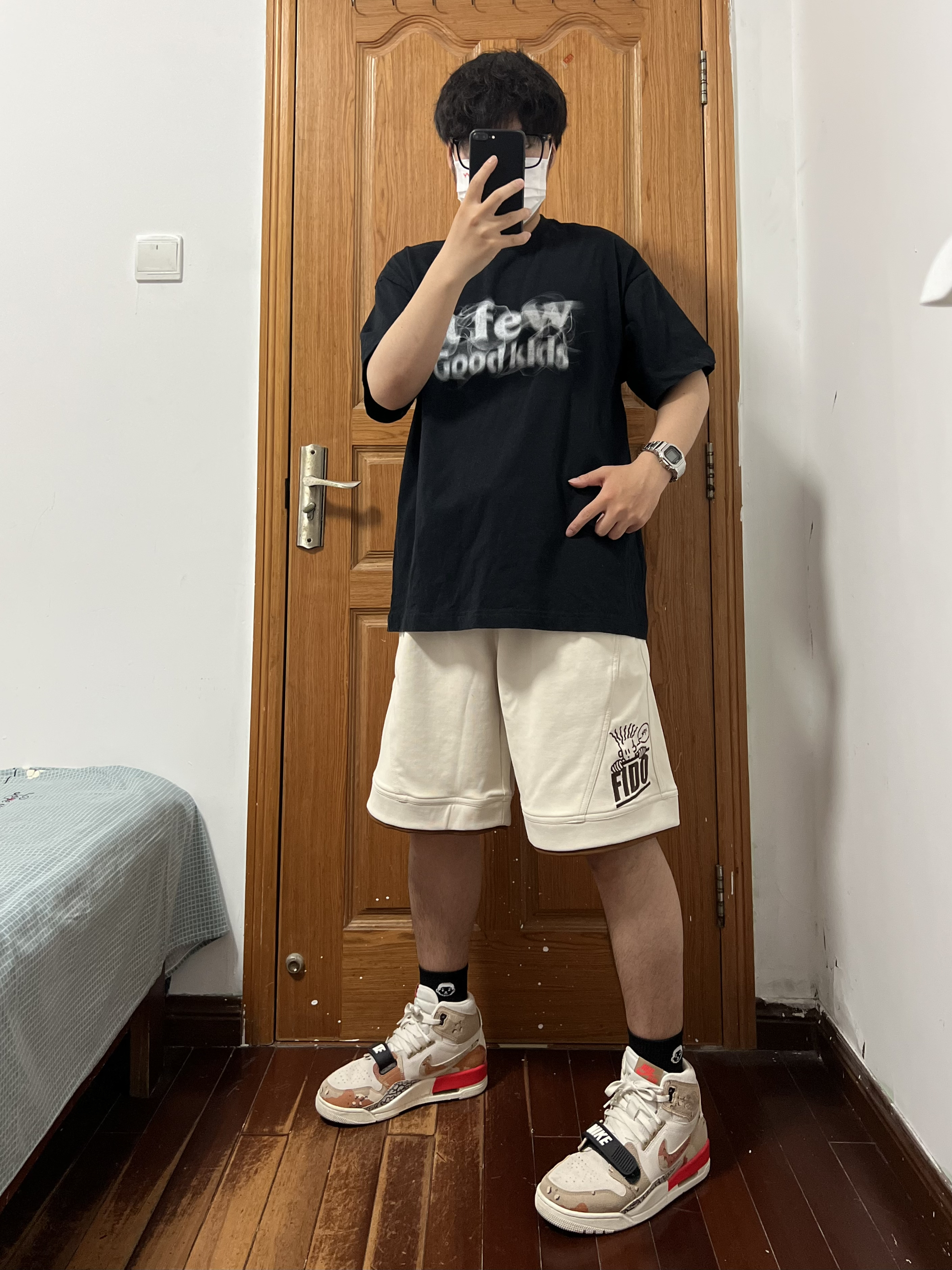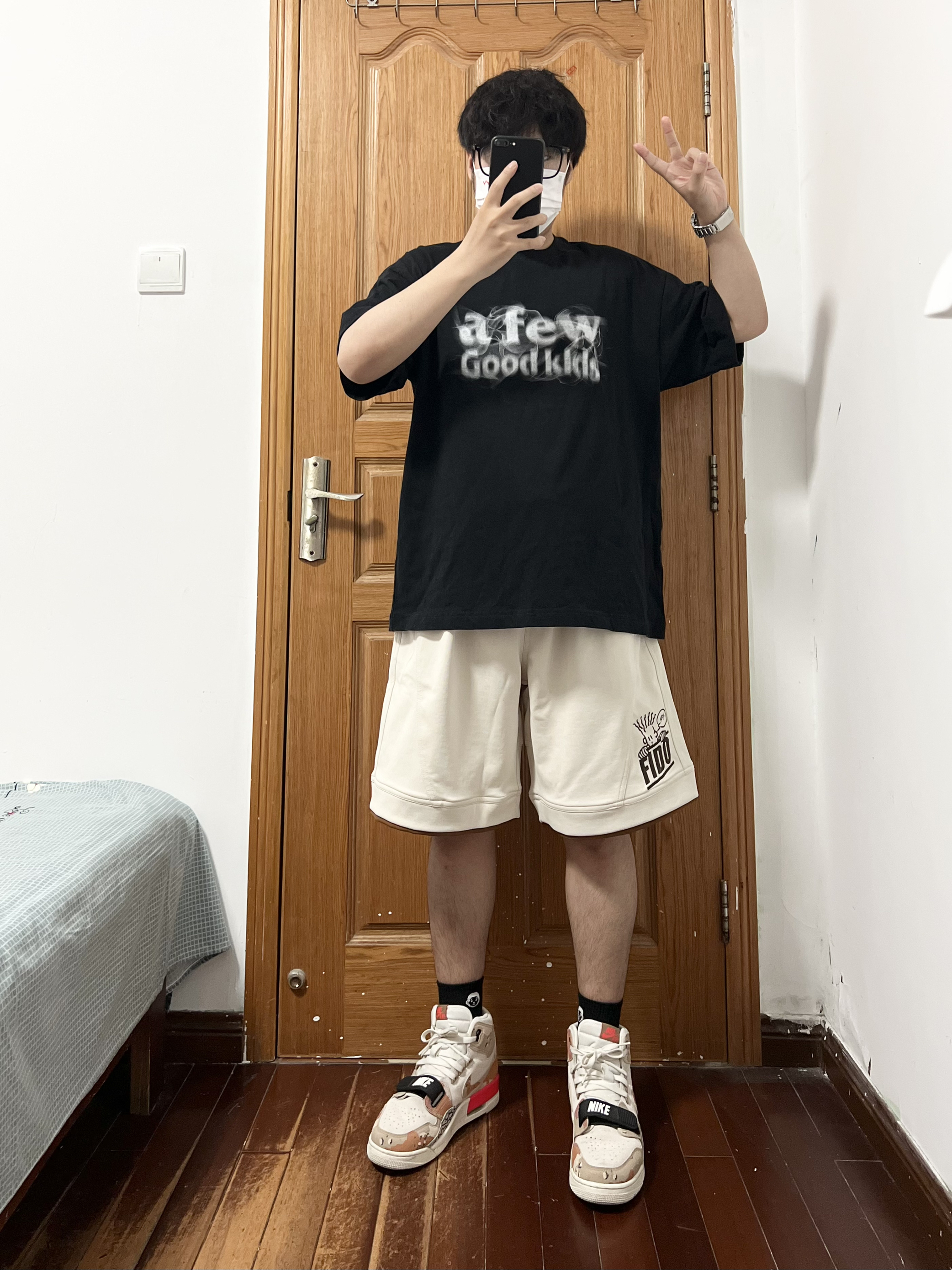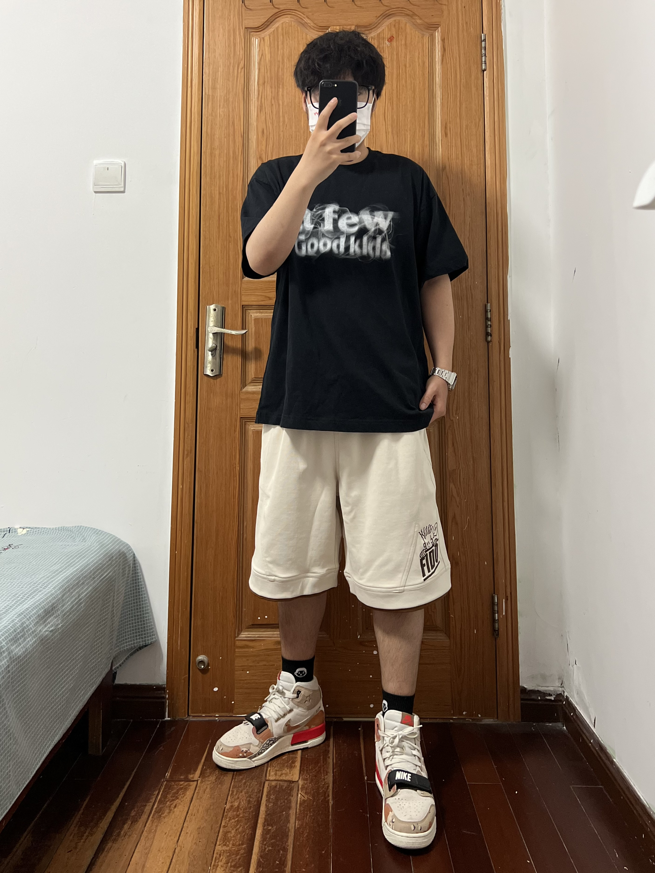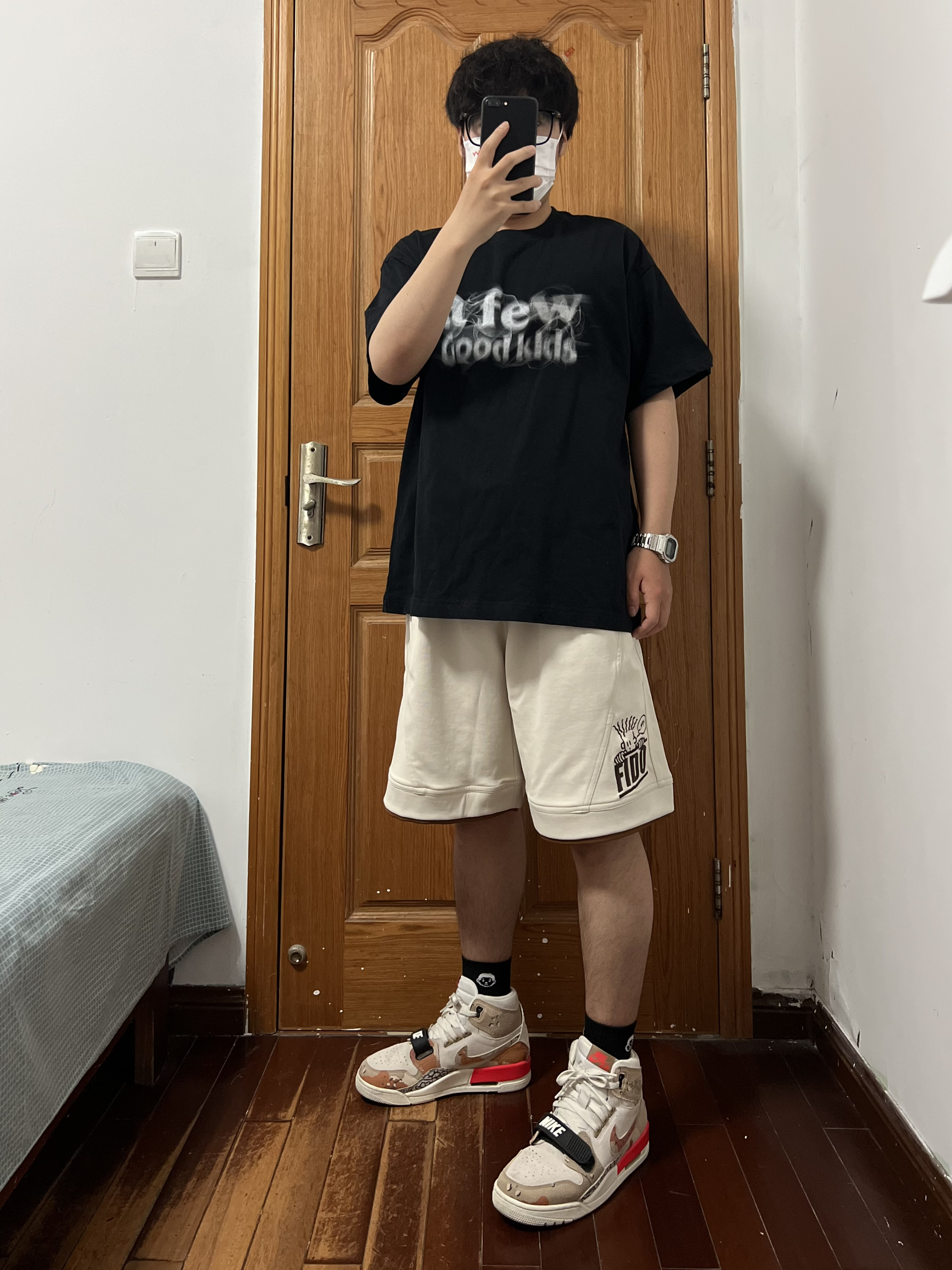 今日份穿搭分享🎉 上衣是AFGK黑色短袖FFF帅爆❗️ 烟熏字母logo印花很喜欢很喜欢这个feel 搭配FIDO DIDO 基础简约绣标拼色短裤🩳 喜欢是它的结构设计虽然是杏色但好搭配 深色系上衣配就很good boy还有👦logo哈哈 面料舒适亲肤很适合这个夏天穿着五分裤也帅 裤脚有一点的拼色带来边缘感很上道的小心机 搭配一双增高显瘦的AJ312沙漠迷彩太酷啦❗️ 👔 黑色短袖 👖 FIDO...