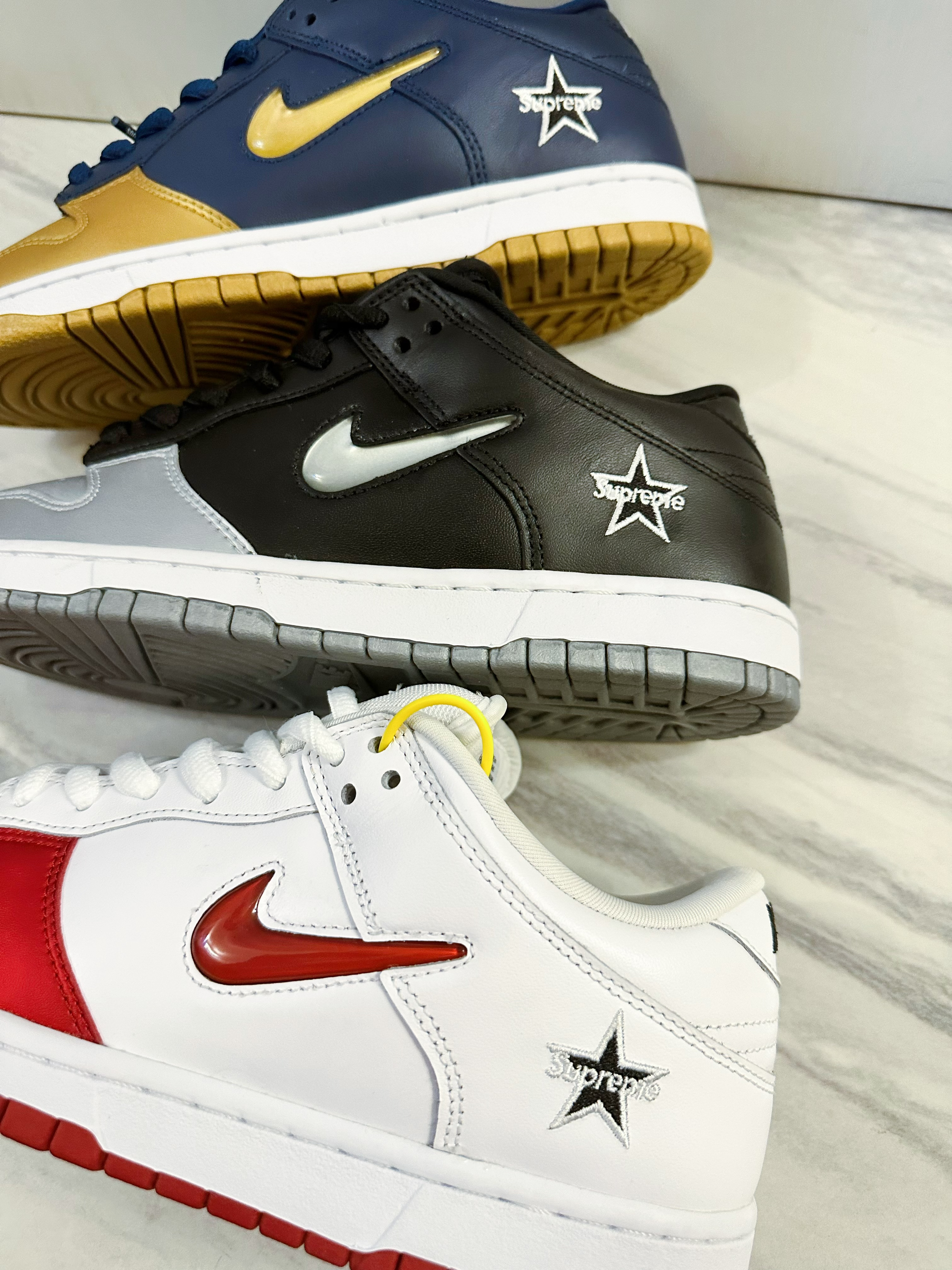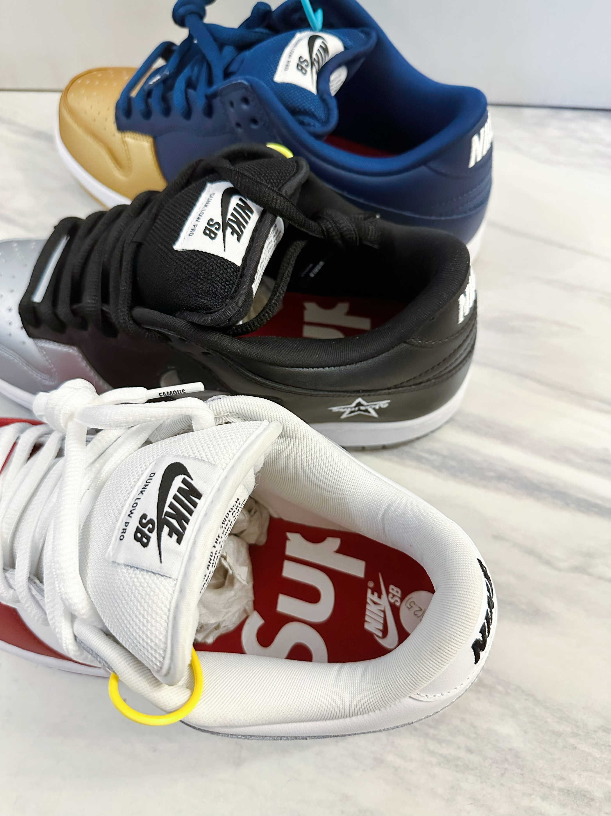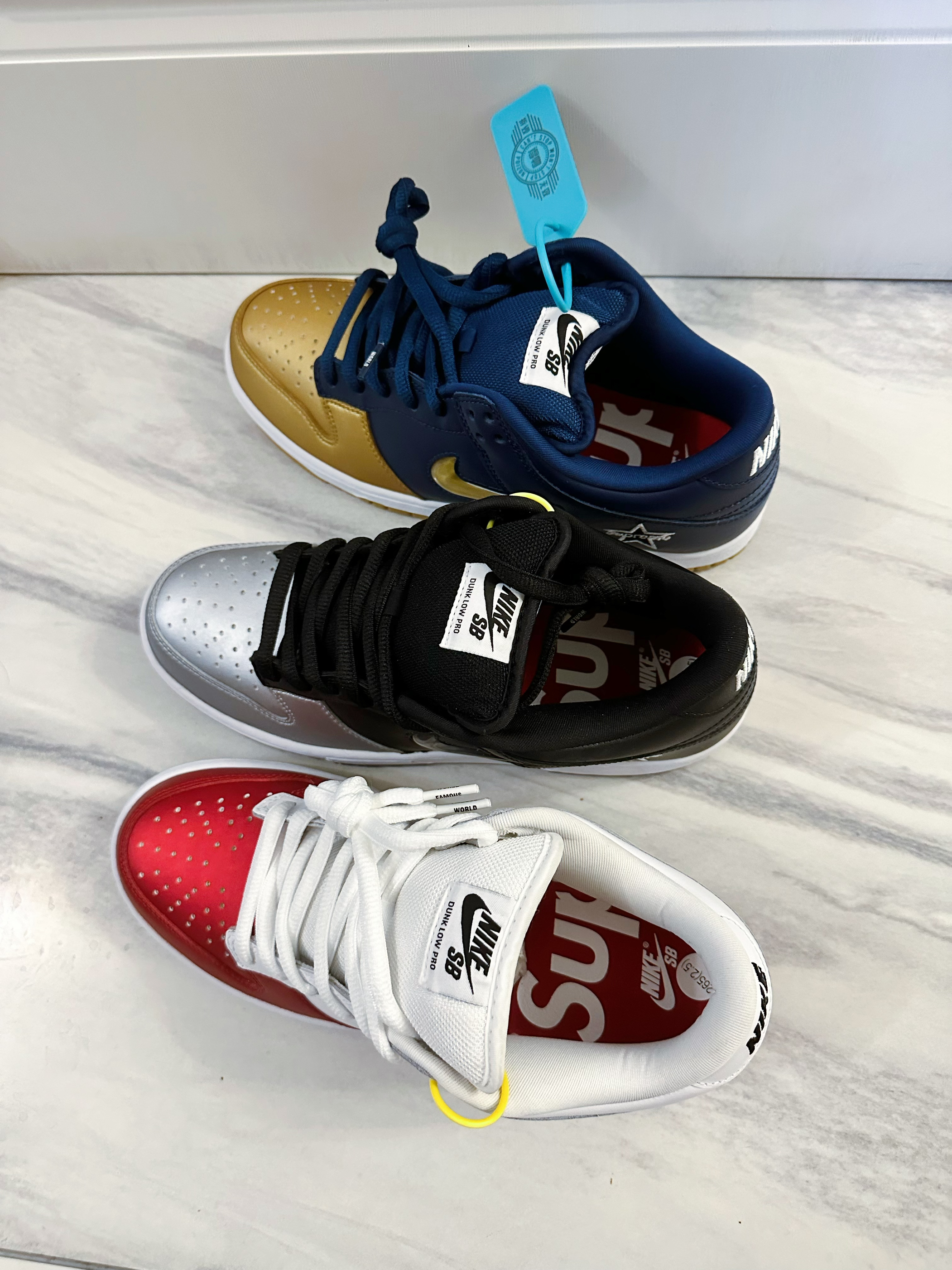 sup在潮流圈可以说是佼佼者了,很多单品受到潮人的追捧,这次和nike的联名则已Dunk SB鞋型为蓝图分别出了三种配色,三种配色都是撞色的设计,分别为白红,黑银和蓝金三种配色,每种配色的辨识度都非常高,可以根据自己喜好和穿搭进行选择。最特别的设计在于迷你的果冻swoosh,并且包括大底的配色都是以脚面的主配色为主,分别是红色,银色和金色,后跟的是sup的五角星刺绣彰显联名,而鞋垫则都是采用sup...