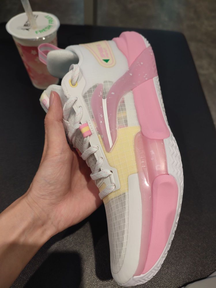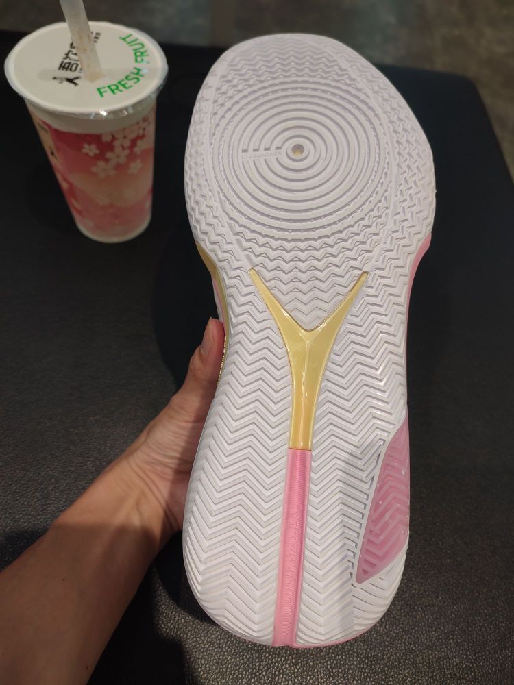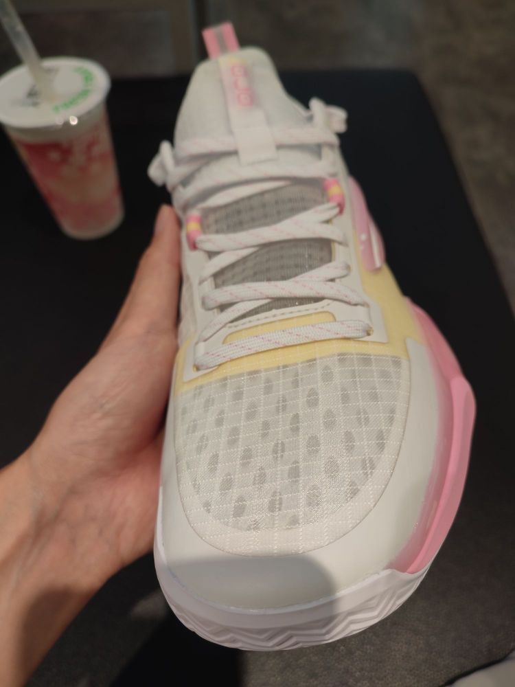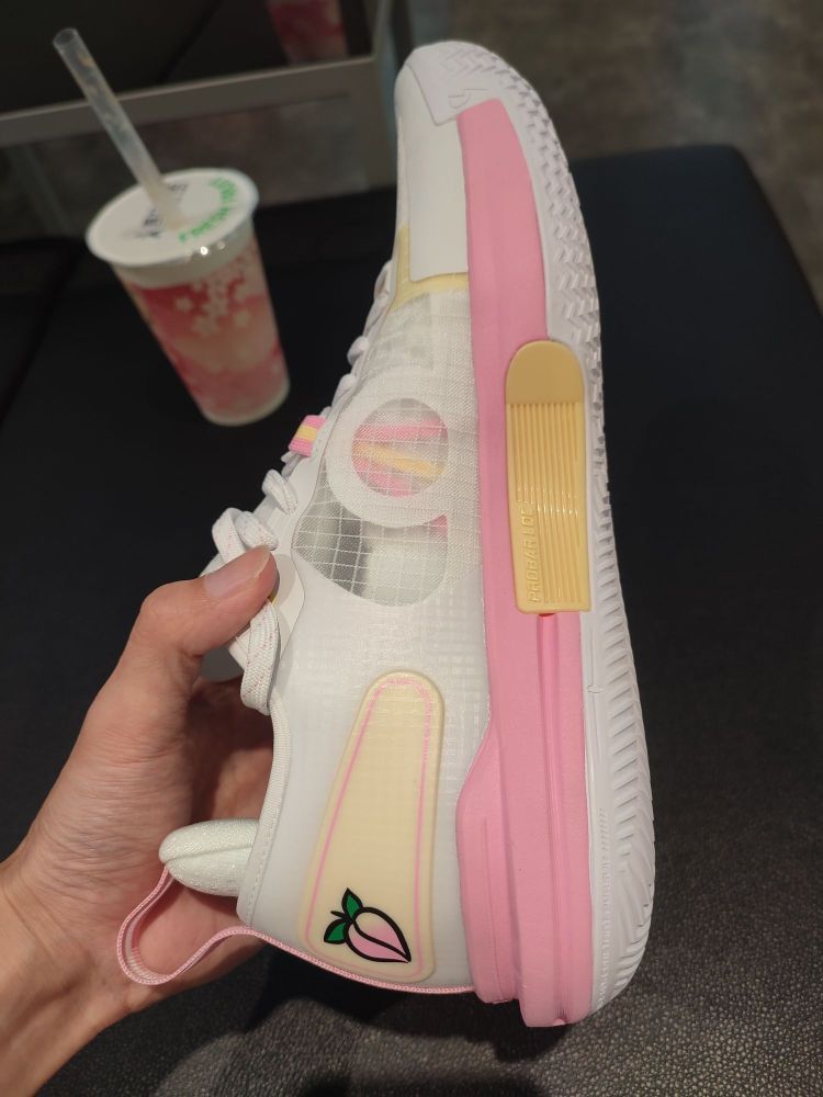 这双夏季版的水蜜桃,非常实用! 鞋子的缓冲作用比较好,穿起来有弹性,很舒适,并且鞋面的透气性比较好,夏天穿去实战非常适合! 鞋底的抓地力强,纹路美观,并且适合各各方向的极速变向,很能打! 鞋子除了适合实战,它的颜值是球场上的一道靓丽风景线!鞋子后跟的水蜜桃太好看了,粉色的鞋身非常养眼,我买了杯同款颜色的奶茶才好意思一起拍照![大笑] 实用又好看,除了打球,穿去逛街也很适合,非常喜欢这样的实战鞋!😍