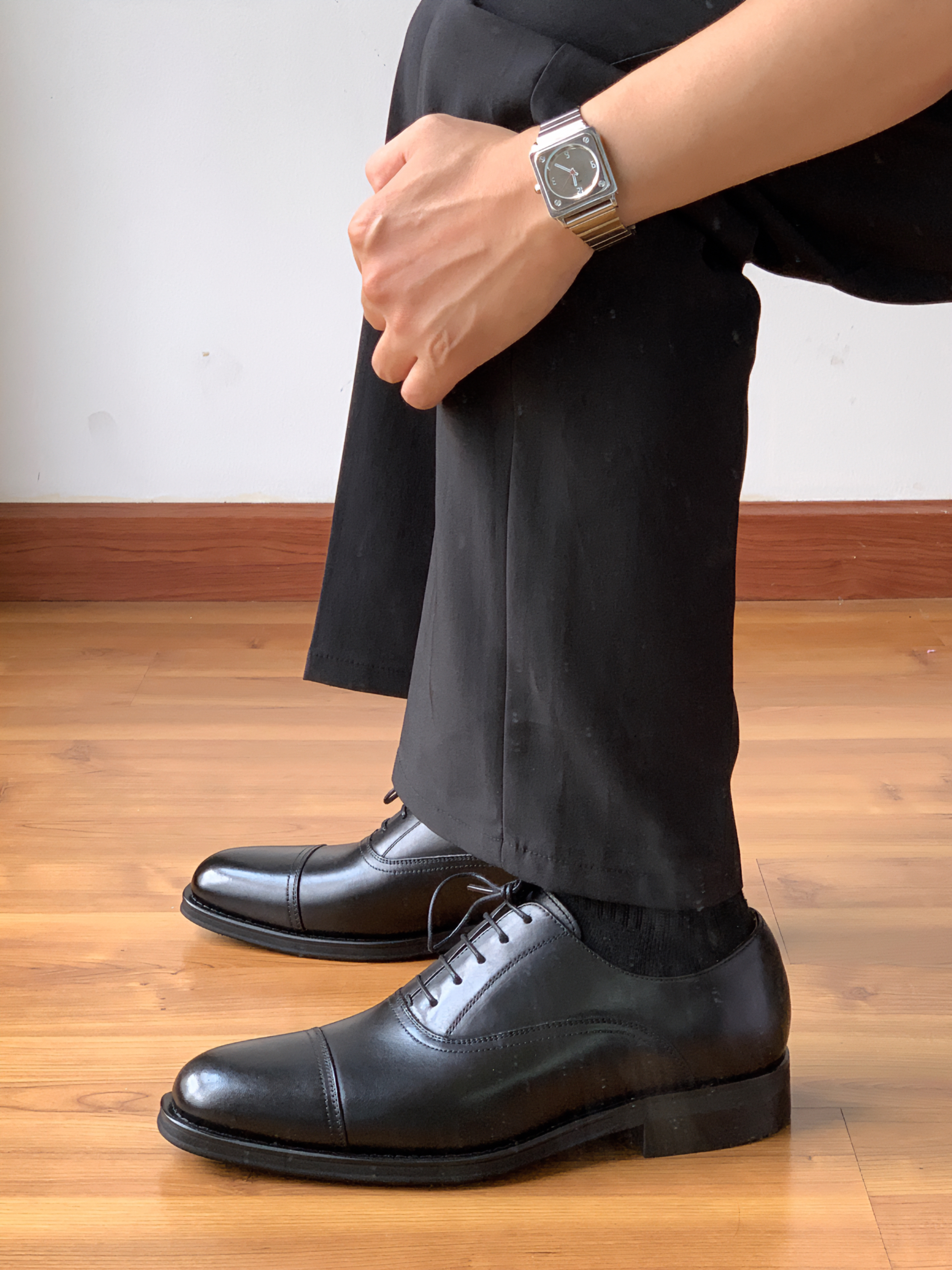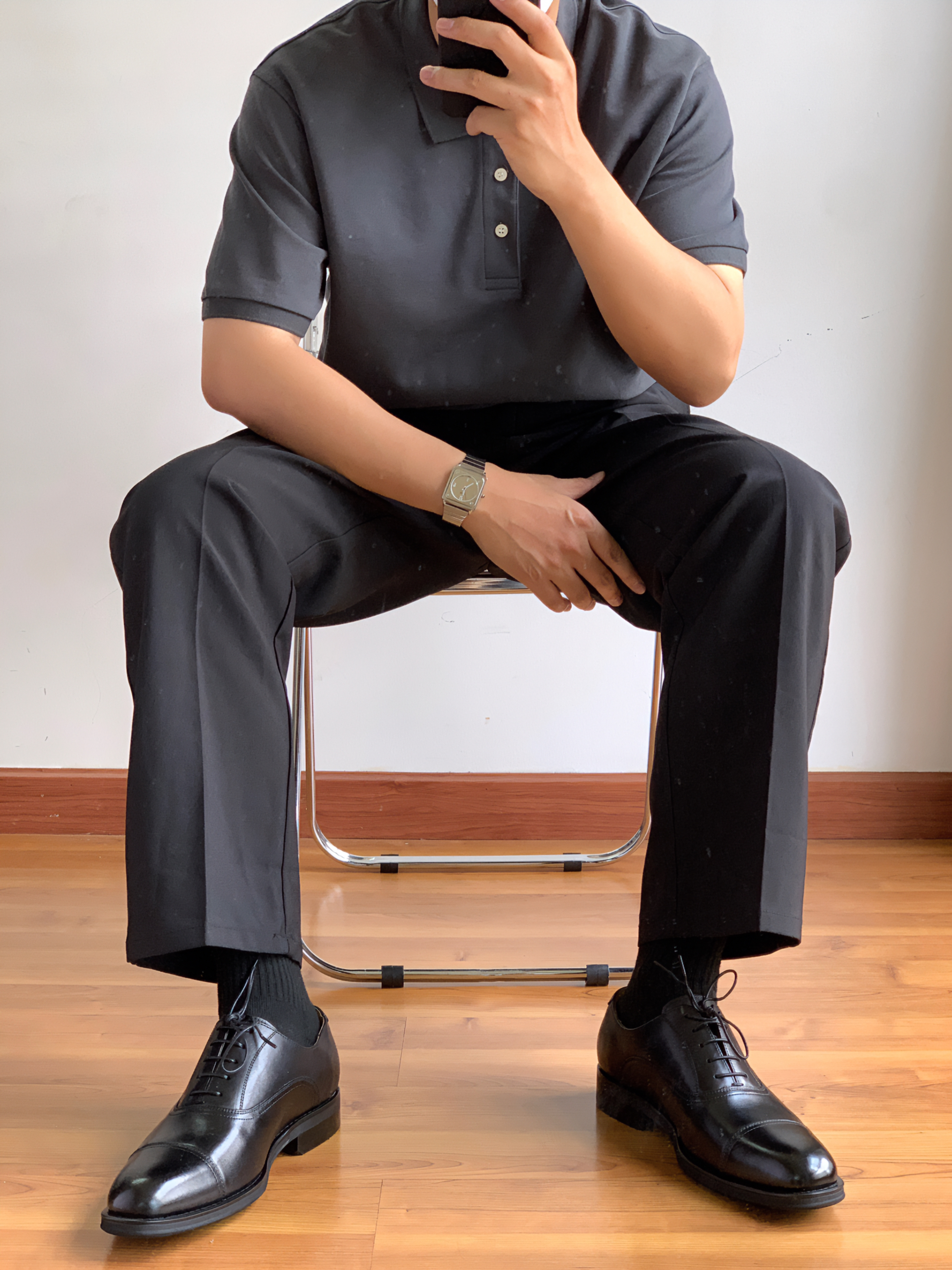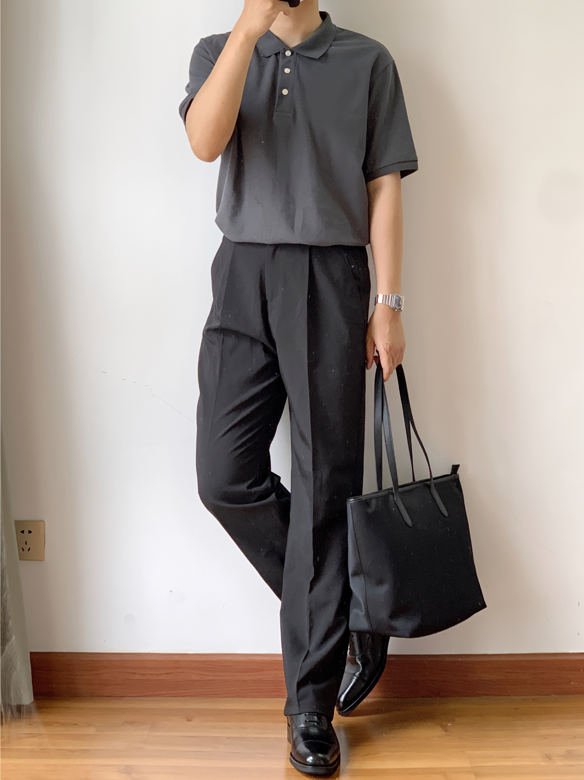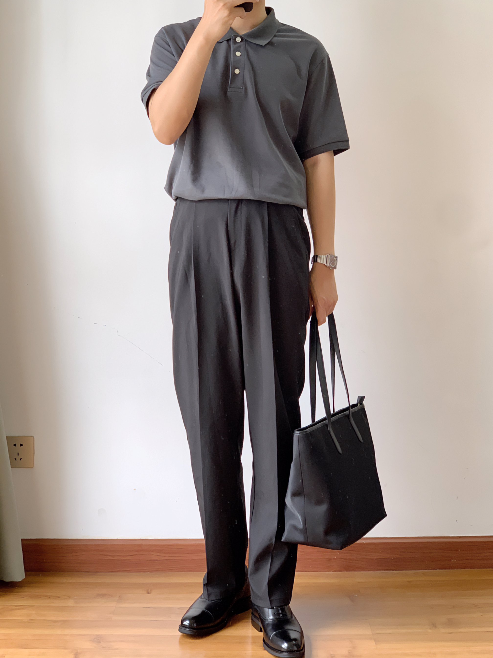嘿,这里是社畜日记的OOTD 不知道穿什么的时候真的无脑锁定黑白灰就好了 深灰色POLO微微廓形的版型 不会太老气 直筒垂坠的黑西裤是通勤穿搭必不可少的单品了 当然也少不了一双很有质感的黑皮鞋了 再来一个黑色托特包 这样简单的一套体制内穿搭就搞定了