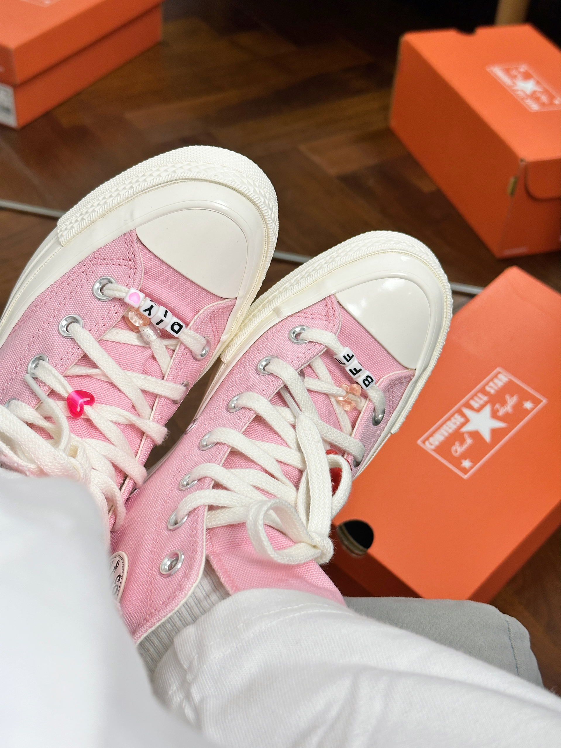 超好看的颜色 帆布鞋还得是匡威 还有小配饰diy 鞋带 哪个姐姐逃得过 买新鞋!拥有粉色好心情!爱了!我先穿为敬