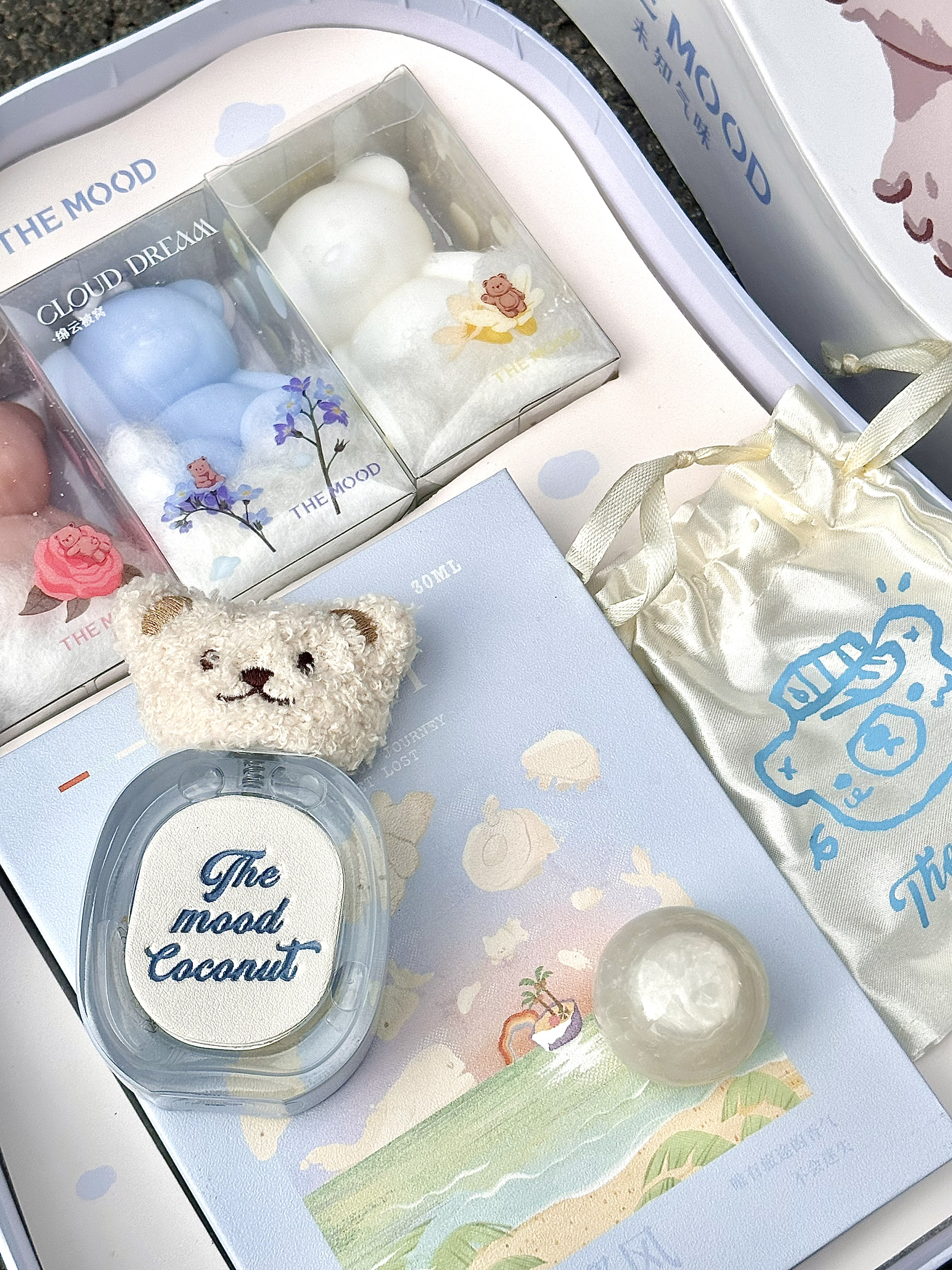里面有一瓶香水和三个香薰蜡烛 香水的味道是奶香奶香的 像极了少女香 还送了一个小熊瓶盖 炒鸡可爱 白色的蜡烛是木质茶香味 很适合放在书房 粉红色的蜡烛是桃子玫瑰味 满满的春天的味道 蓝色的是丝绒椰奶香味 很适合放在卧室 光看这个小熊礼盒都很难不爱