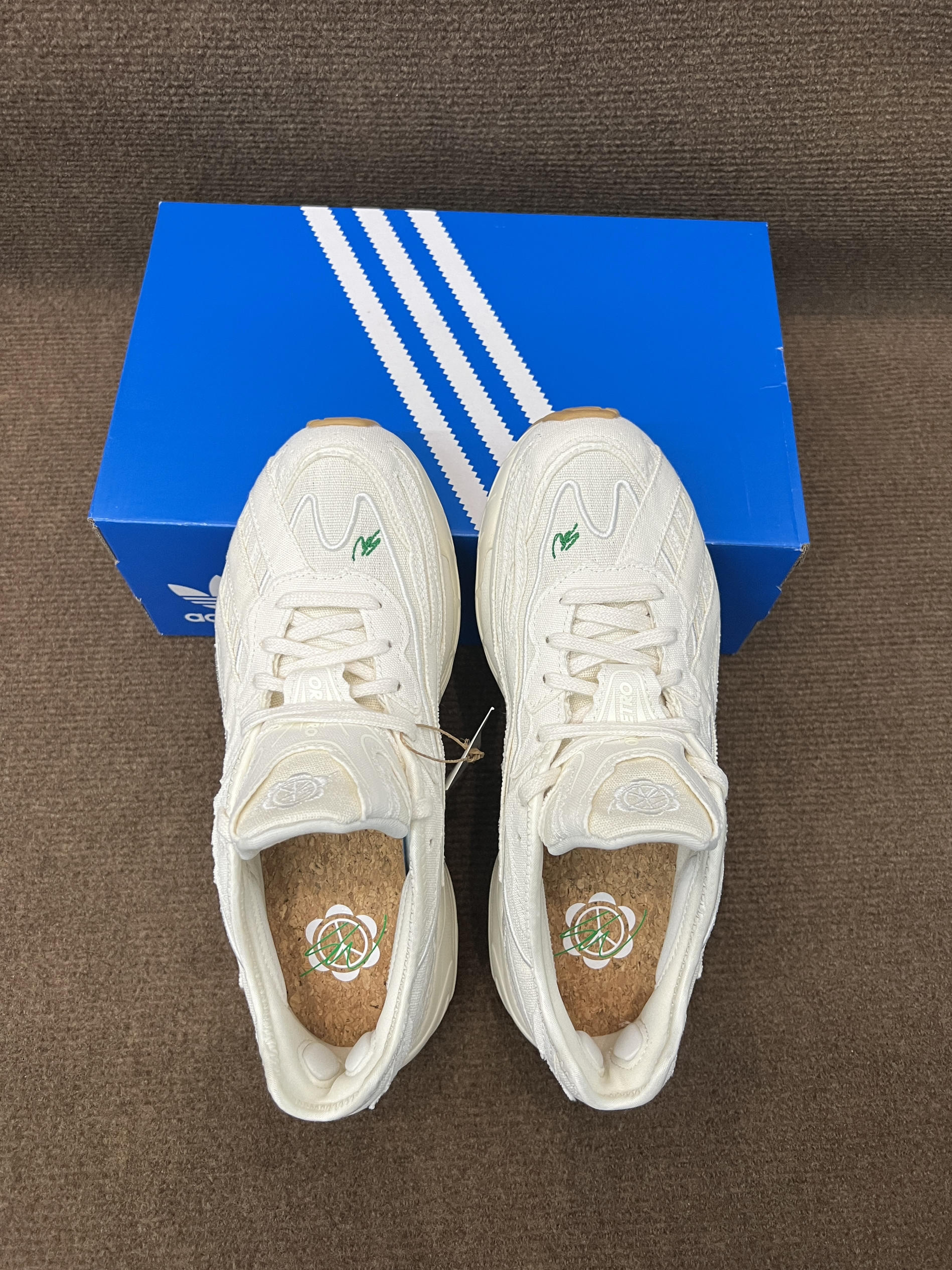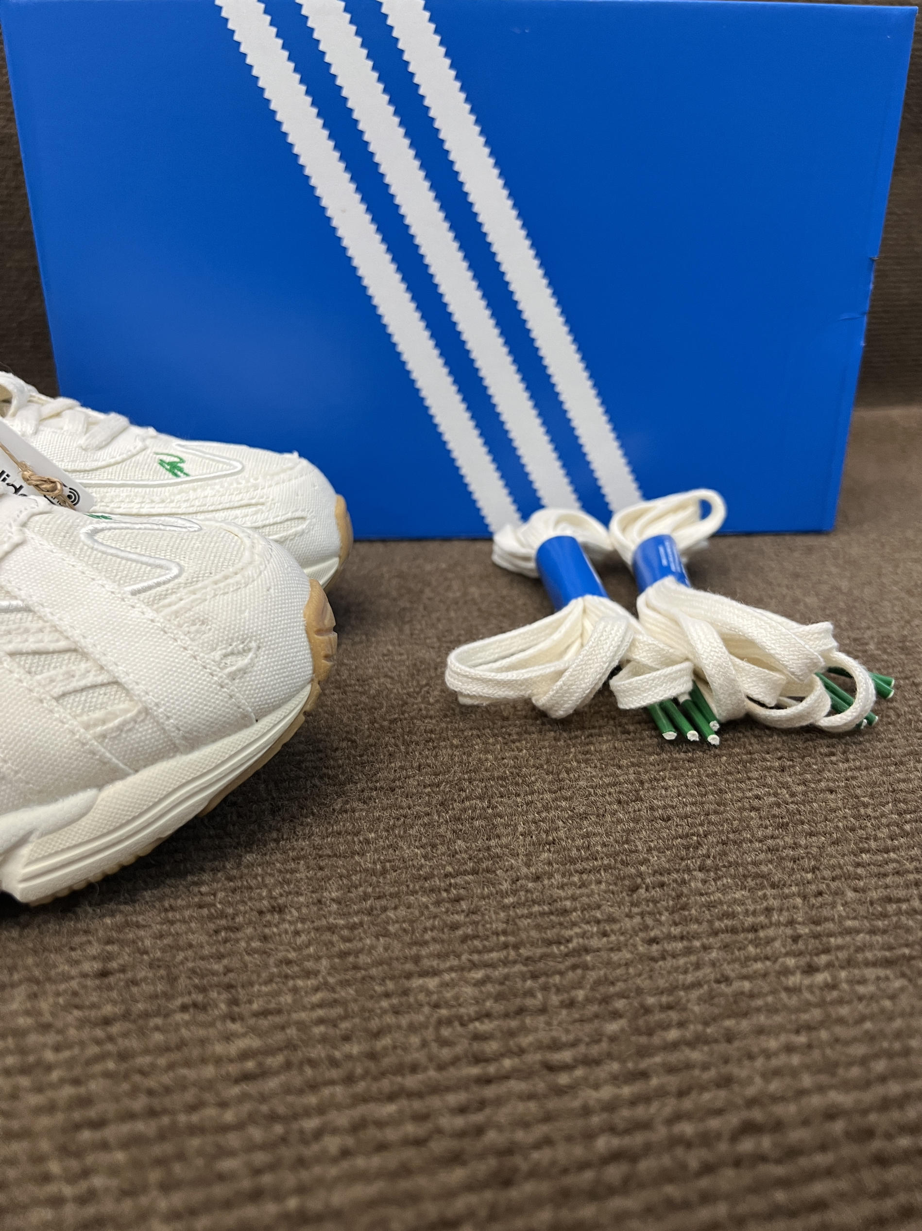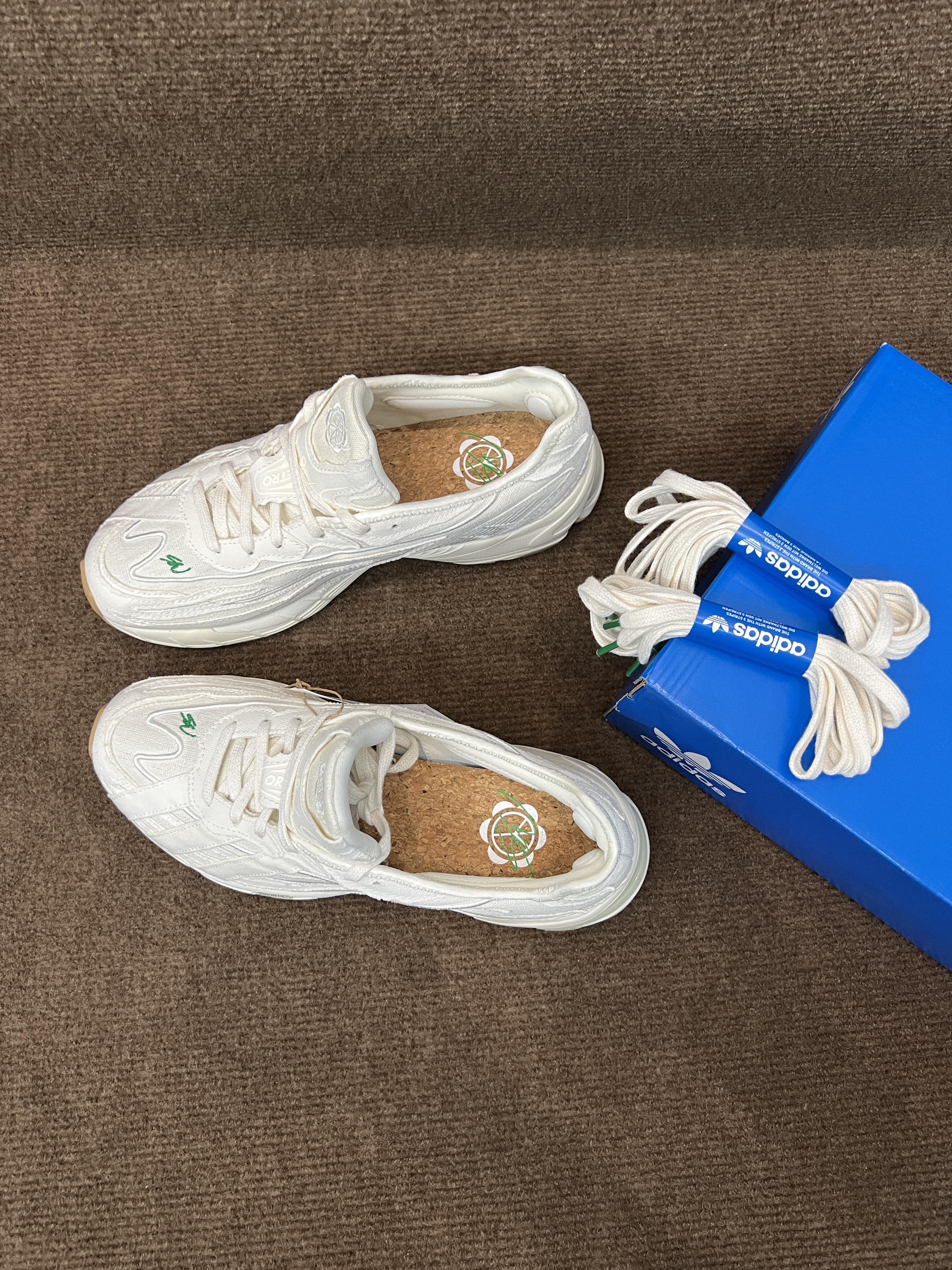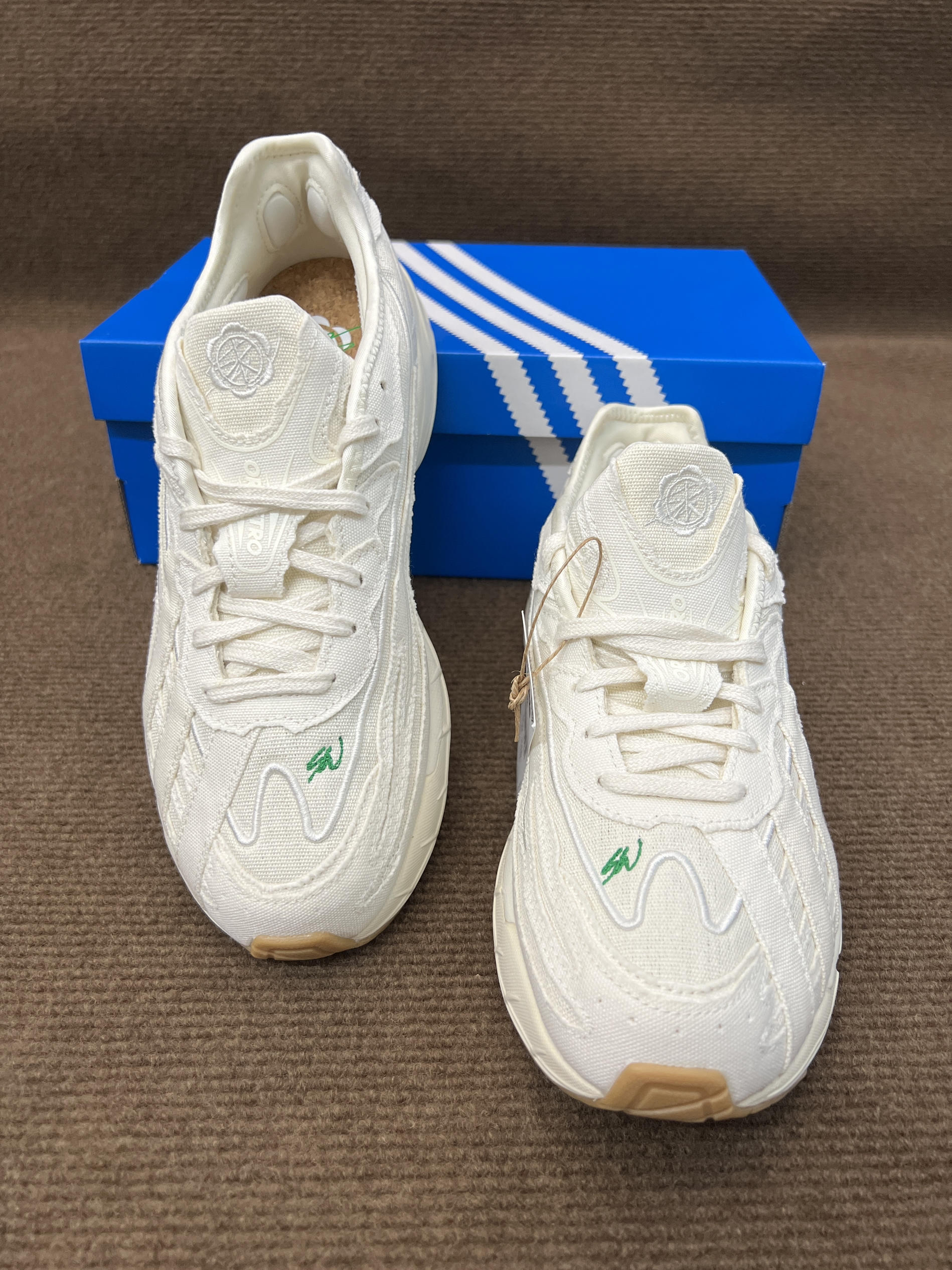 🤔🤔🤔这双是灯芯绒届的大师sean联名的跑鞋,上手感觉颜值还不错,要说很特别倒也说不上来 🍀🍀🍀配色方面全鞋身以白色为主,鞋面有sw的绿色刺绣作为点缀,也彰显联名。中底前侧为白色,后侧大部分为做旧米黄色,气垫部粉为透明浅绿色。大底为米棕色。配色清新百搭,复古风格 🍀🍀🍀材质方面鞋面以环保织物为主,并非网面,是那种棉麻布的感觉,很适合diy。上脚舒适透气可玩性高。脚感方面鞋底有adiprene的缓震...