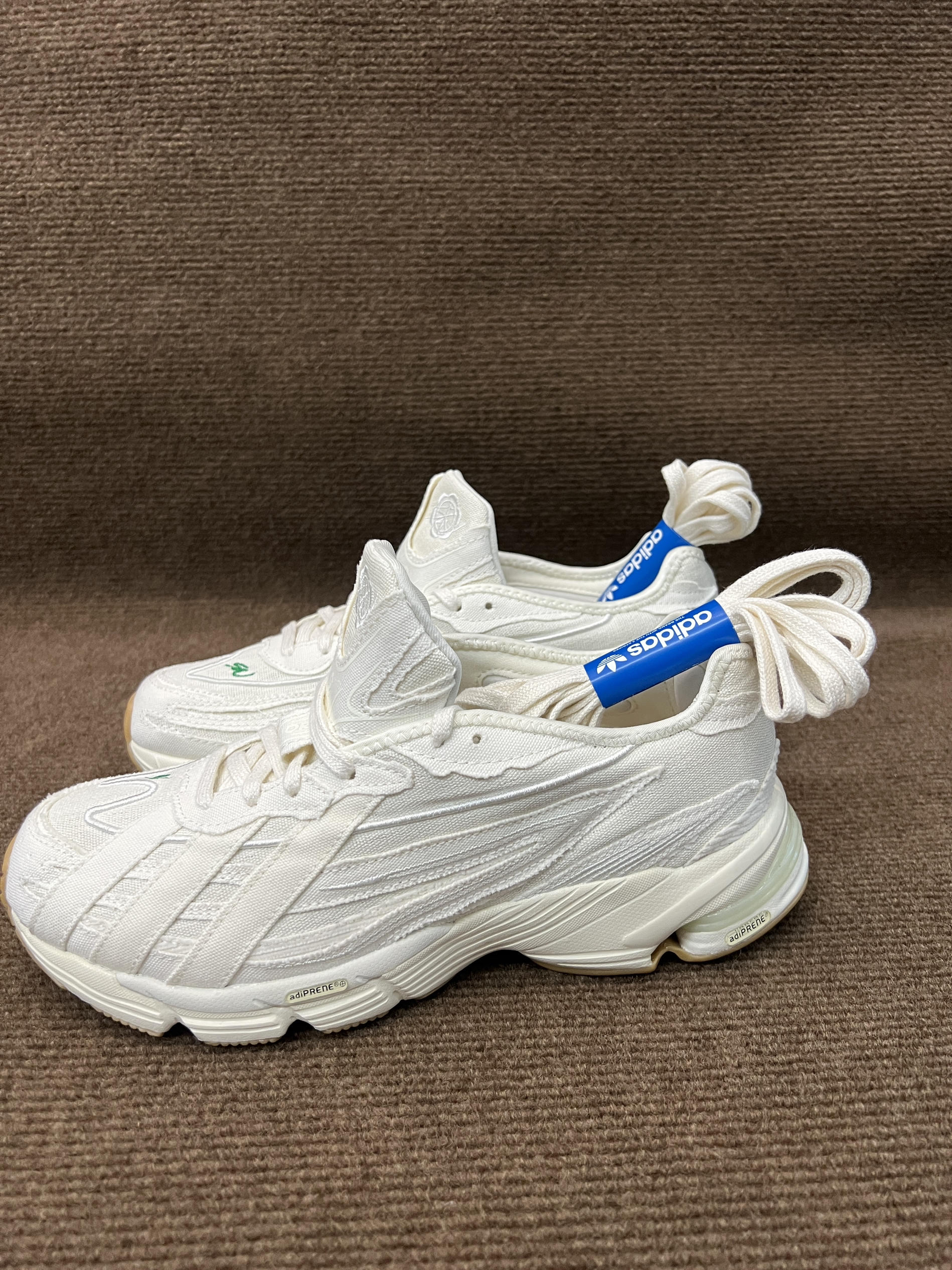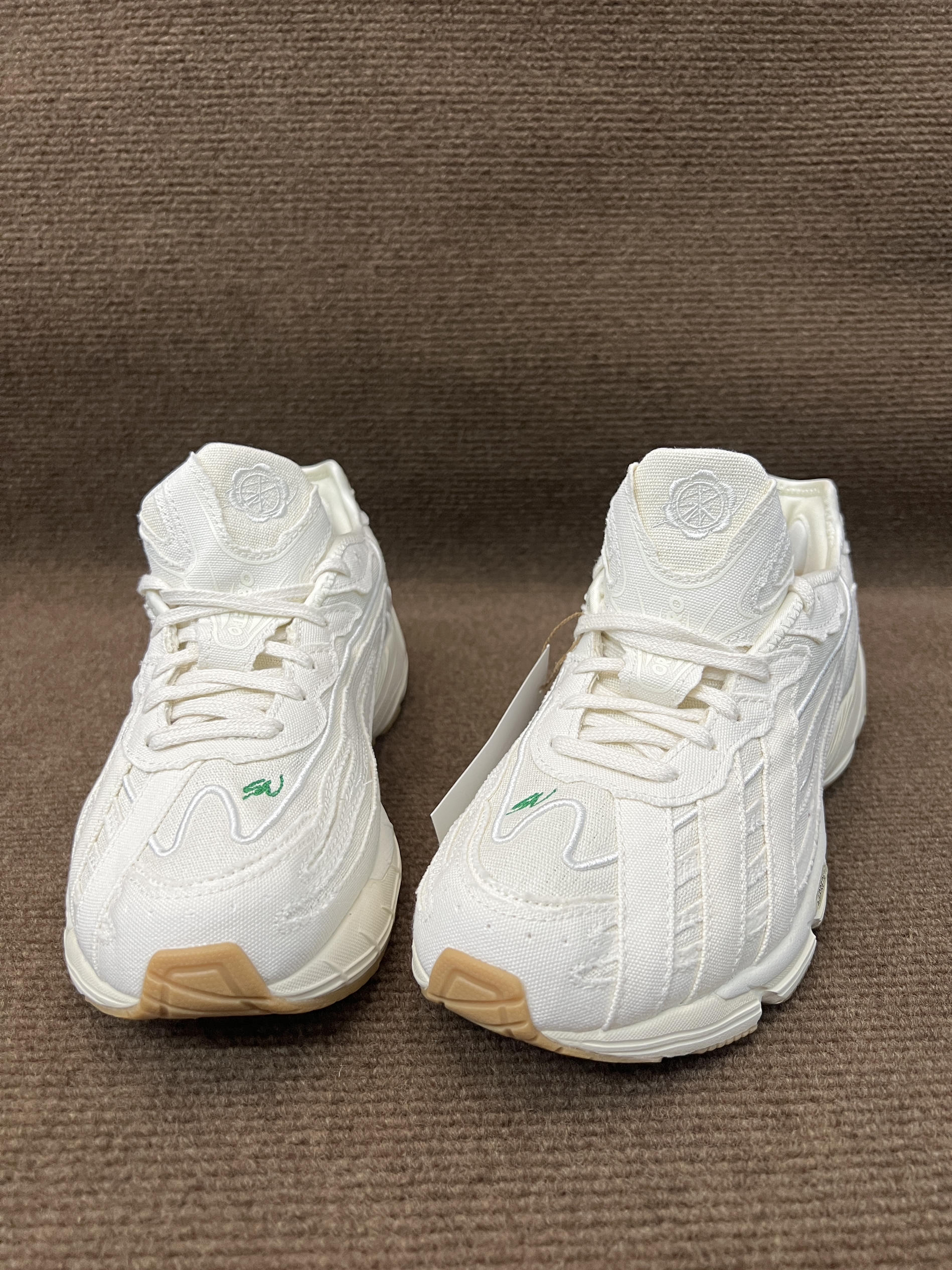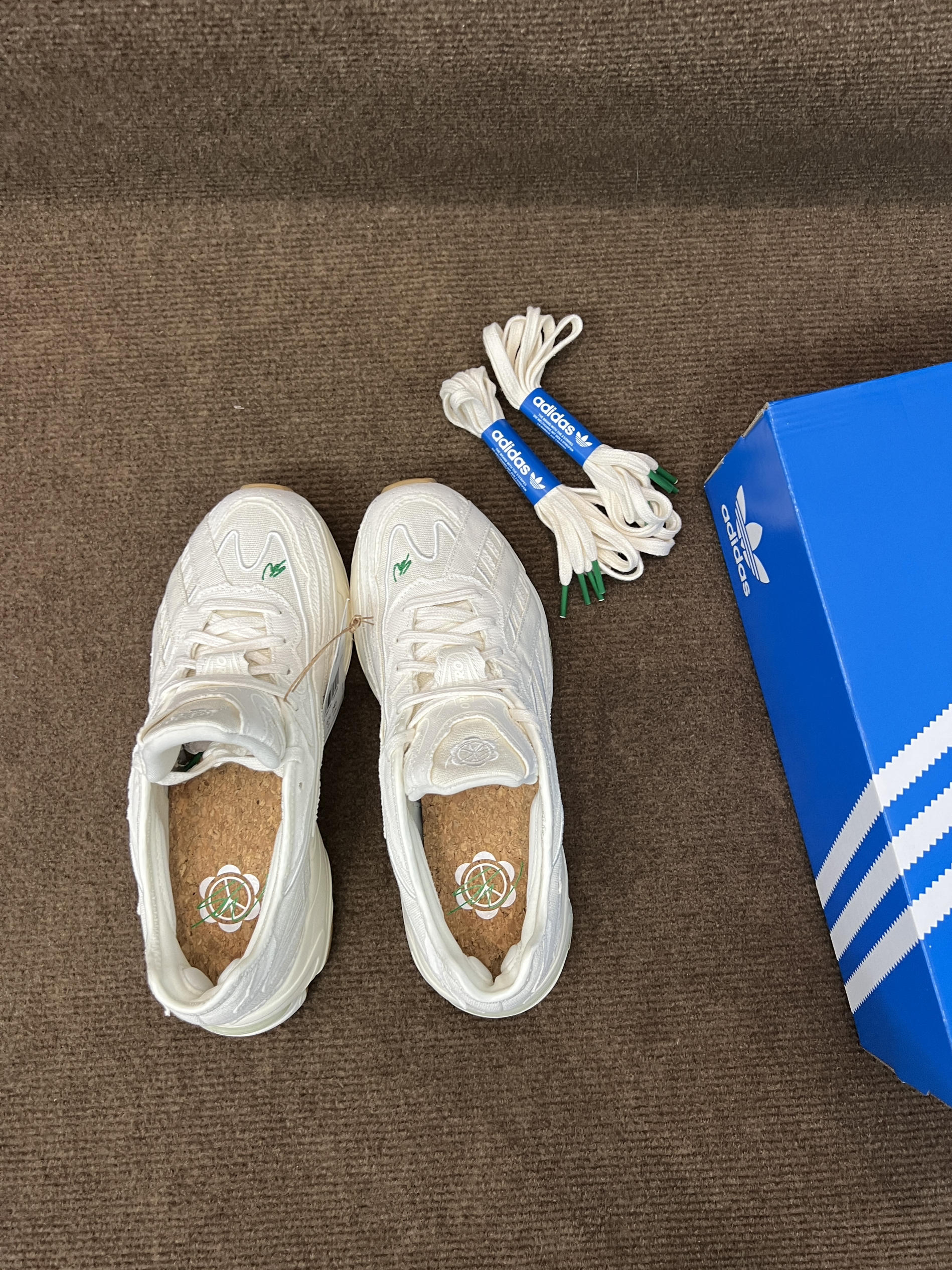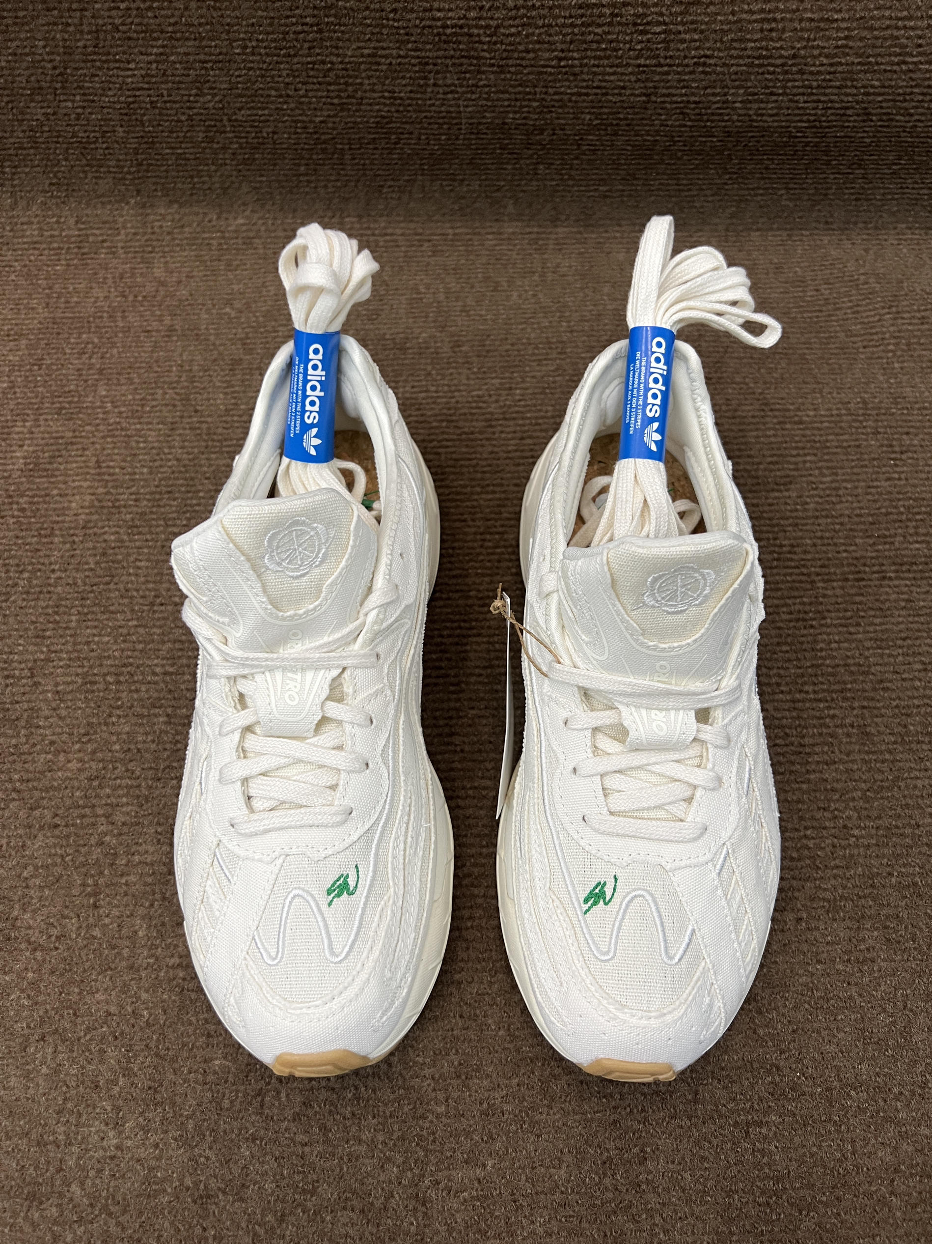 🤔🤔🤔这双是灯芯绒届的大师sean联名的跑鞋,上手感觉颜值还不错,要说很特别倒也说不上来 🍀🍀🍀配色方面全鞋身以白色为主,鞋面有sw的绿色刺绣作为点缀,也彰显联名。中底前侧为白色,后侧大部分为做旧米黄色,气垫部粉为透明浅绿色。大底为米棕色。配色清新百搭,复古风格 🍀🍀🍀材质方面鞋面以环保织物为主,并非网面,是那种棉麻布的感觉,很适合diy。上脚舒适透气可玩性高。脚感方面鞋底有adiprene的缓震...