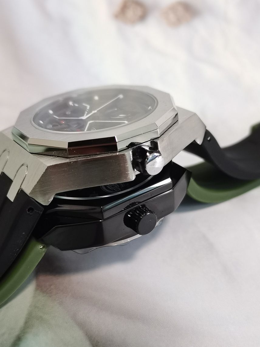 今天来看看这两个八角手表 绿色款的表盘是大表盘的设计 表盘内部的机械运转也是清晰可见 右侧的八角手表就比较小巧,平时男女都能戴的一款时尚手表 两款手表整体看起来都比较时尚有型 出街搭配也是不挑衣服的 你们更喜欢哪一款呢?