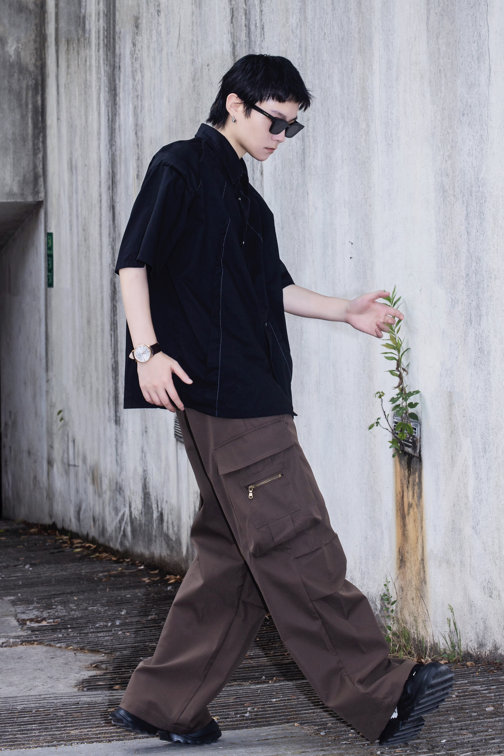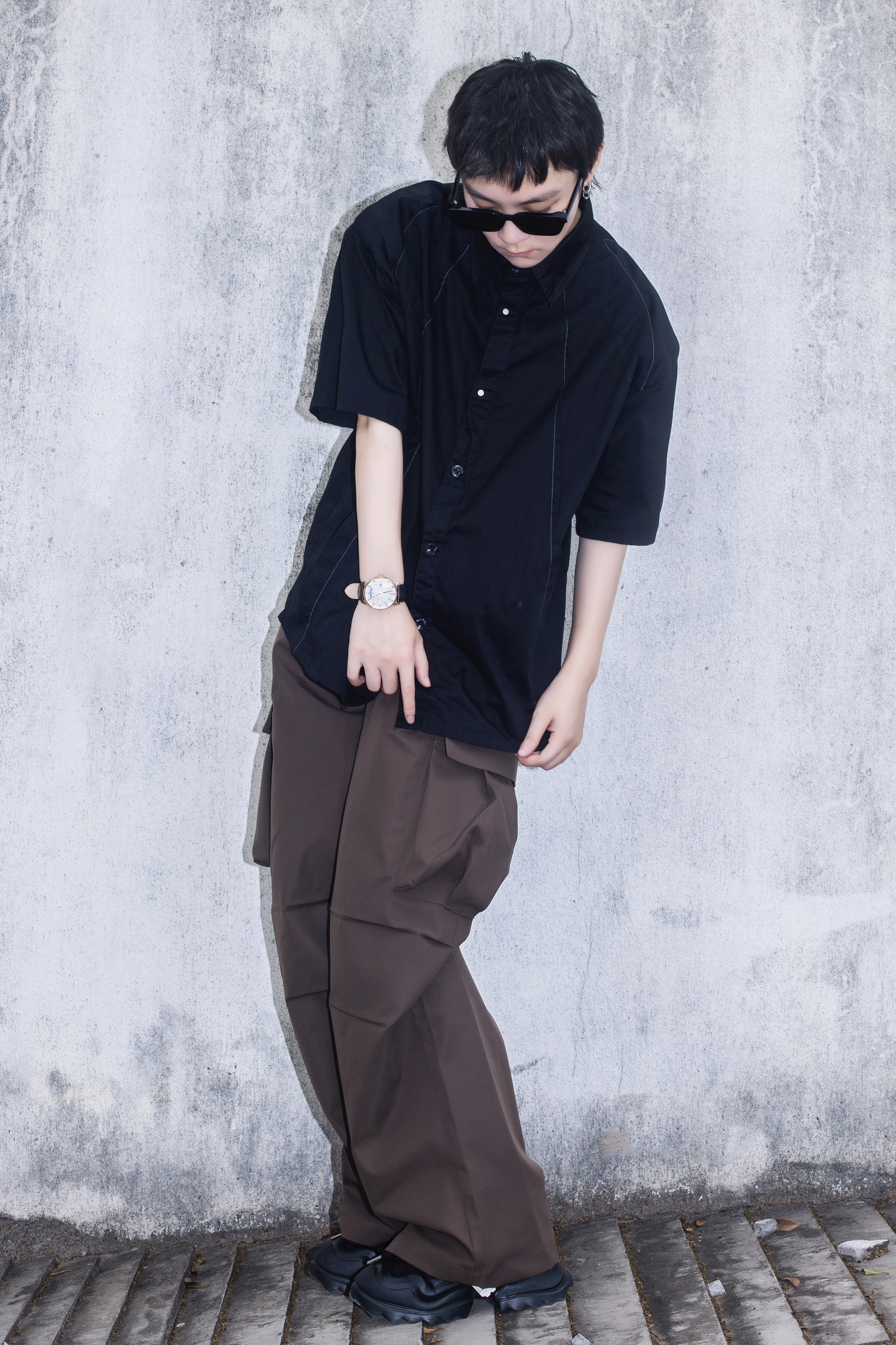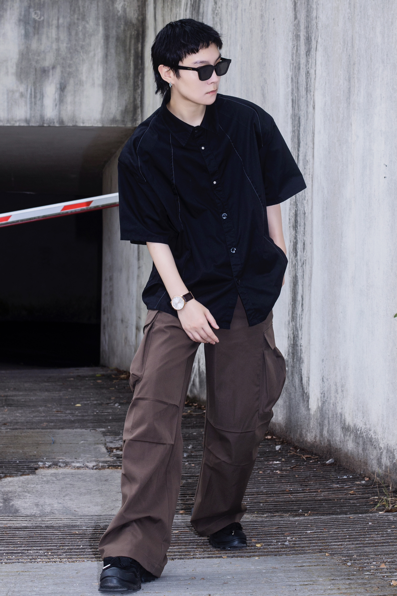 夏季穿搭也可以穿出高级感 今天分享一套cozyfit穿搭 穿搭指南: 上身一件黑色短袖衬衫 廓形的垫肩设计自带高级感 下身搭配一条棕色阔腿工装裤 带点拖地的感觉是ins博主的最爱 黑色厚底老爹鞋和上衣首尾呼应 穿搭细节还得靠配饰 今日搭配天珺的机械表 皮质表带和简约的圆形表盘很显气质 整体简单的搭配就把高级感拿捏了