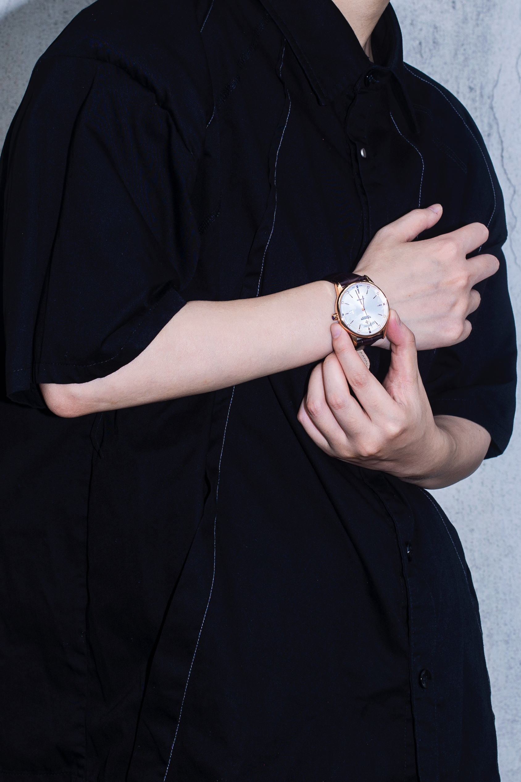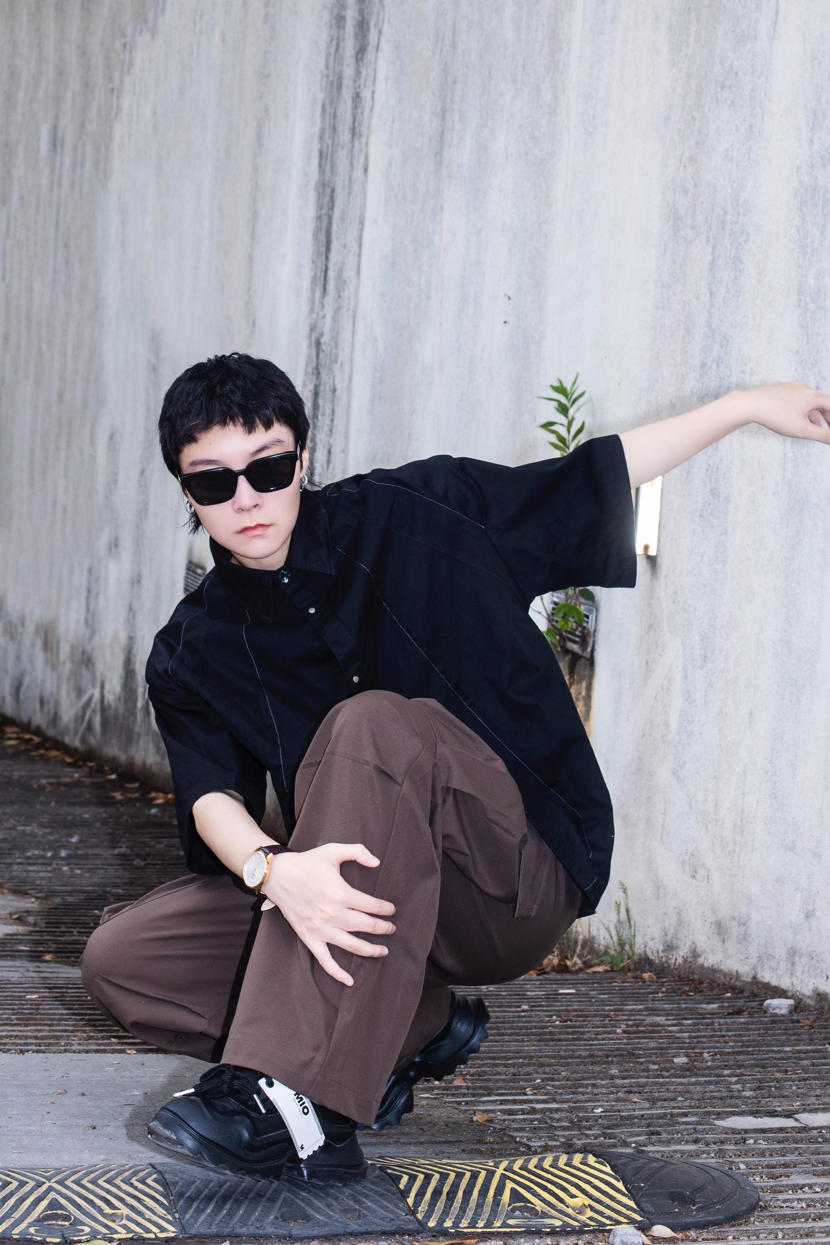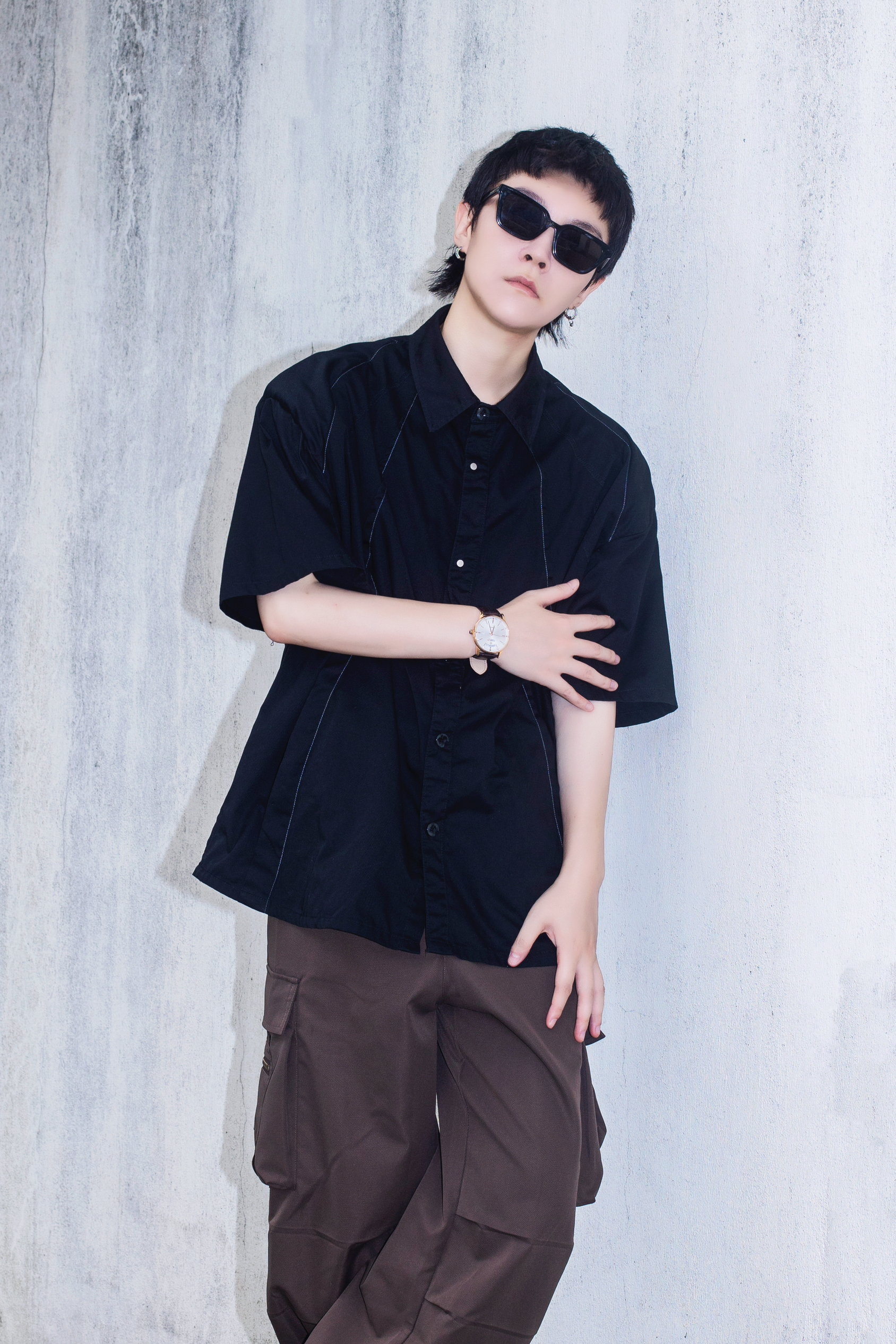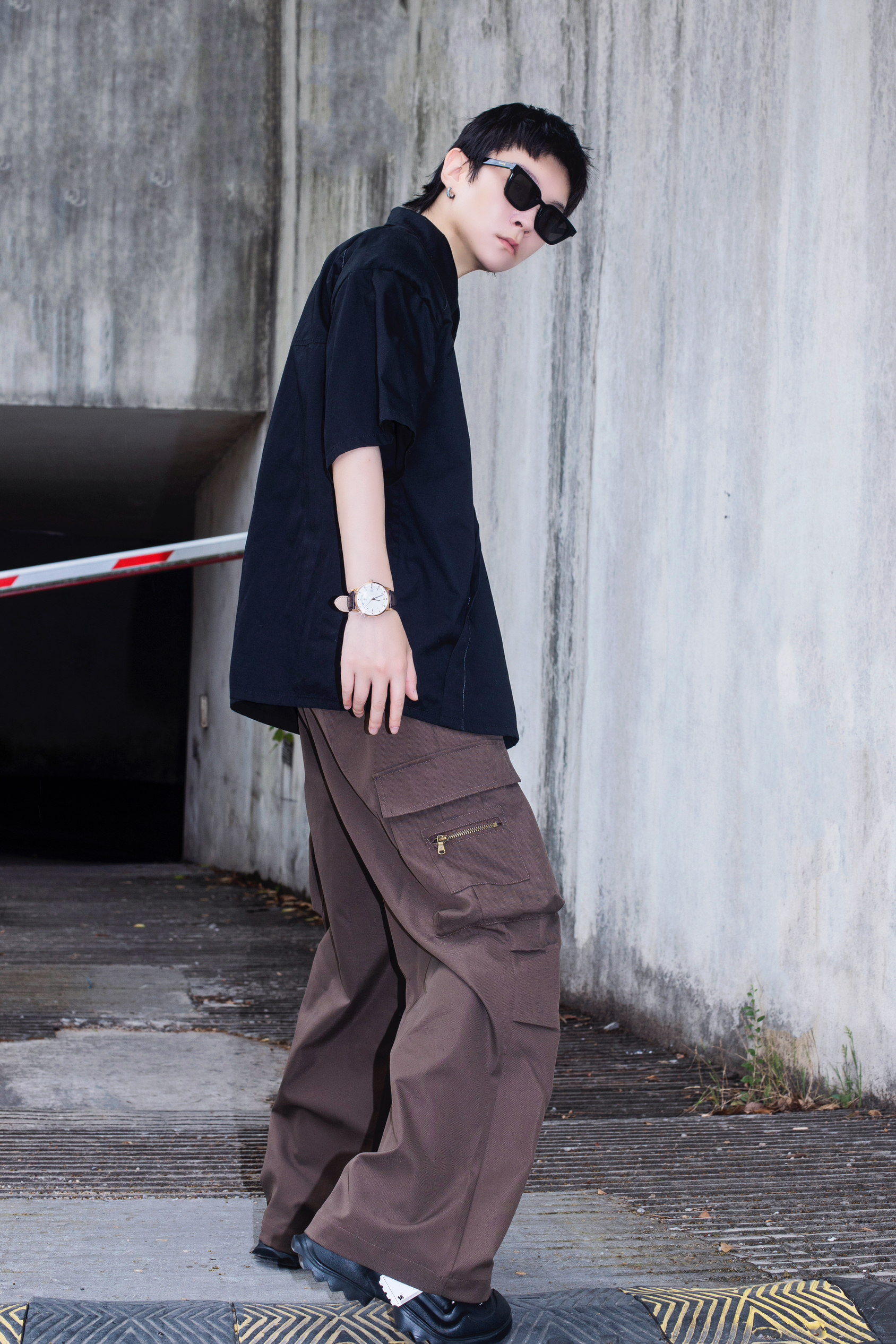 夏季穿搭也可以穿出高级感 今天分享一套cozyfit穿搭 穿搭指南: 上身一件黑色短袖衬衫 廓形的垫肩设计自带高级感 下身搭配一条棕色阔腿工装裤 带点拖地的感觉是ins博主的最爱 黑色厚底老爹鞋和上衣首尾呼应 穿搭细节还得靠配饰 今日搭配天珺的机械表 皮质表带和简约的圆形表盘很显气质 整体简单的搭配就把高级感拿捏了
