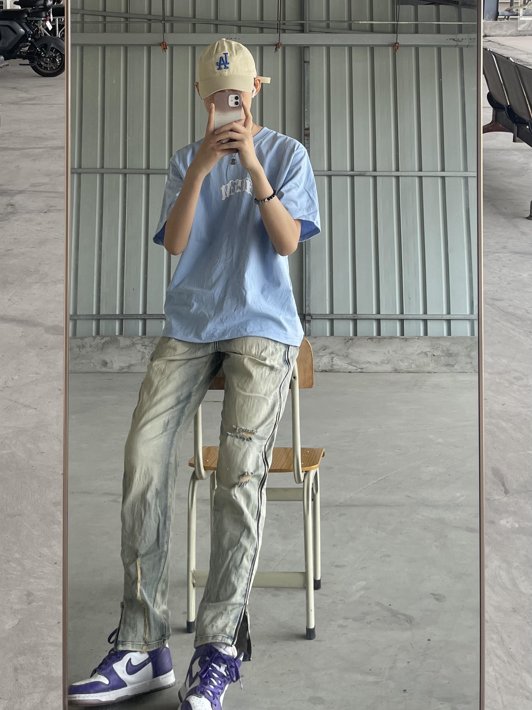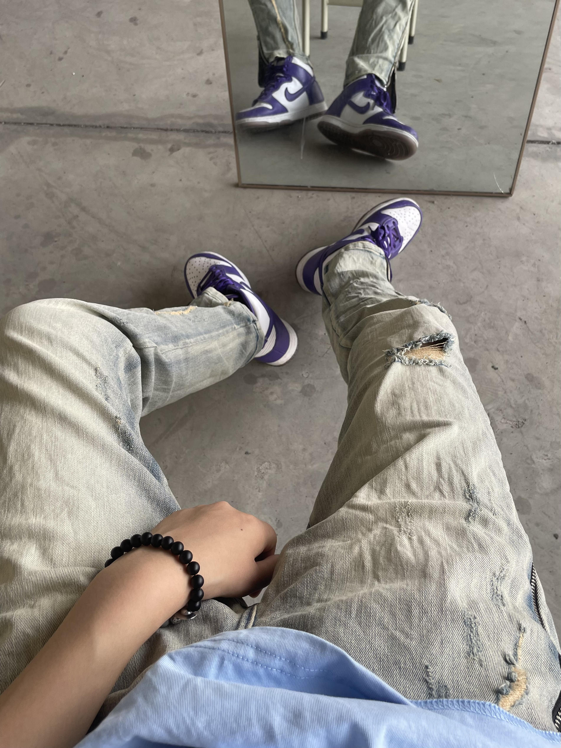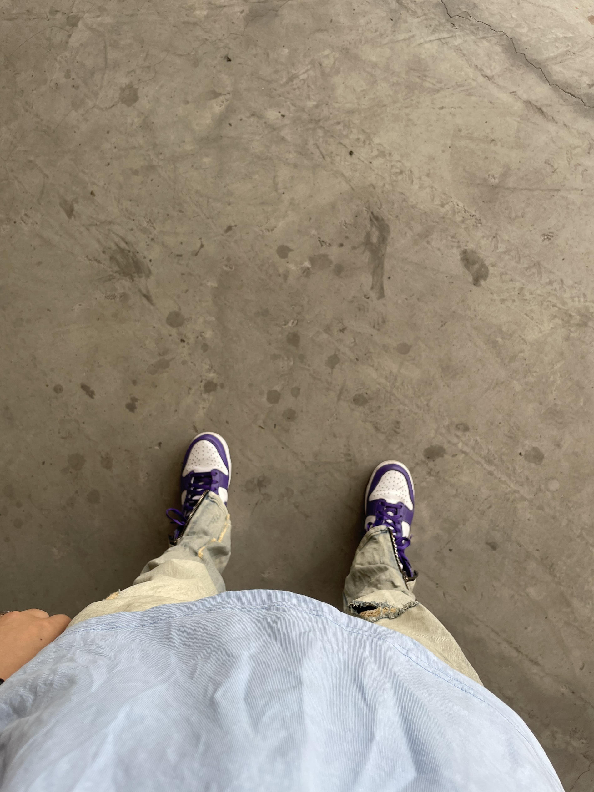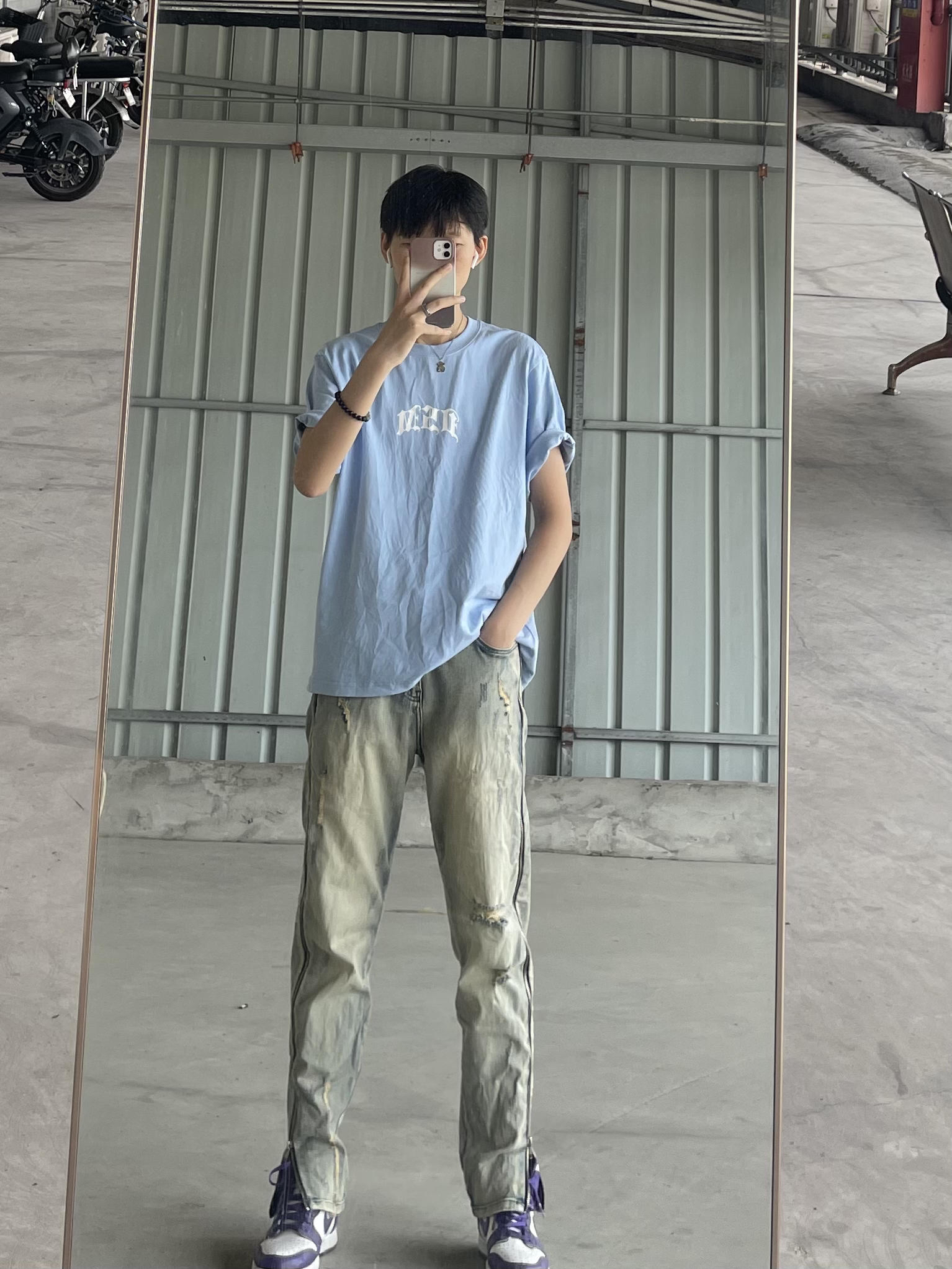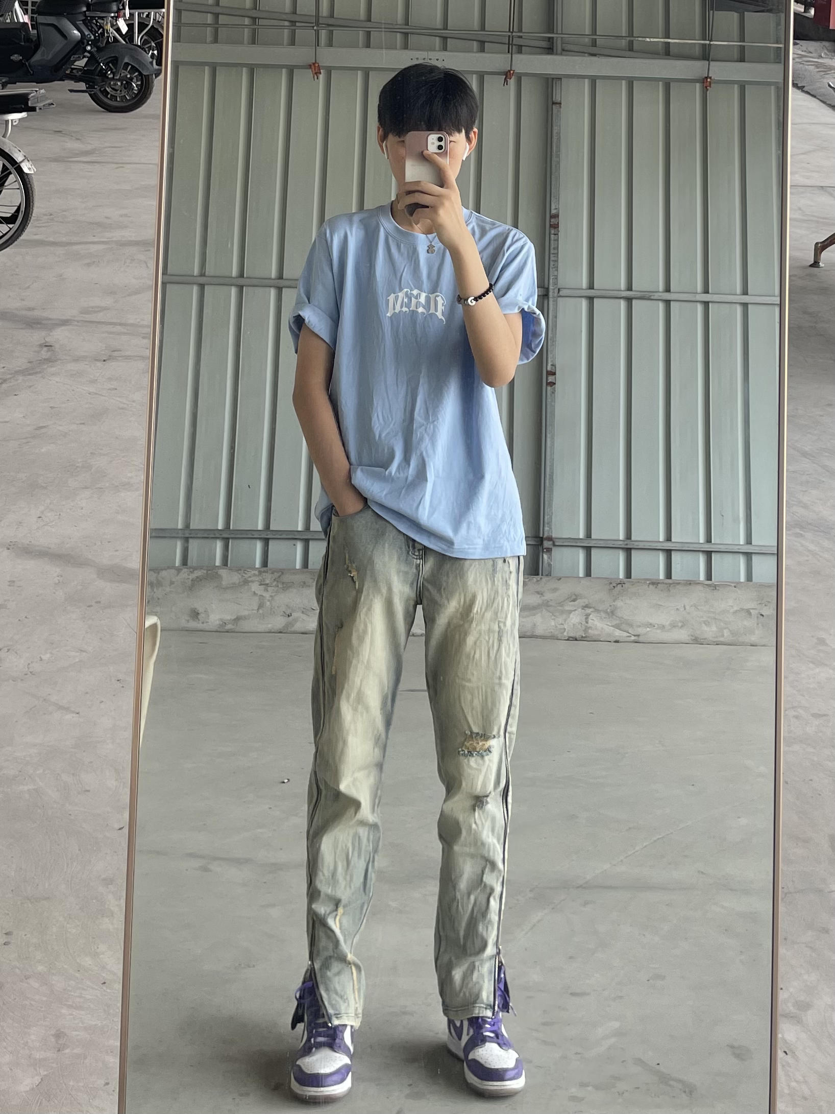 身高|体重:171CM/105斤 🧍♂️ 穿搭风格:随意穿搭啦 谢谢大家喜欢 👔 上衣:DONSMOKE美式街头嘻哈哥特字体小LOGO百搭潮短袖T S码 👖 下装:XINYINSU新因素朱志鑫侧边拉链牛仔裤破洞水洗做旧复古高街弹力潮M码 👟 鞋子:Nike dunk high白紫色