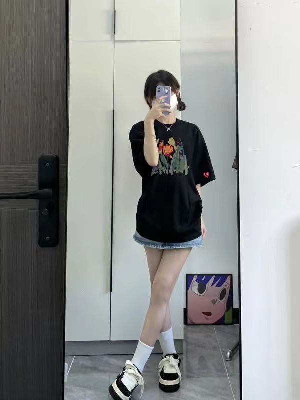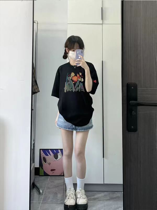 花花图案的短袖T恤上身真的又甜又嫩,也很适合夏天,黑色又有一点甜酷的感觉~