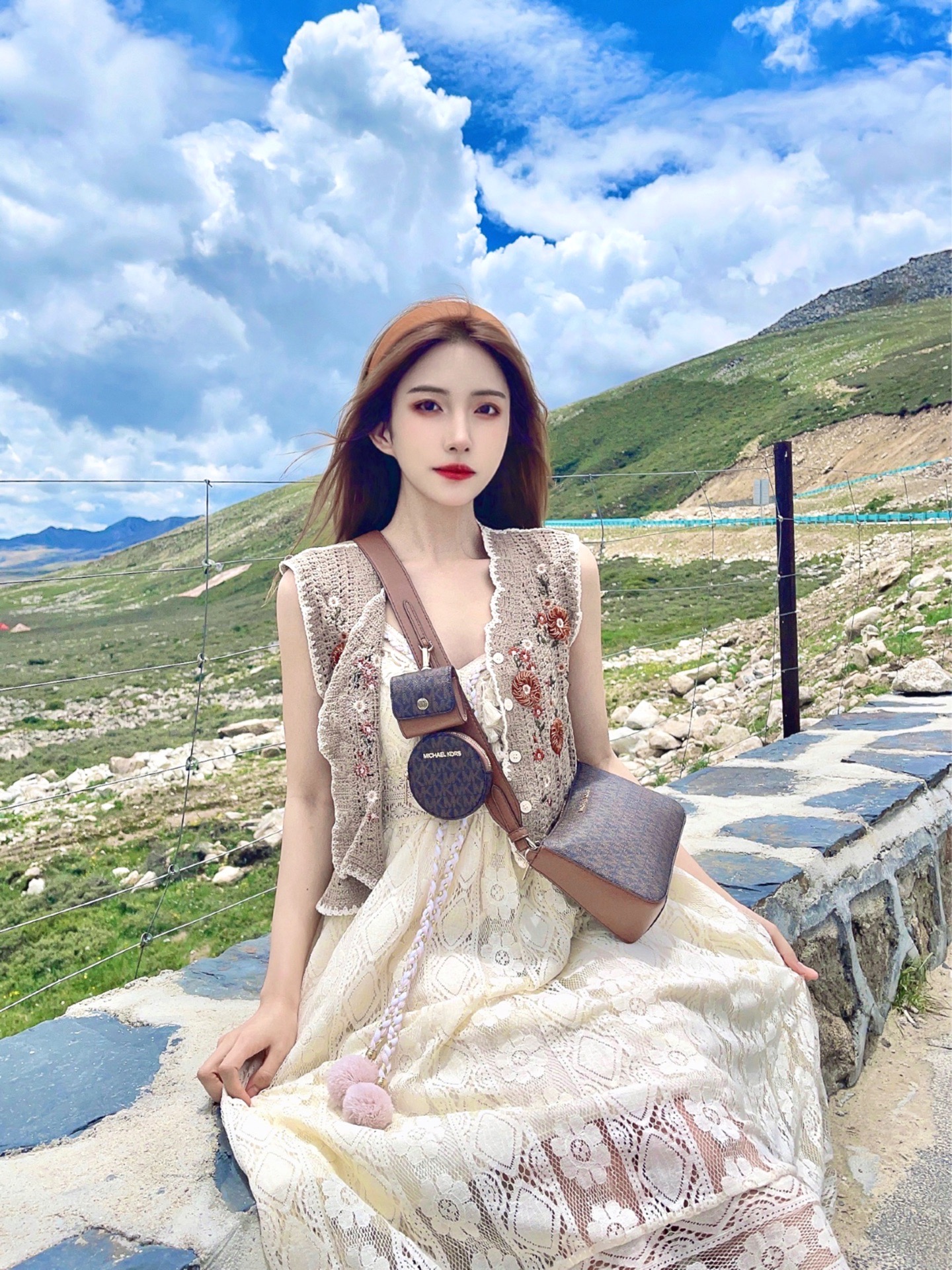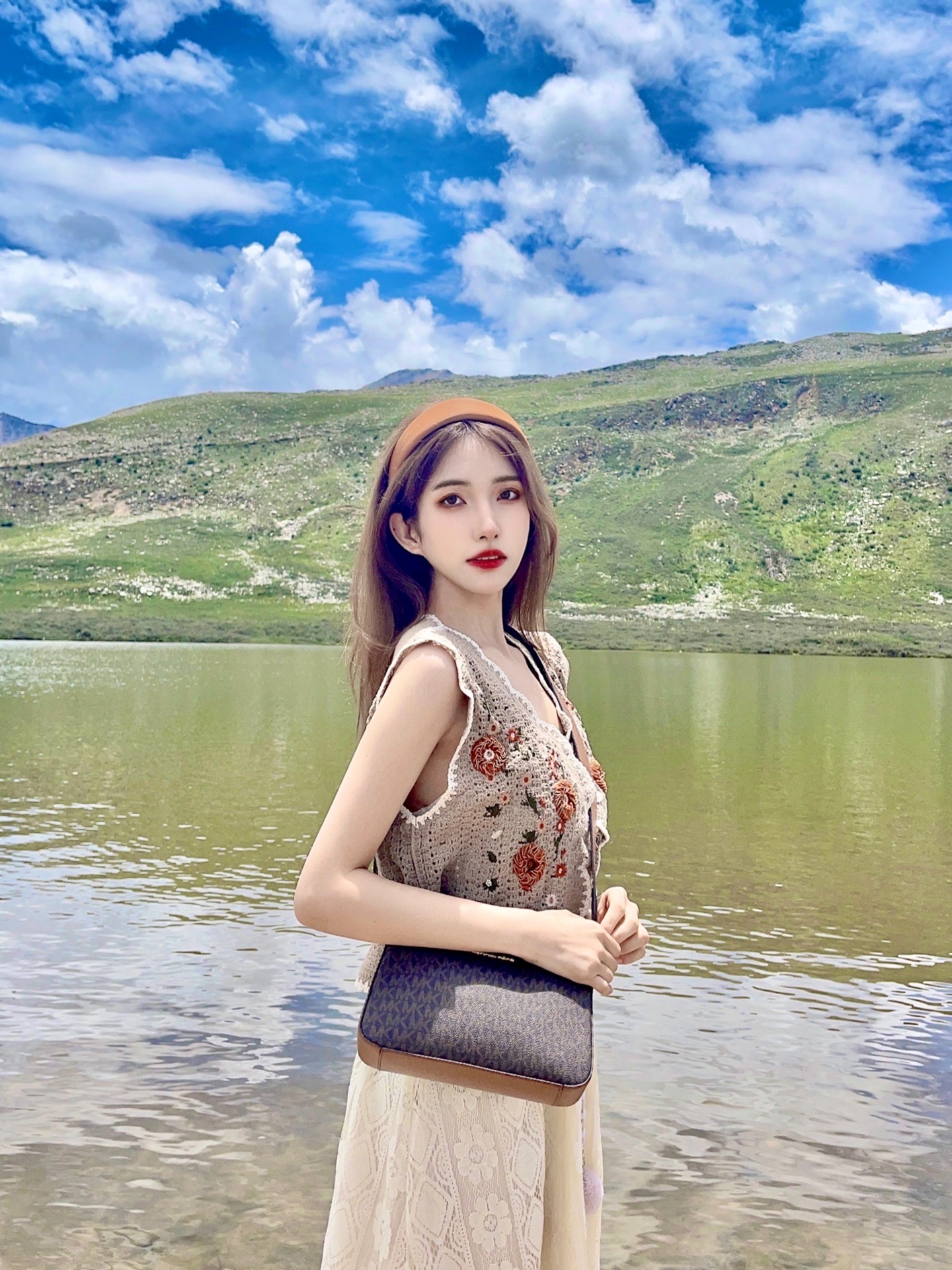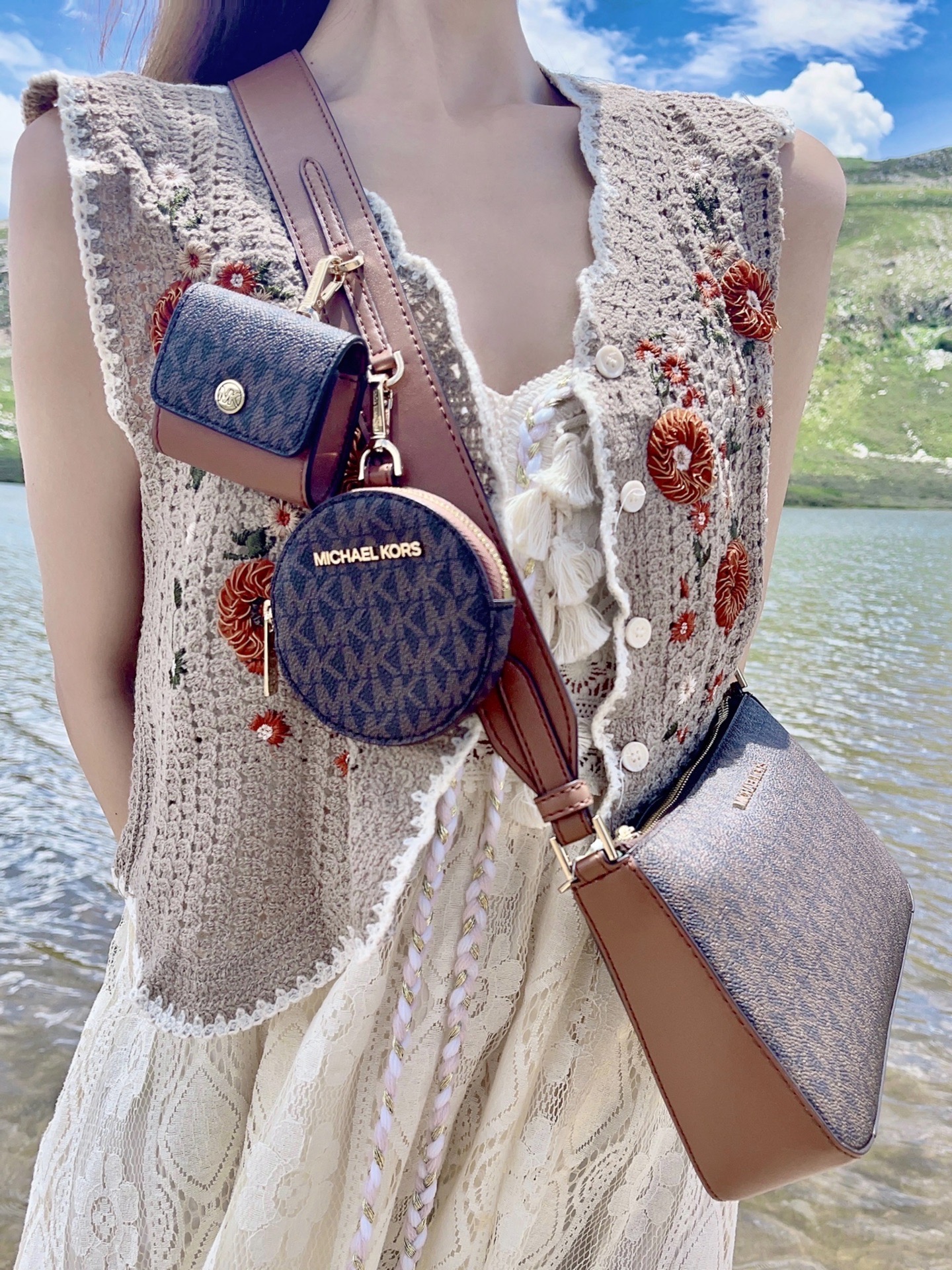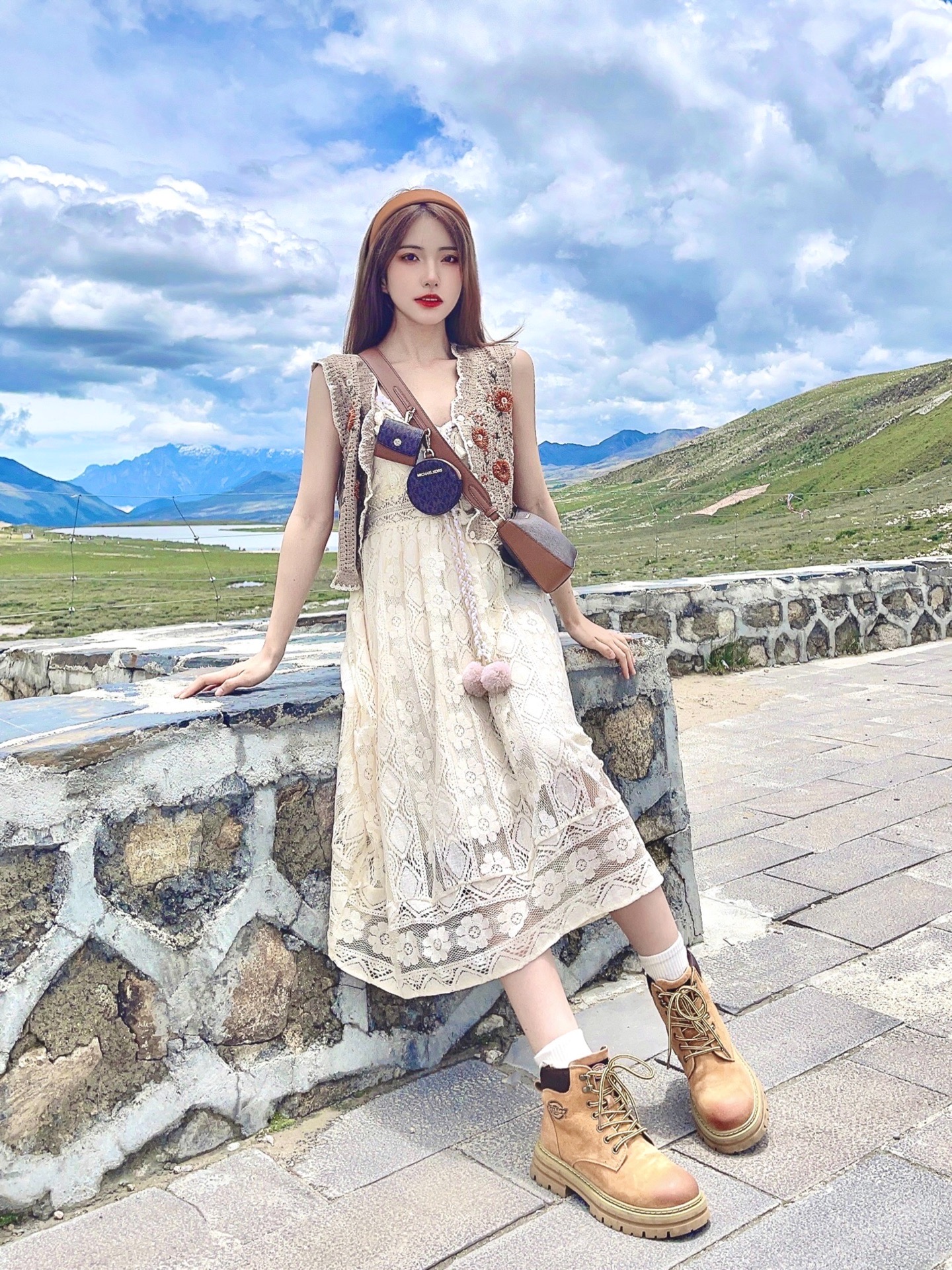总要去趟川西感受一下大自然的魅力叭! 来到了传说中风景绝美的红海子 果不其然 清澈的湖面、湛蓝的天空、远方的雪山🏔️ 拍照嘎嘎出片 风景自带滤镜 上身一套蕾丝吊带裙➕钩花针织马甲背心 搭配马丁靴有民族风那味儿啦! 选择了MICHAEL KORS 三合一老花包 复古感的棕色调➕满印老花设计满满高级感 包包的容量很大,很适合出去玩 可斜挎可单肩,我最爱的旅游搭子 肩带上的小包包可爱又实用 很适合放一些...