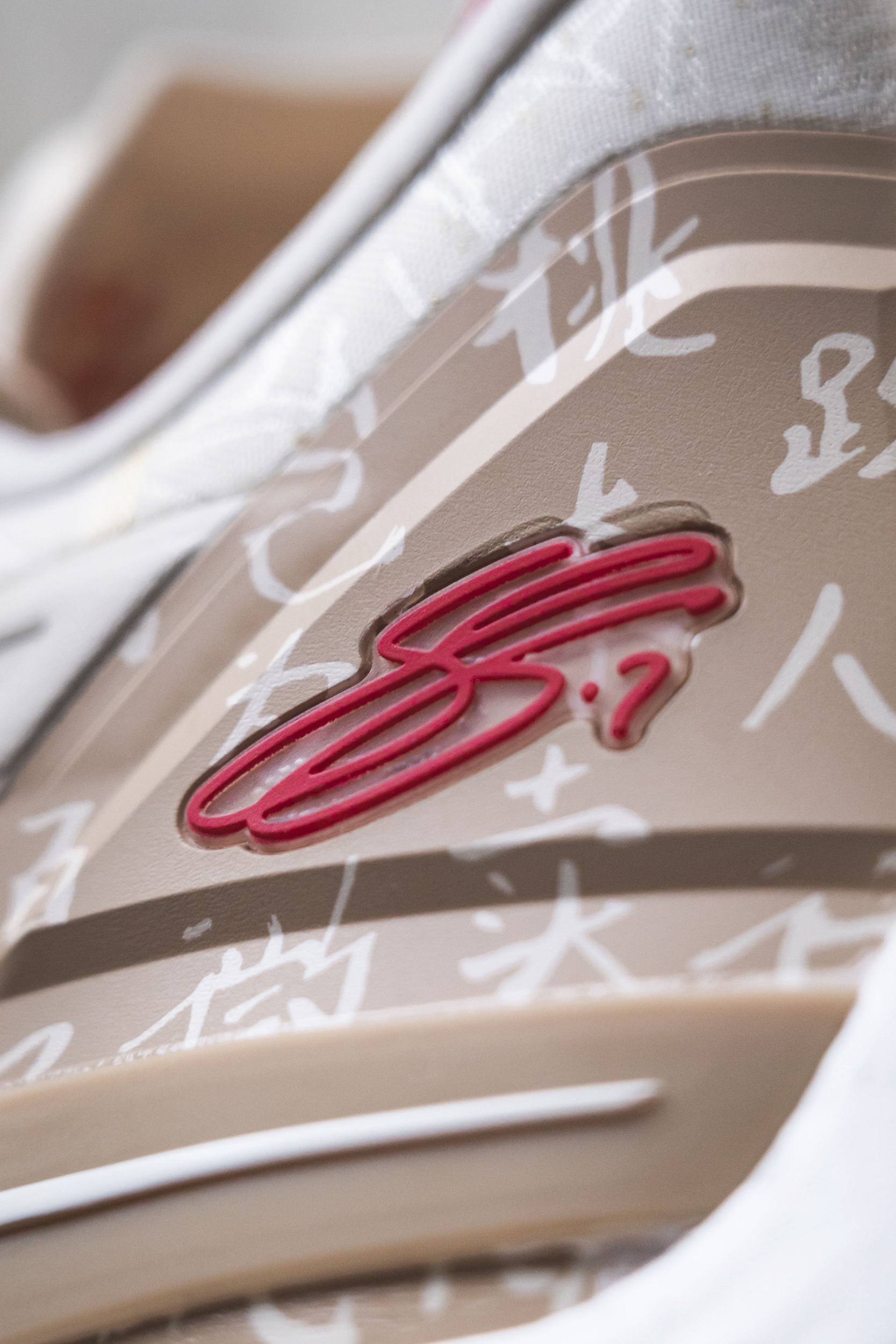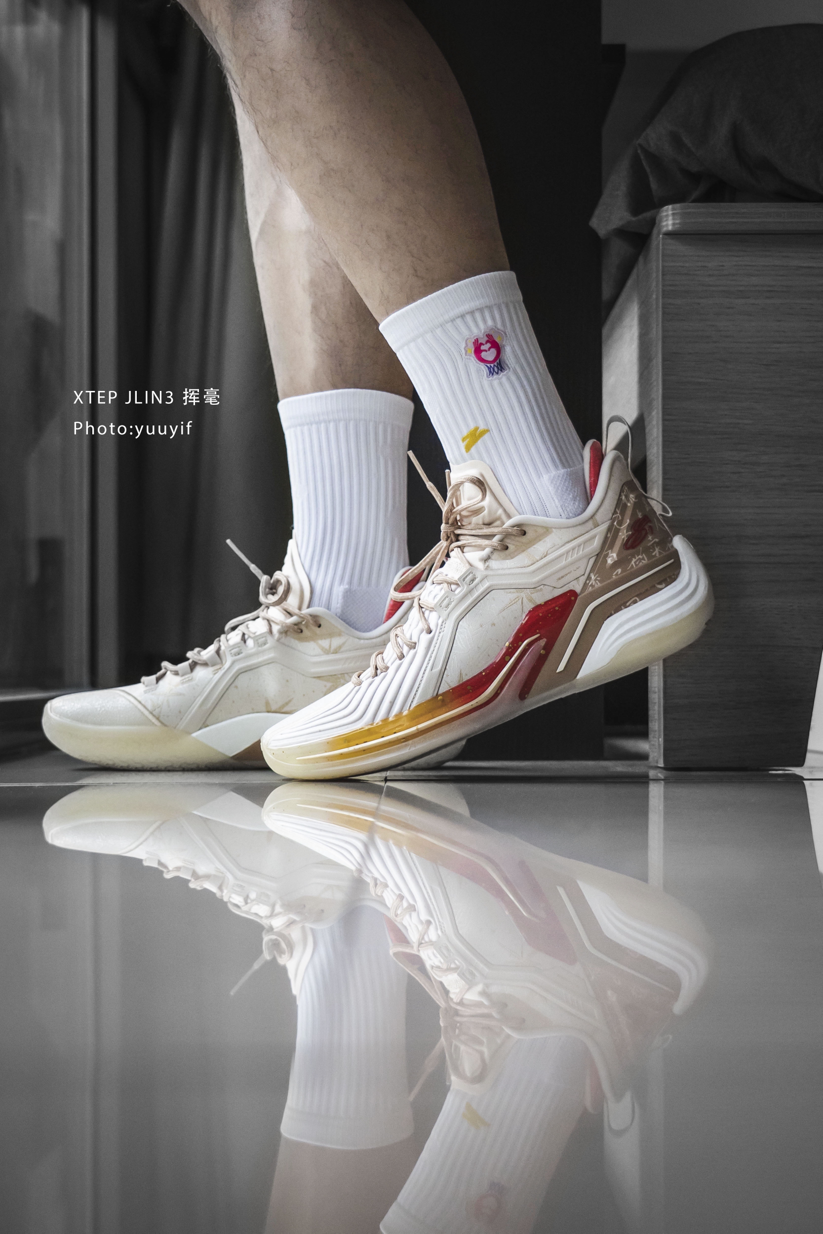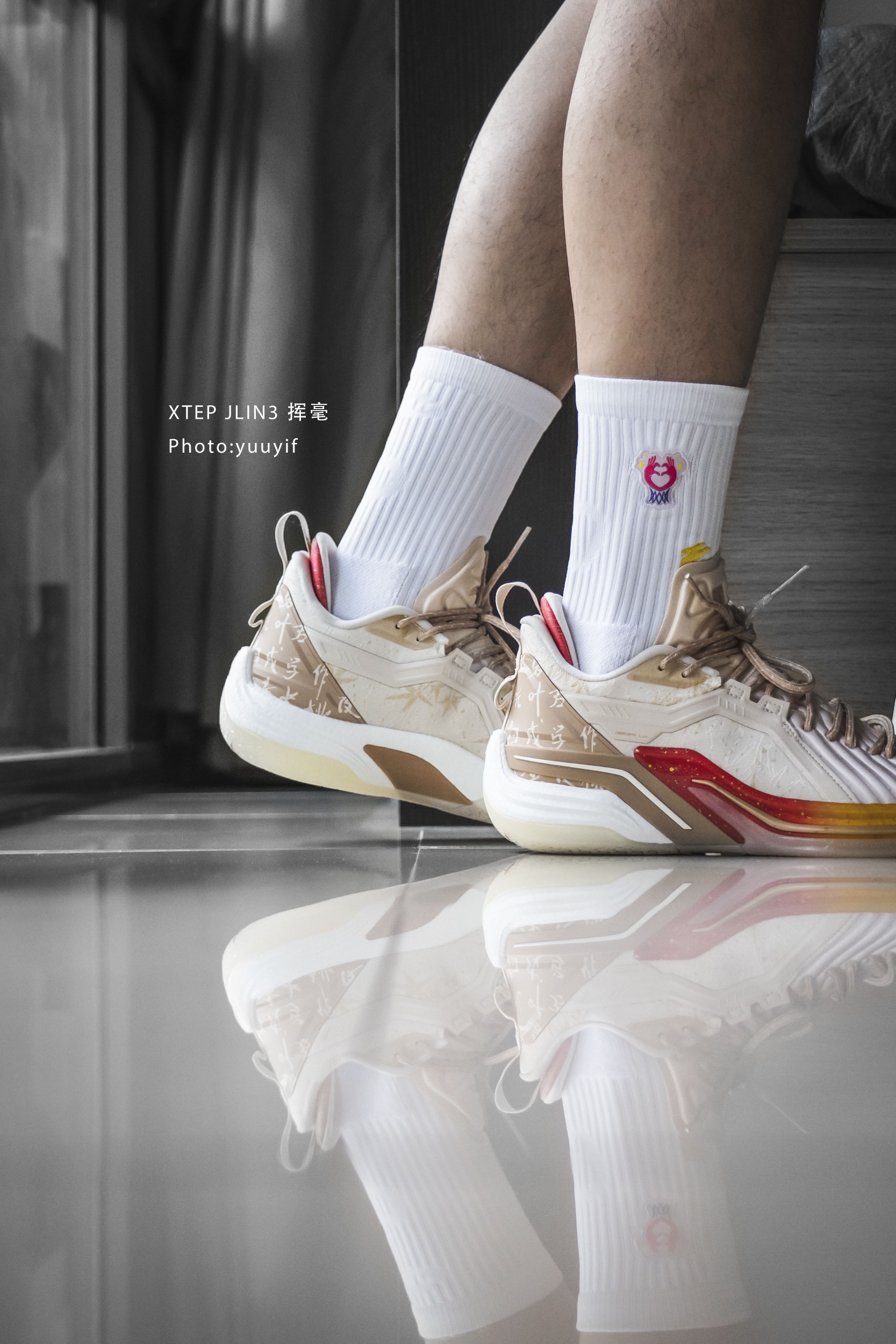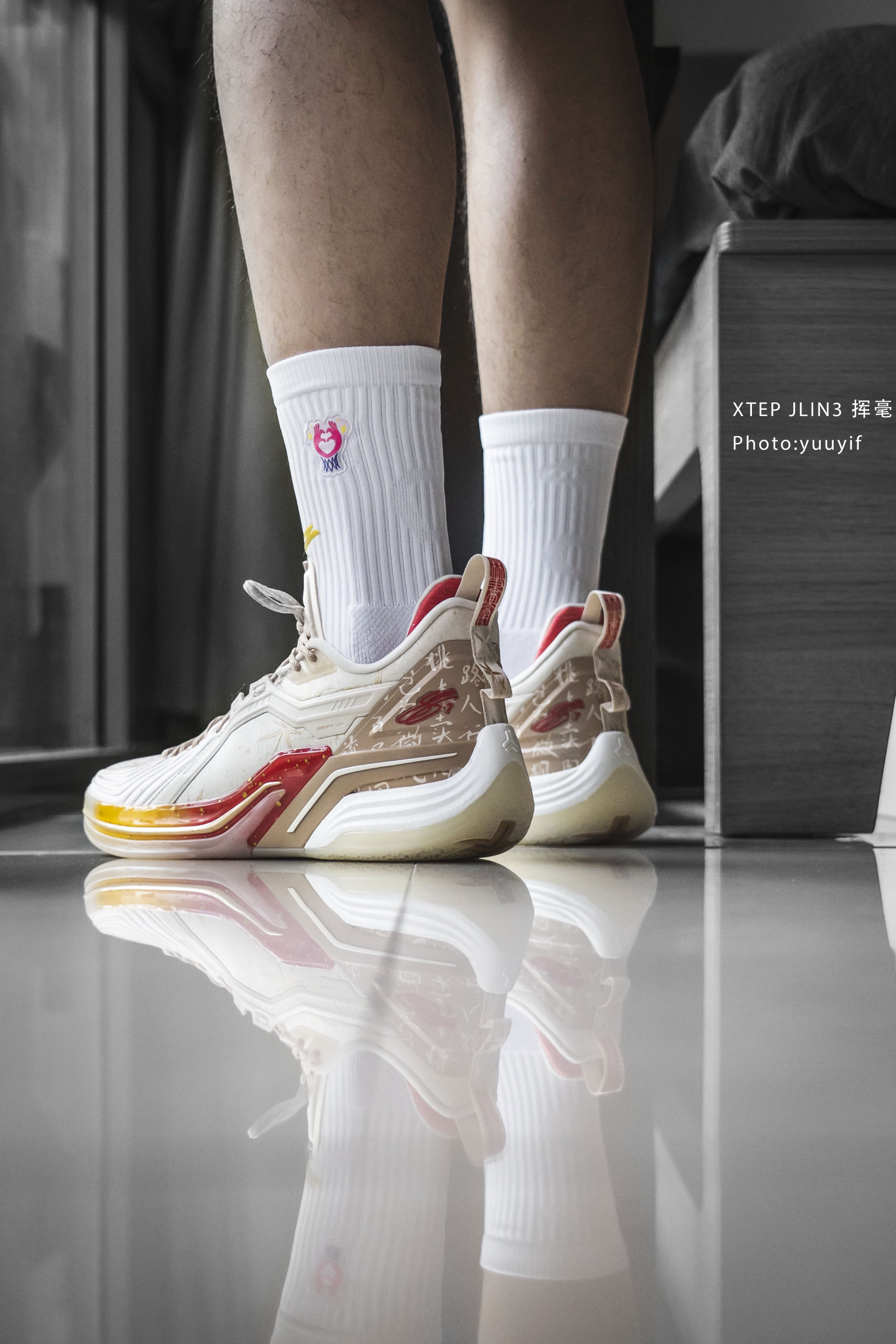 在不久前结束的林书豪中国行长沙站,我有幸在现场听书豪亲自讲述了关于这双JLIN3「挥毫」配色的创作故事,鞋面的颜色是以宣纸为灵感打造,侧面加入竹子暗纹填充细节,最醒目的是后跟部分的书法字体,国风的韵味跃然眼前。 就像书豪在现场的表述一样,他在参与设计的过程中,非常注重鞋子的保护性,因此在JLIN3上,我们看到了碳板搭配超大面积的TPU侧面支撑,鞋子整体的稳定性和刚性很强,搭配特步当家科技特爆回弹...