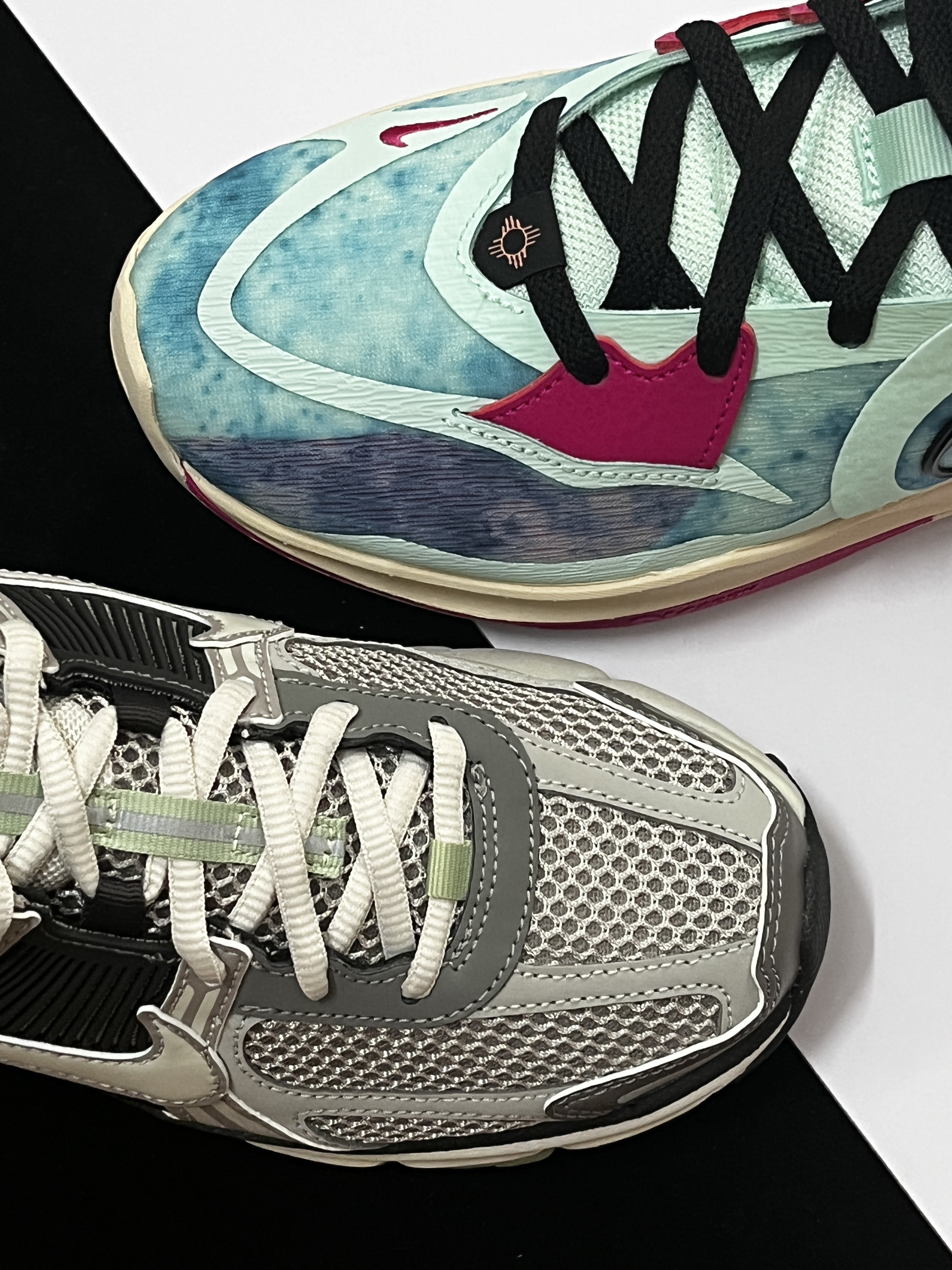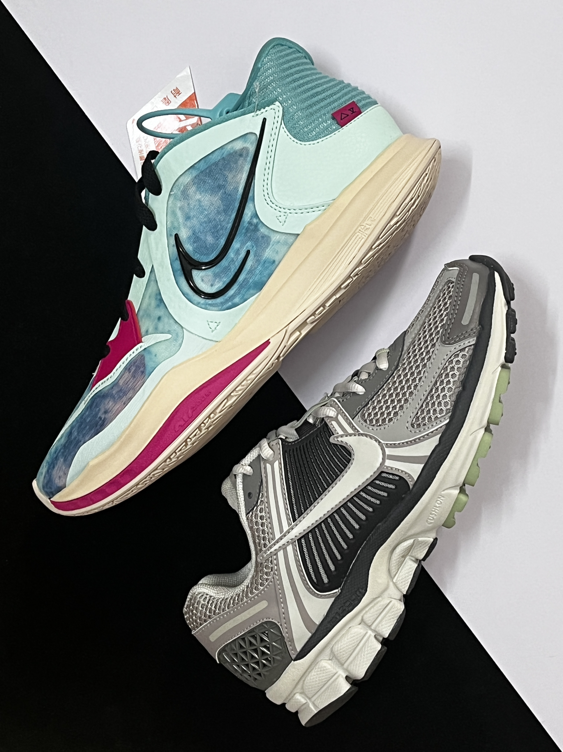 🔹今天德鲁大叔为大家分享的是欧文5low和vomero5这两款颜值很高的宝藏鞋! 🔹先说一下这一双欧文5low,它是nike欧文系列中的支线篮球鞋,有着不错的实战性能,并且是xdr橡胶底,夏天完全可以穿去室外水泥地实战,扎染配色的颜值很高! 🔹而vomero5是今年很热门的复古跑步鞋,这种灰黑配色搭配一点点浅绿色,很有复古的感觉,脚感方面挺舒适的,作为跑步鞋或者通勤鞋都很ok。