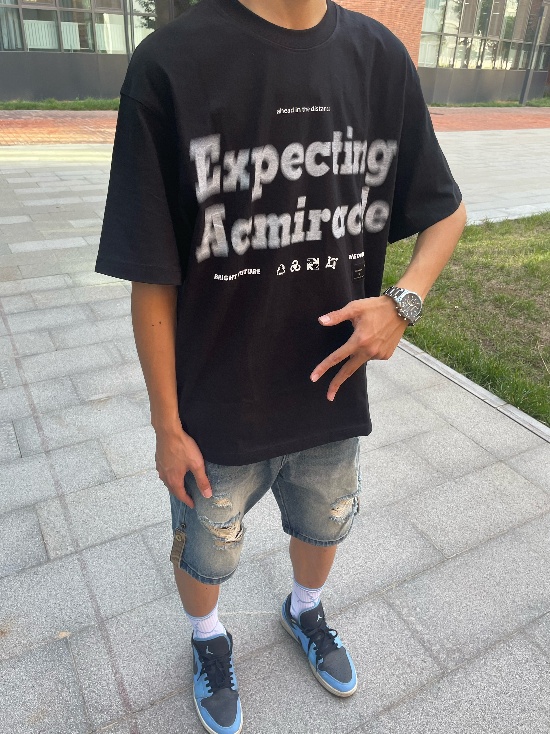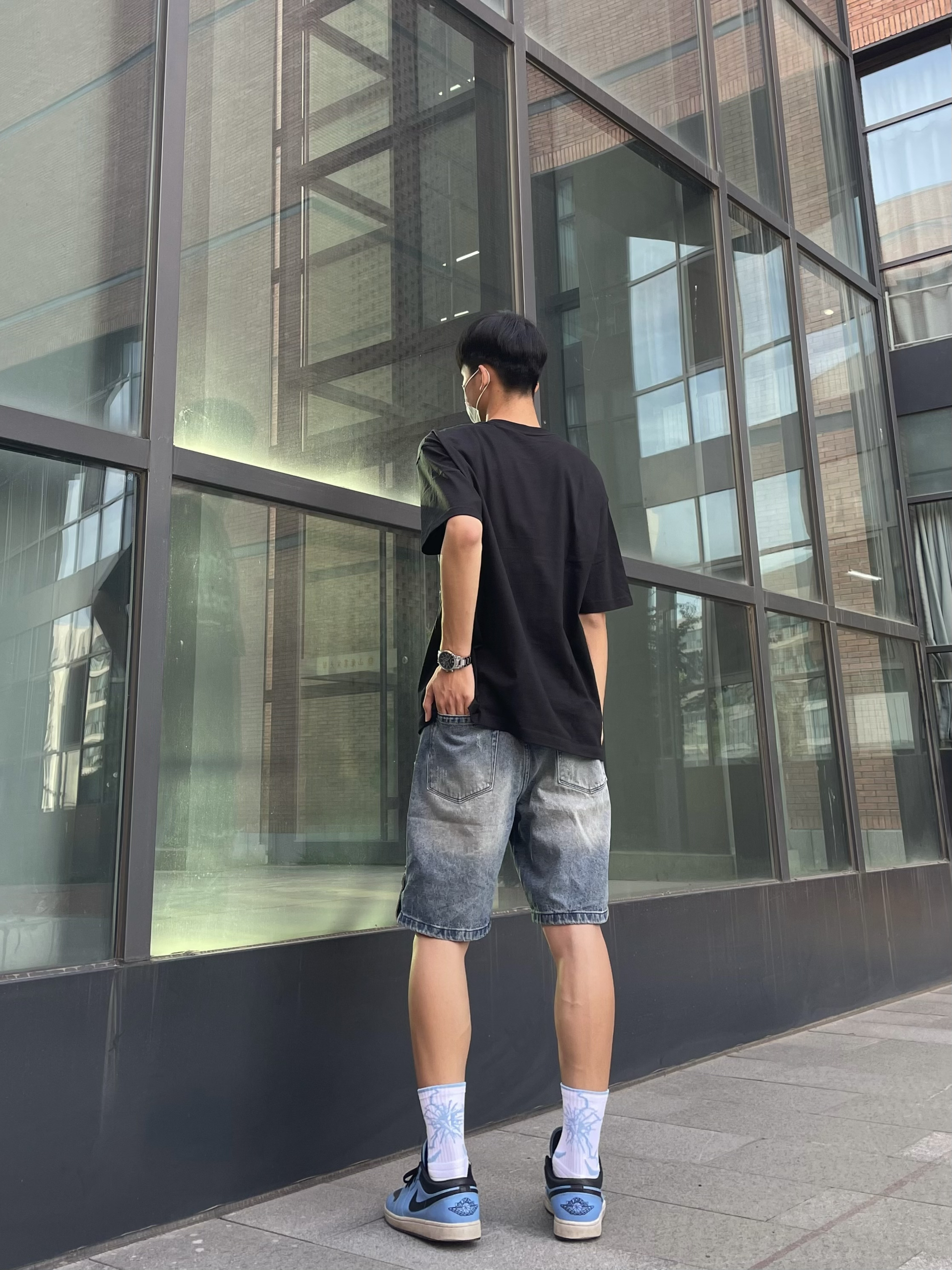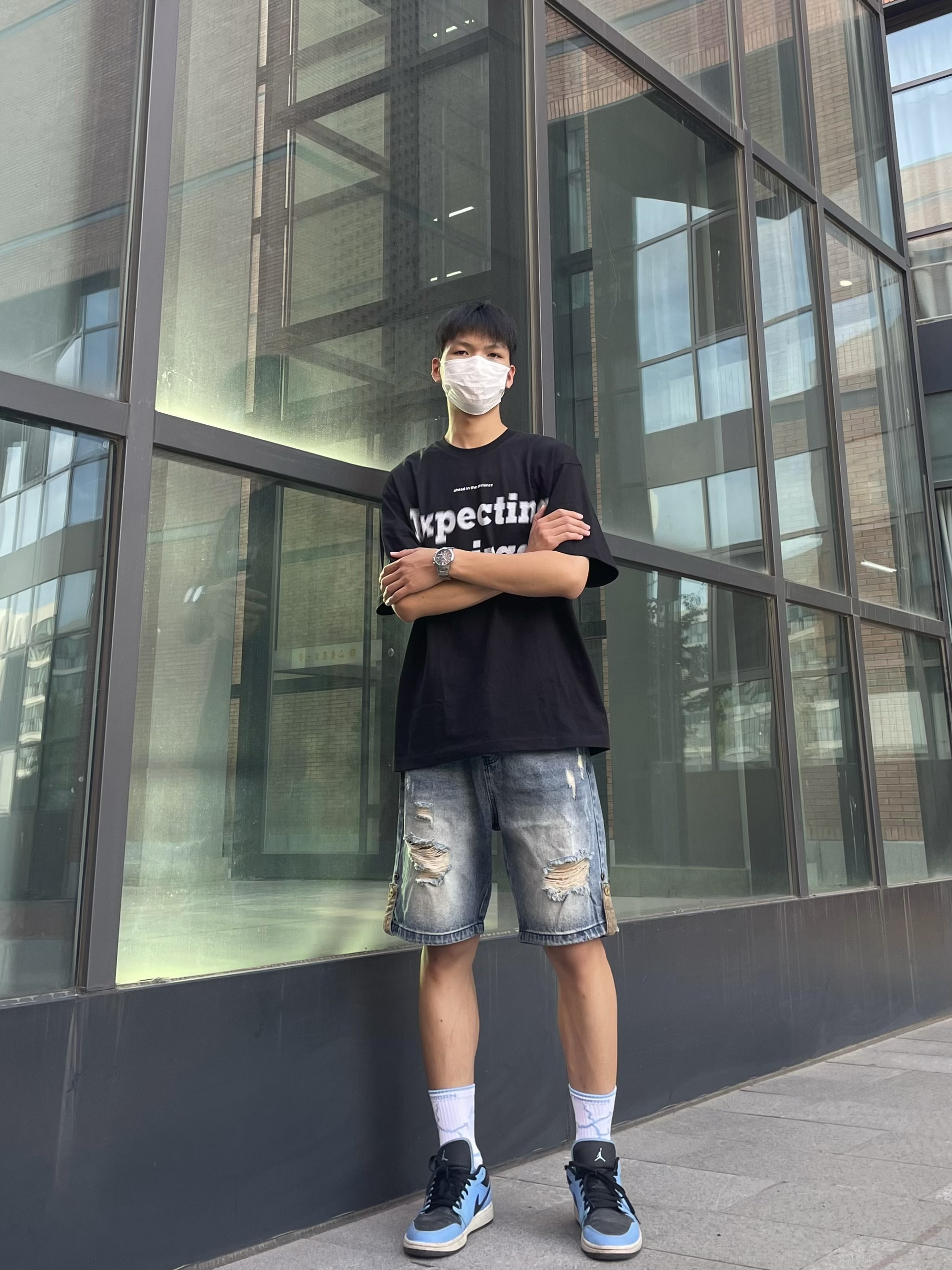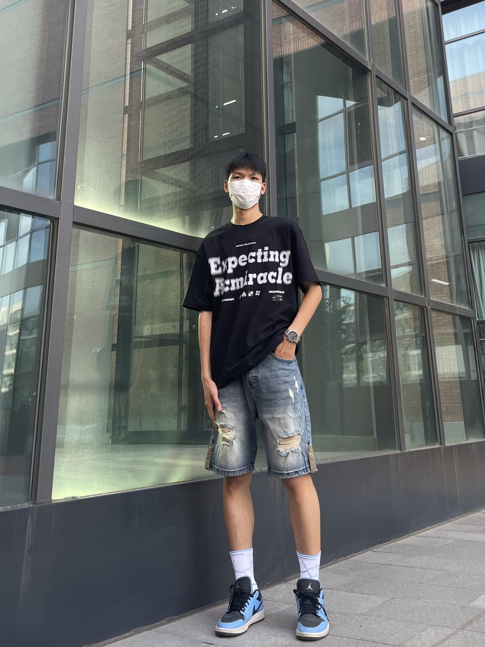 好看的黑色短袖+潮流的蓝色破洞牛仔裤+银色高颜值手表+蓝色aj1,夏天这样穿就很有氛围感