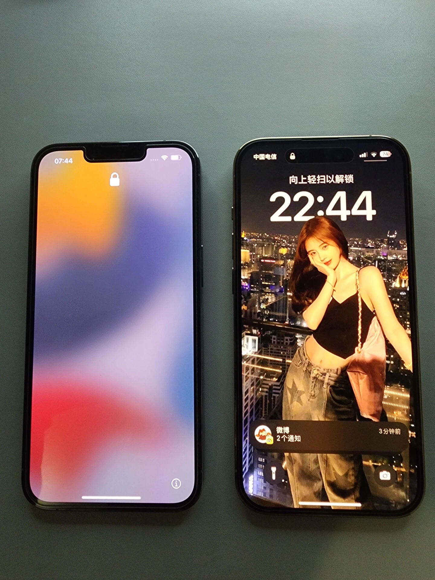 拿来两台做一下对比,先来看背面,可以看到14的摄像头是要比13的摄像头大一点的,但是单独拿在手里看是很难分出哪个是14的,另外可以看闪光灯,14pro的闪光灯是可以变焦的,暖黄的颜色,而13的闪光灯是亮白色,这一点是很好区分的 14pro新增了灵动岛,拿出去用看起来更有逼格,但是13pro的小刘海也不差,你们会选择哪一个呢?