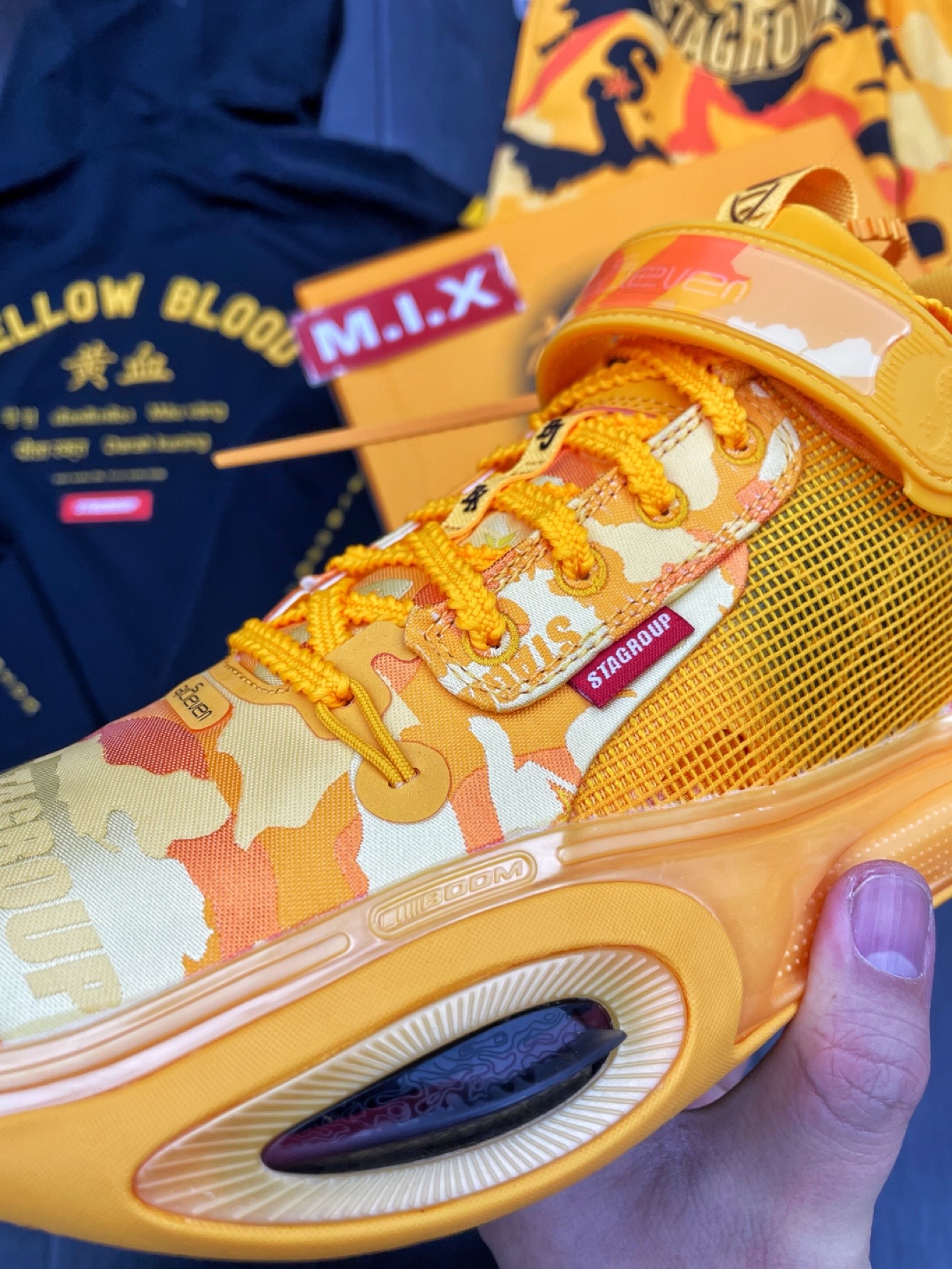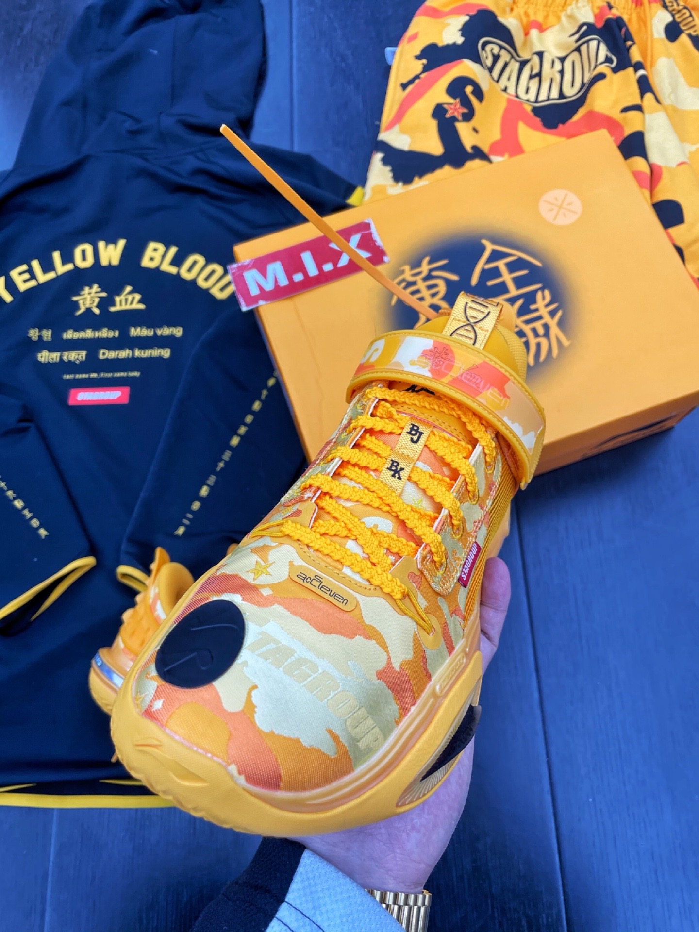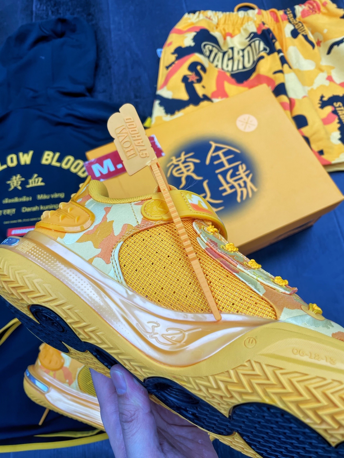 李宁品牌携手韦德 STA_ 联合呈现—— 韦德全城11特别版"黄血",融合灵感,团结一心。 🧬 鞋面使用迷彩设计,展示来自亚洲人民的强韧力量;鞋头迷彩图案暗藏STA品牌LOGO,提升视觉层次感;鞋舌内侧刺绣团结、奋进字样,展现炎黄子孙特有的凝聚力和进取心;鞋身外侧放置STA红色织唛,彰显限定身份;鞋面新增魔术贴,4D闪卡贴片材质印制"黄血"字样;029黄色织唛代表西安区号,鞋垫印有大海航行靠舵手...