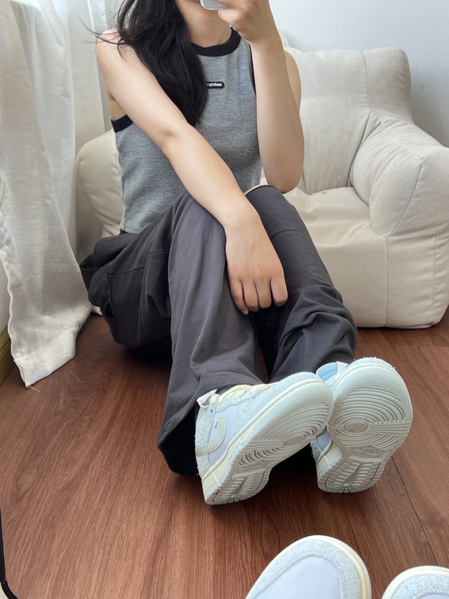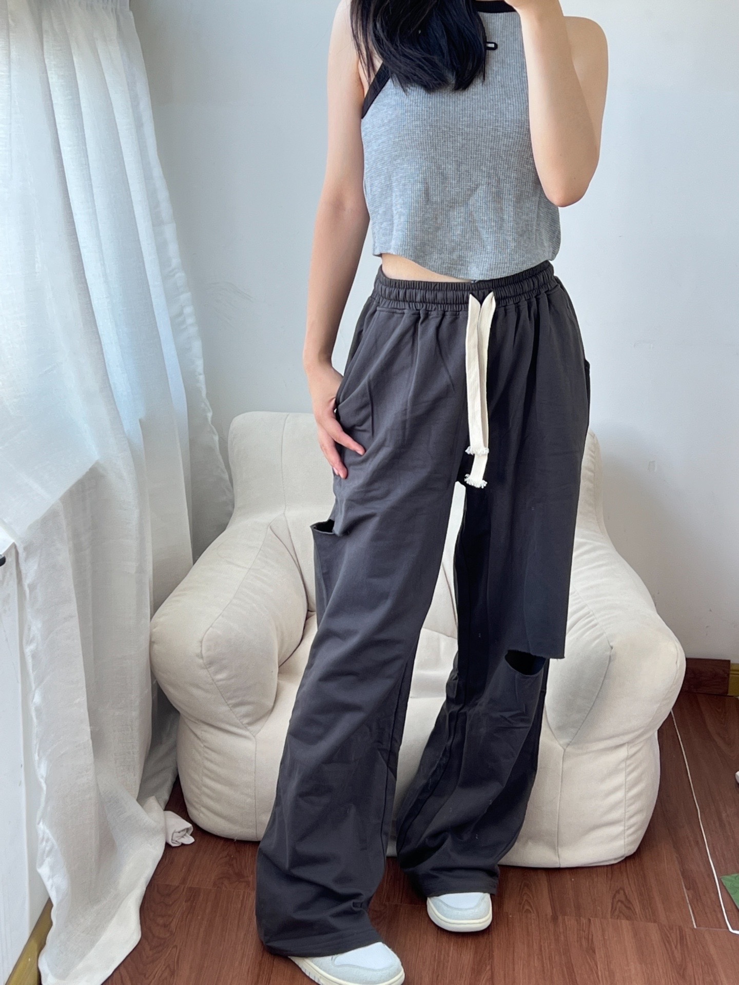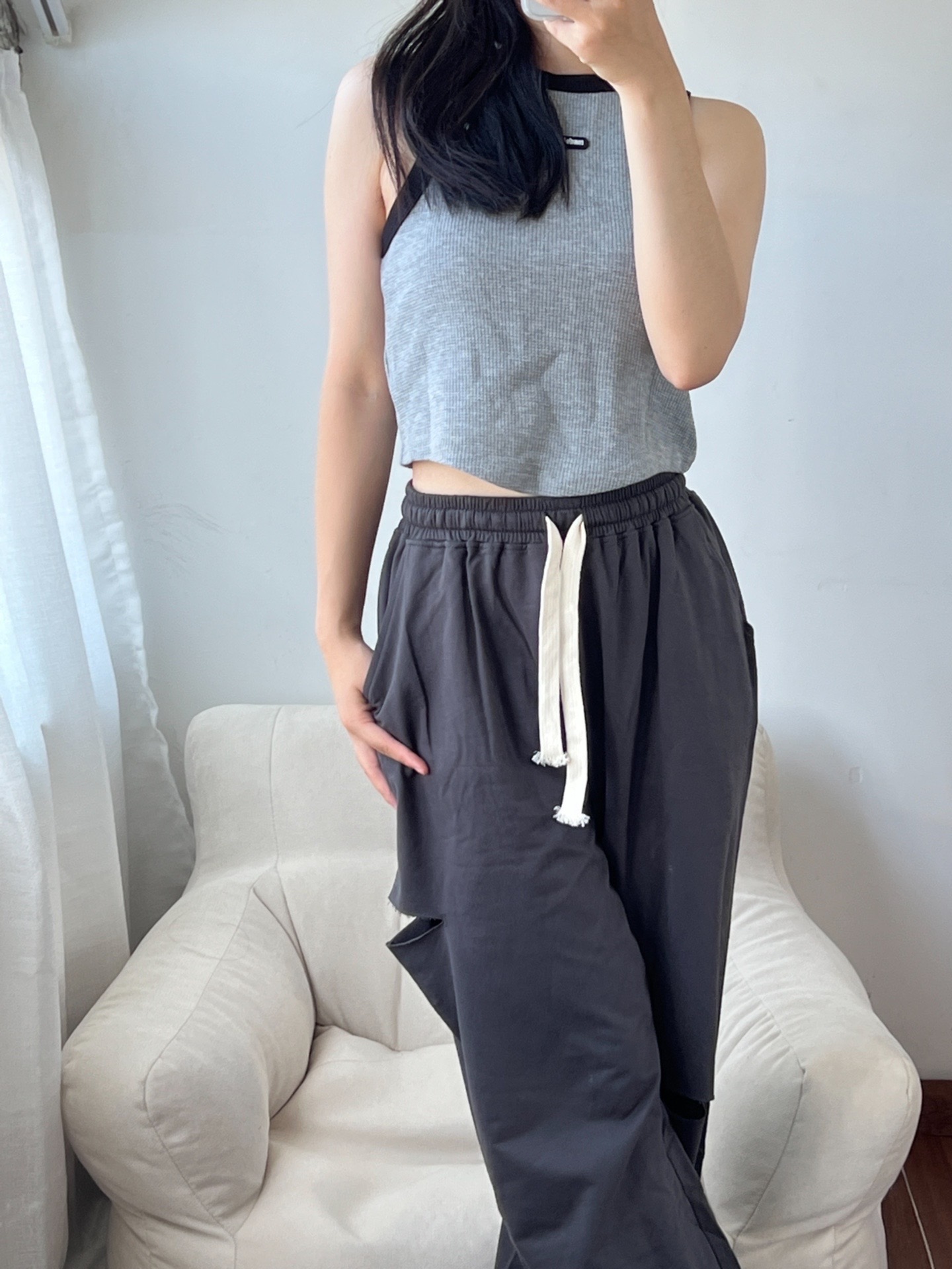 今天的一身超级喜欢!! 我很喜欢这样的衣服,小背心超级好看,然后搭配破洞休闲裤,真的要命哇! 颜色都是我喜欢的灰色系,夏天穿不张扬☺ CHUU的裤子真的好喜欢~ 破洞的设计不会很漏,可以说是恰到好处😆 而且很舒服~ 鞋子穿的是钓鱼dunk,鞋子侧面会反光哟 淡淡的颜色超级爱 穿上出去耍 📸 #穿搭博主ootd #美式甜心辣妹穿搭 #拒绝不了的夏日美式穿搭 #宝藏鞋分享会 #我的夏季穿搭ootd