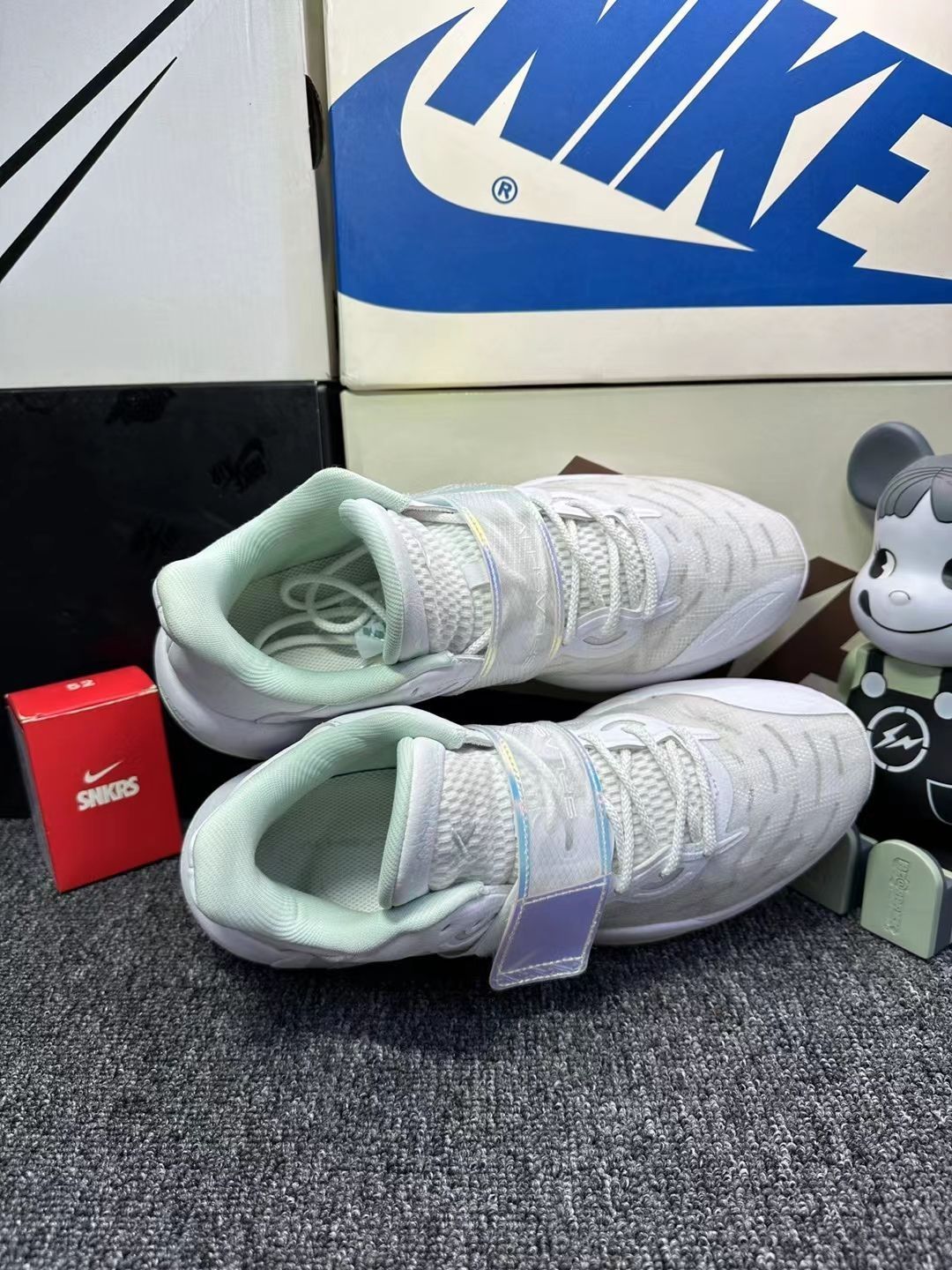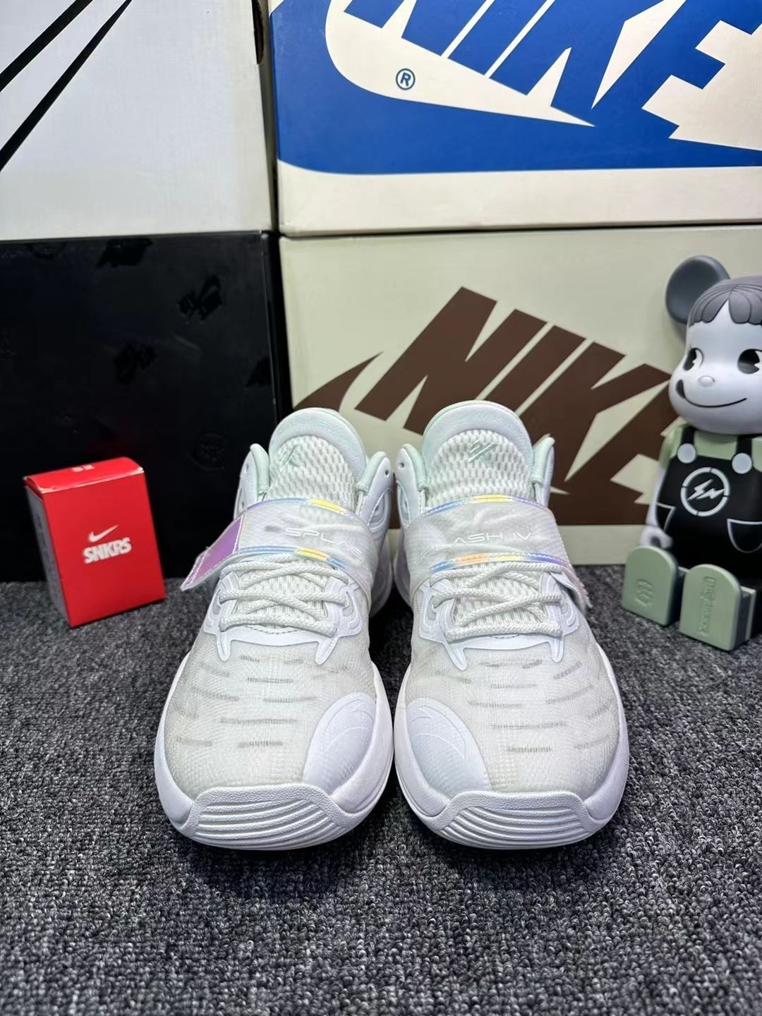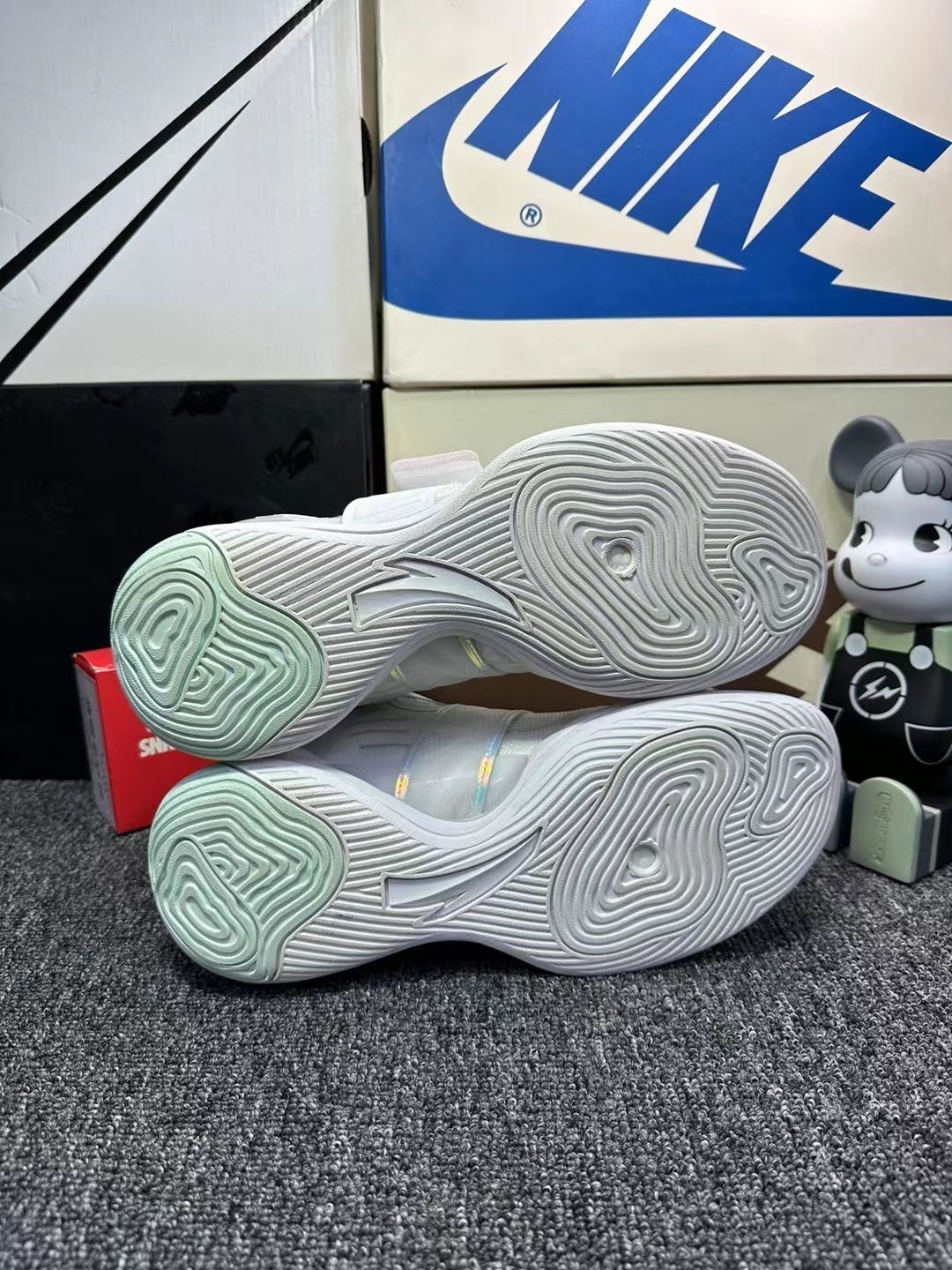 今日给大家分享的超级能打的实战篮球鞋来自安踏水花4米白配色。 这款篮球鞋配色清新靓丽,一看就有夏天的风格。搭载全掌氮科技的缓震,缓震极限非常高,脚感澎湃。鞋子附有绑带的设计,增加了中段的包裹和足弓支撑。前掌鞋面强度和包裹非常不错,后跟锁定感略显不足。鞋面轻薄透气,出汗多也不怕。后跟也有安踏的标识,非常的帅气!大底抓地力和耐磨性都非常不错!简直是学生党必备的一款夏日篮球鞋!
