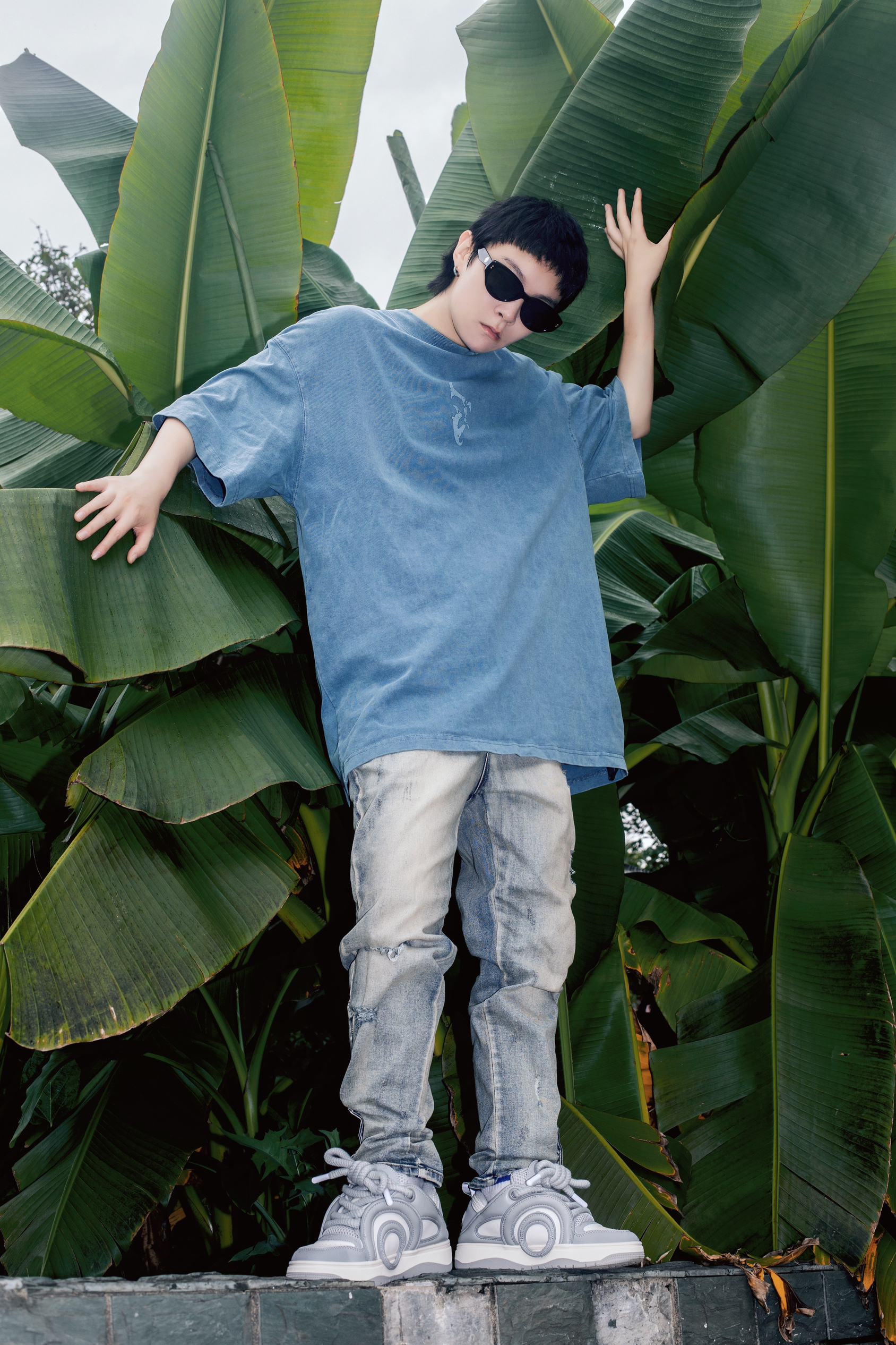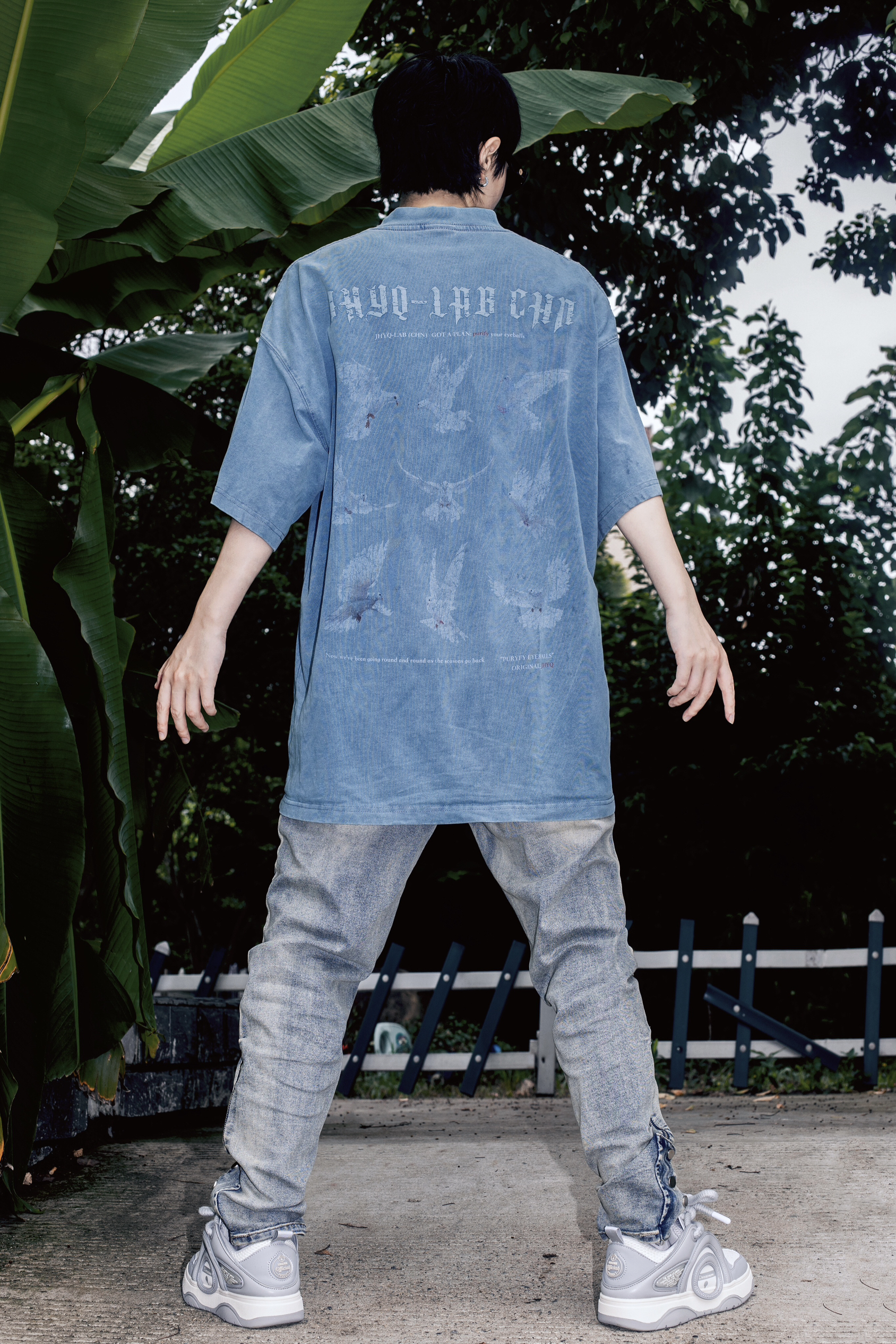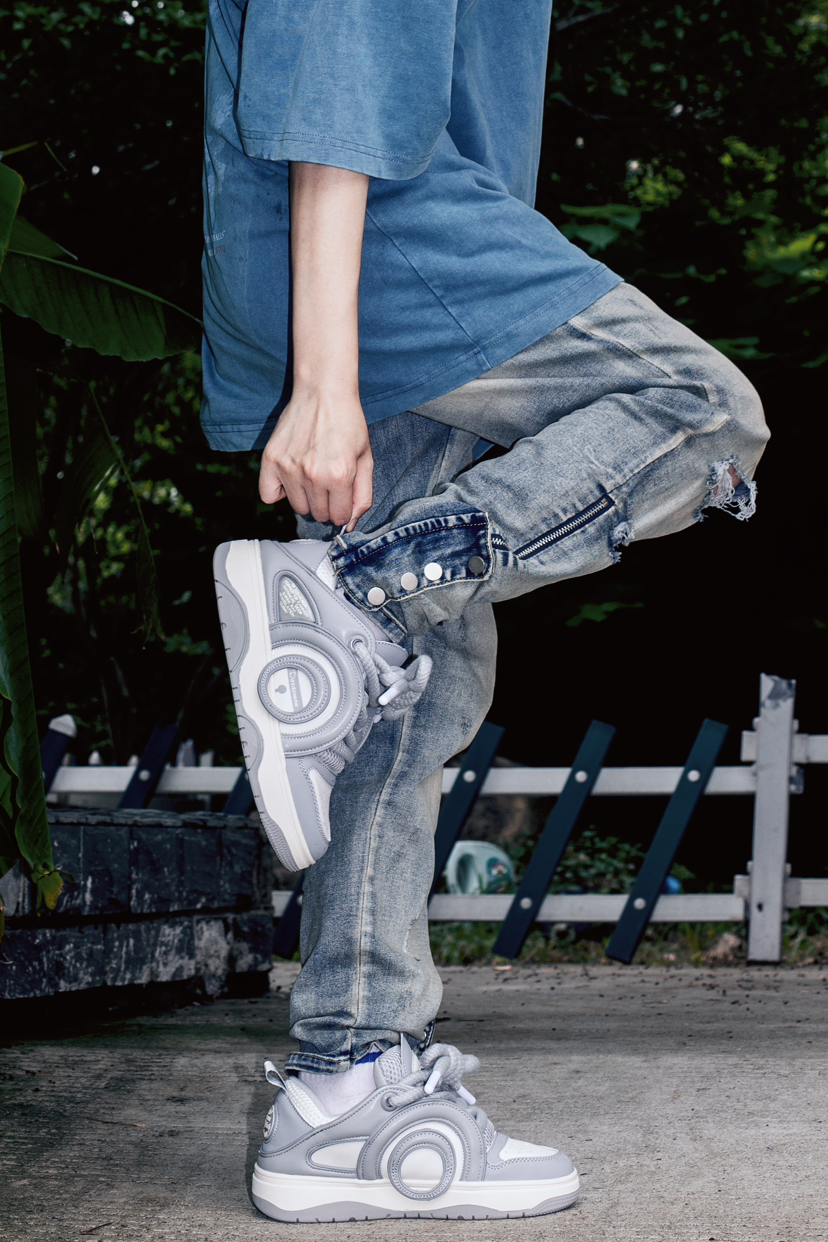 男生很难不爱美式高街穿搭 搭配毫不费力 很容易出氛围感 穿搭指南: 上身一件水洗蓝短袖T恤 宽松版型和复古做旧的效果就很美式 下身搭配一条水洗泥黄微喇牛仔裤 这种上款下窄的搭配是美式高街的精髓了 上脚一双哆啦A梦魅影灰休闲板鞋 带点面包鞋型搭配牛仔裤正合适 粗鞋带设计很有个性也很街头 厚底穿起来很舒服还能小增高一下 整体蓝灰色调高级不失潮酷感