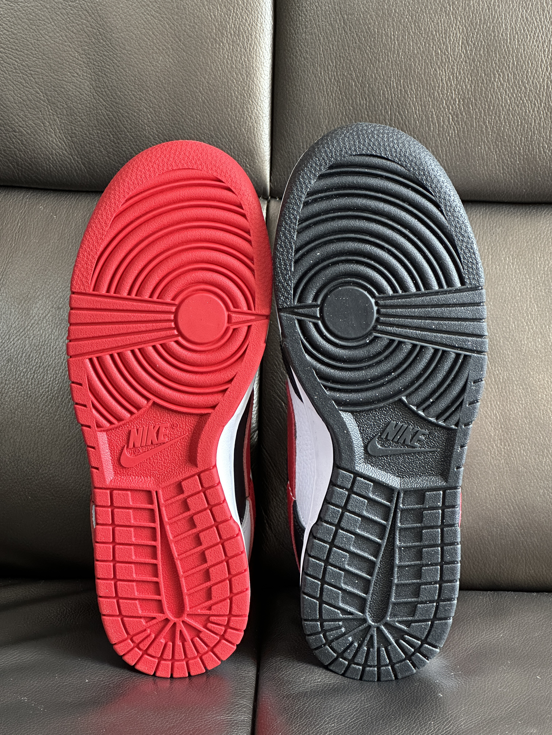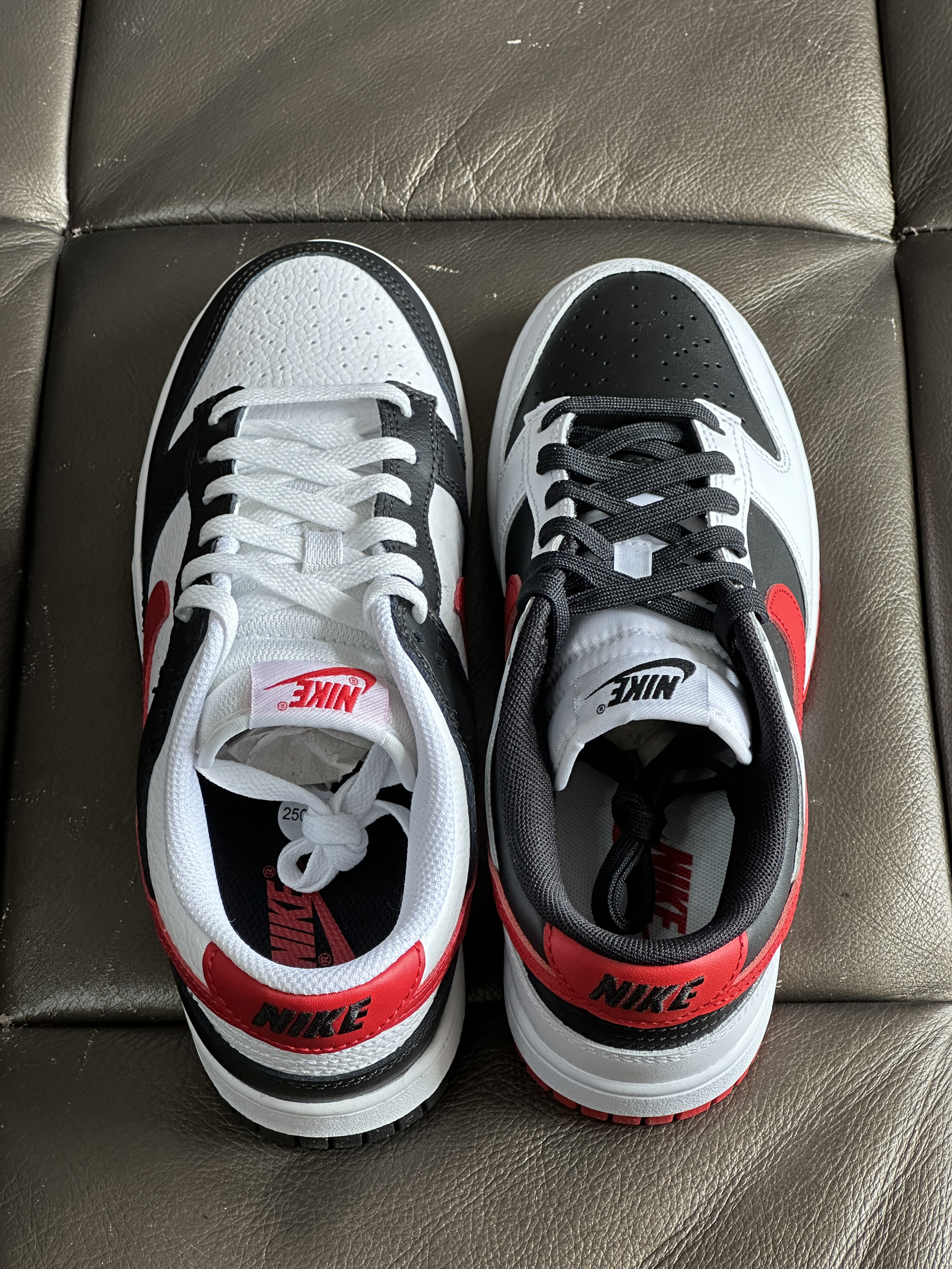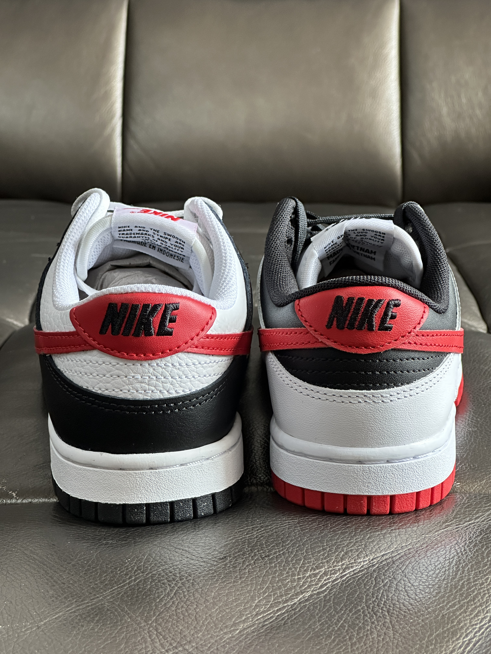 ▶Dunk Low大学红和反转大学红你觉得谁的颜值更胜一筹?二选一你会选择谁呢? ▶就我个人而言看到这两双鞋的第一印象是选前脚面白色的,拿到手上脚一试发现居然有点出入! 首先质感方面来说反转大学红更出众!或许是牛皮革材质的原因吧,看着更佳细腻舒服!红色Swoosh在黑底上面效果更佳! 材质上肯定是反转大学红的牛皮革优于大学红的牛剖层+合成革!两双鞋均采用光面皮革都很好打理,但反转的黑色内衬耐脏性更...