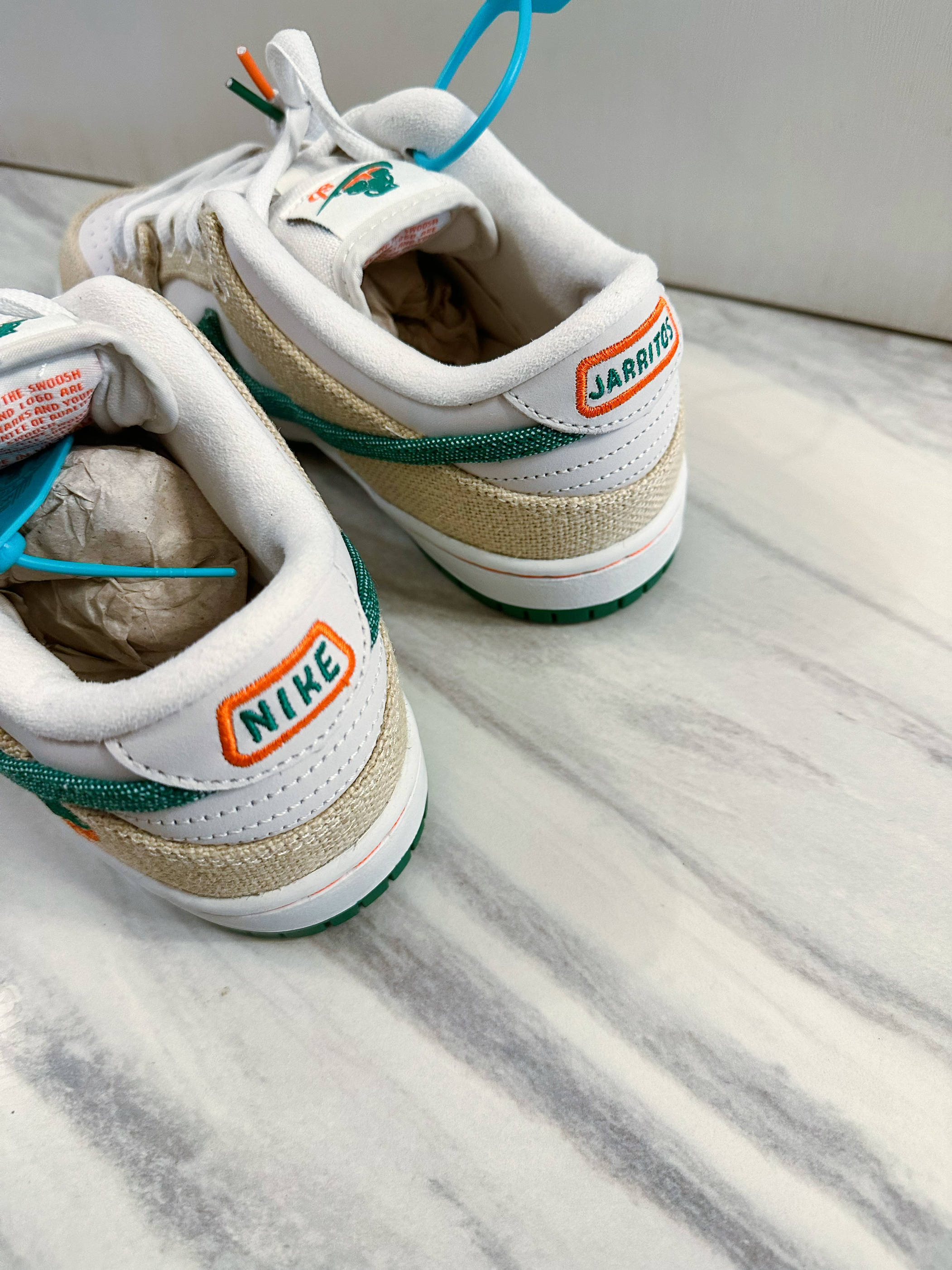墨西哥水果汽水Jarritos的联名,Jarritos标志性的橙黄,鞋面材质是麻布的材质和牛剖层皮的材质,并且麻布的位置是撕撕乐的设计,可玩性十足,撕开后就是大面积的橙色,白橙的配色更加张扬,炫丽。后跟处Jarritos的logo刺绣,鞋子做工和细节都超好,鞋舌偏厚建议大半个码。