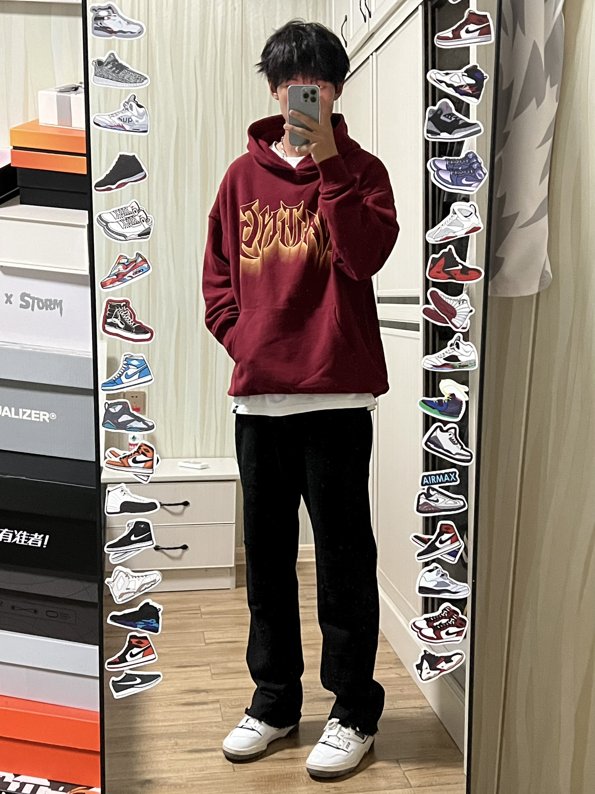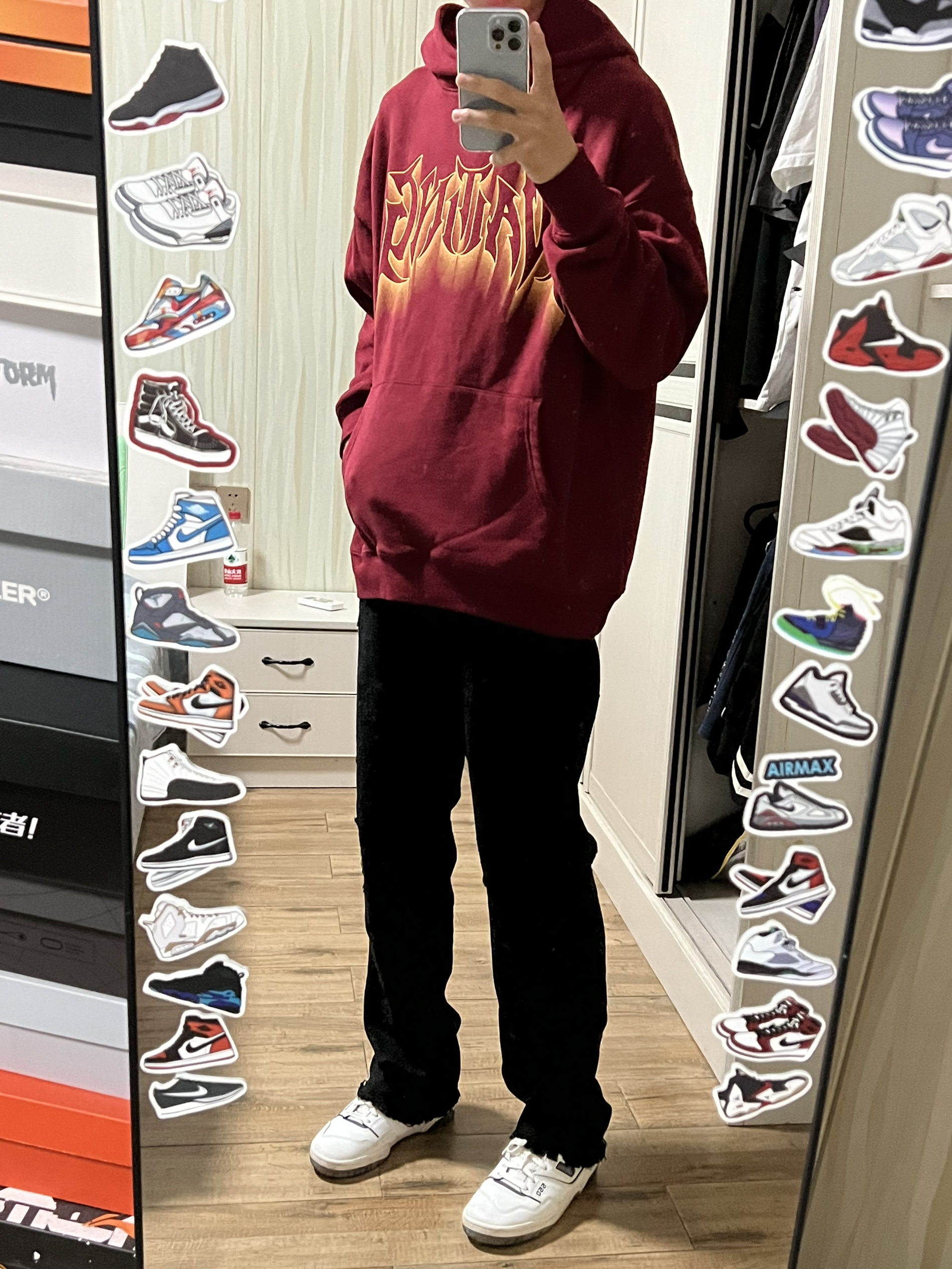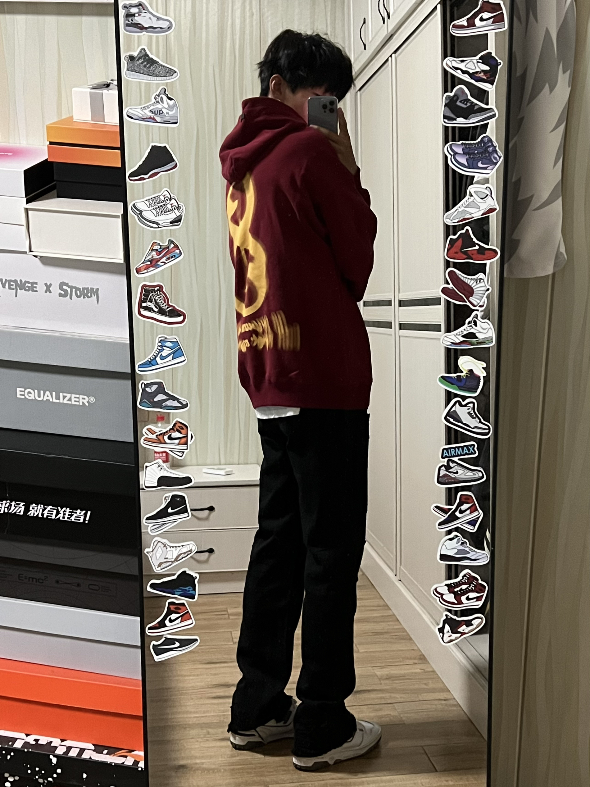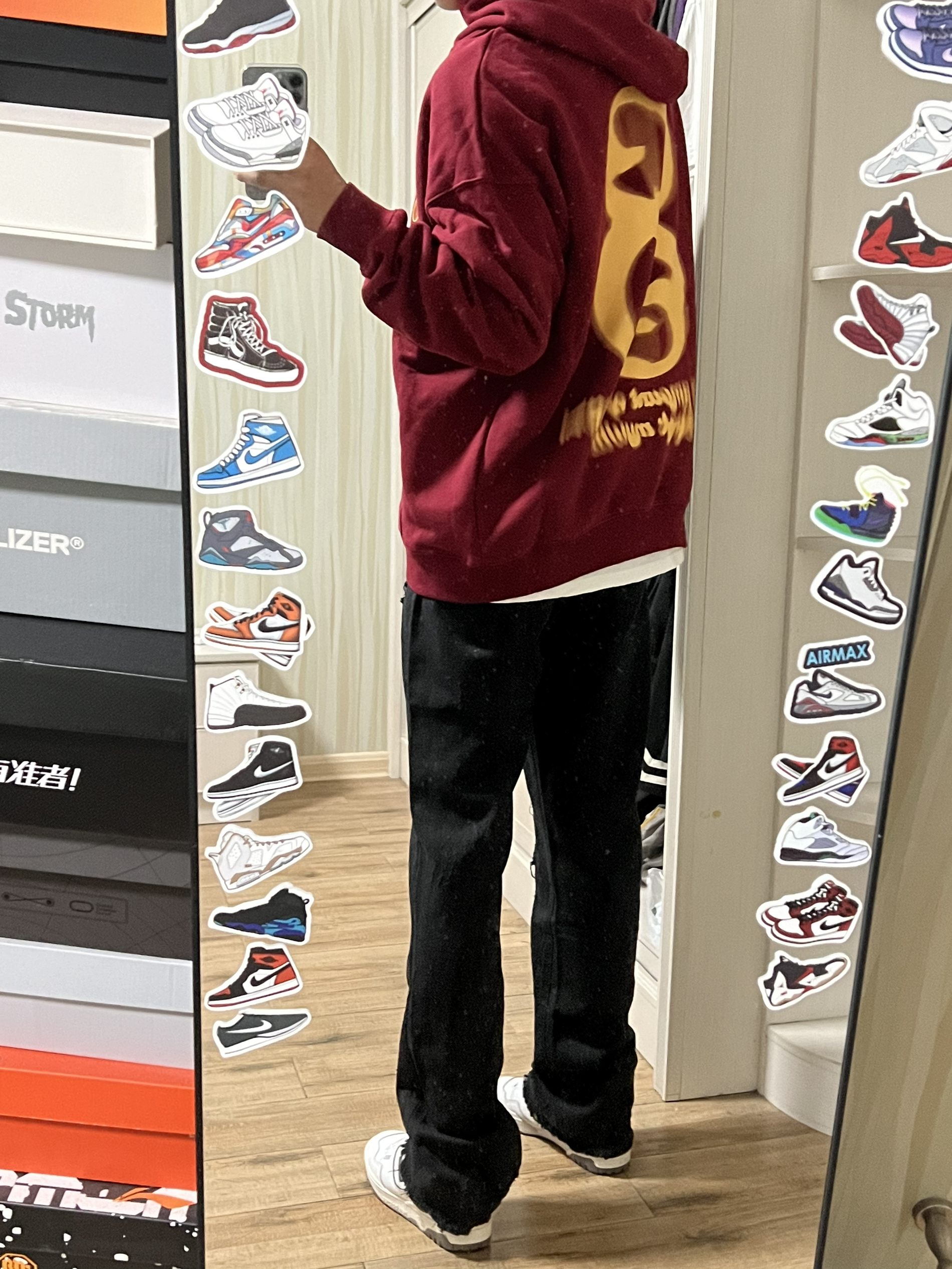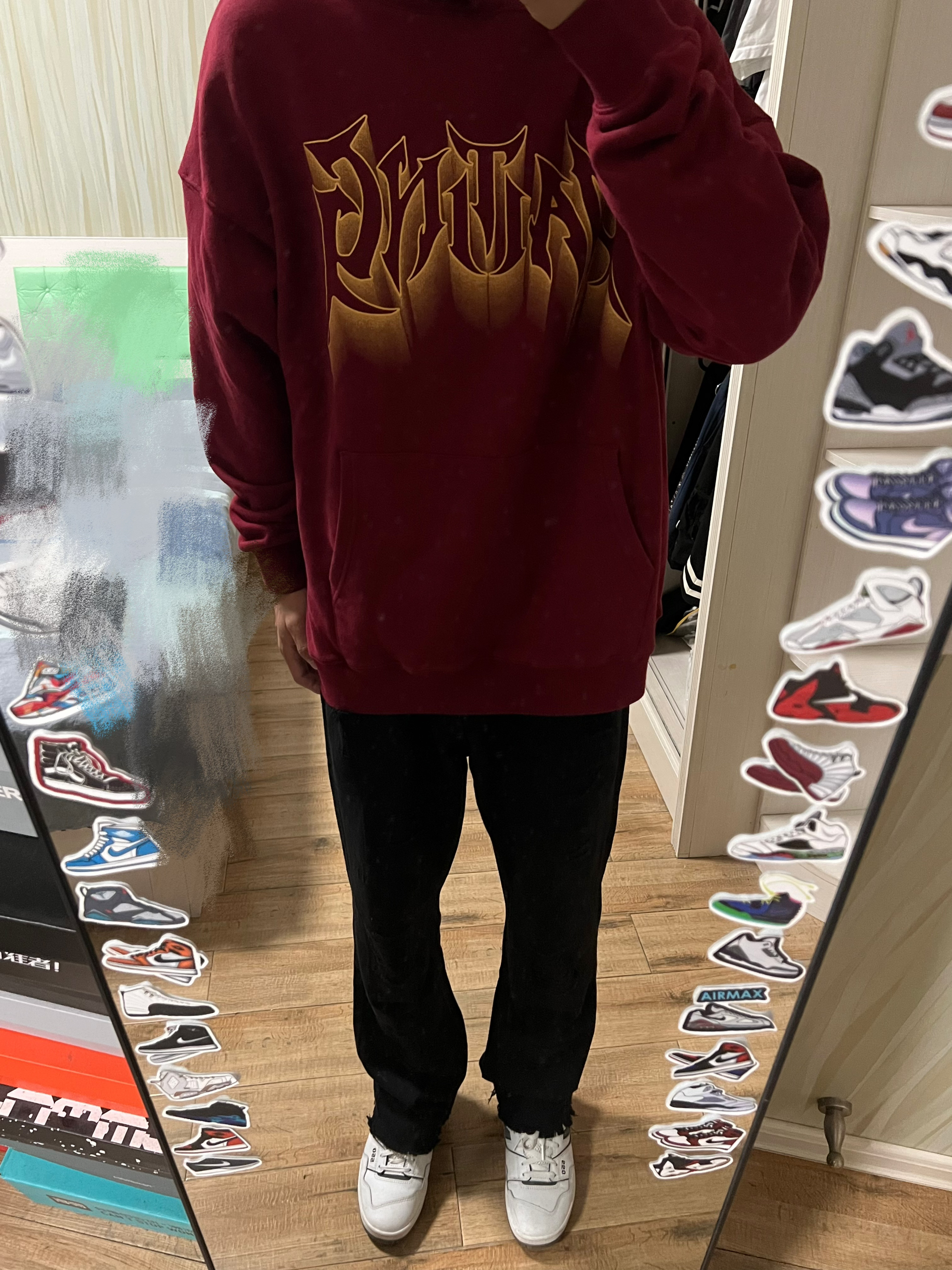👔WAITINGWAVE候浪 酒红色真的很显白 衣服面料很厚实 很适合初秋单穿 然后秋冬内搭也很不错! 版型很到位 上身不会松松垮垮 很有型 正面刀锋印花➕背面模糊印花很有设计感 兄弟们 下个月八号就要立秋咯!