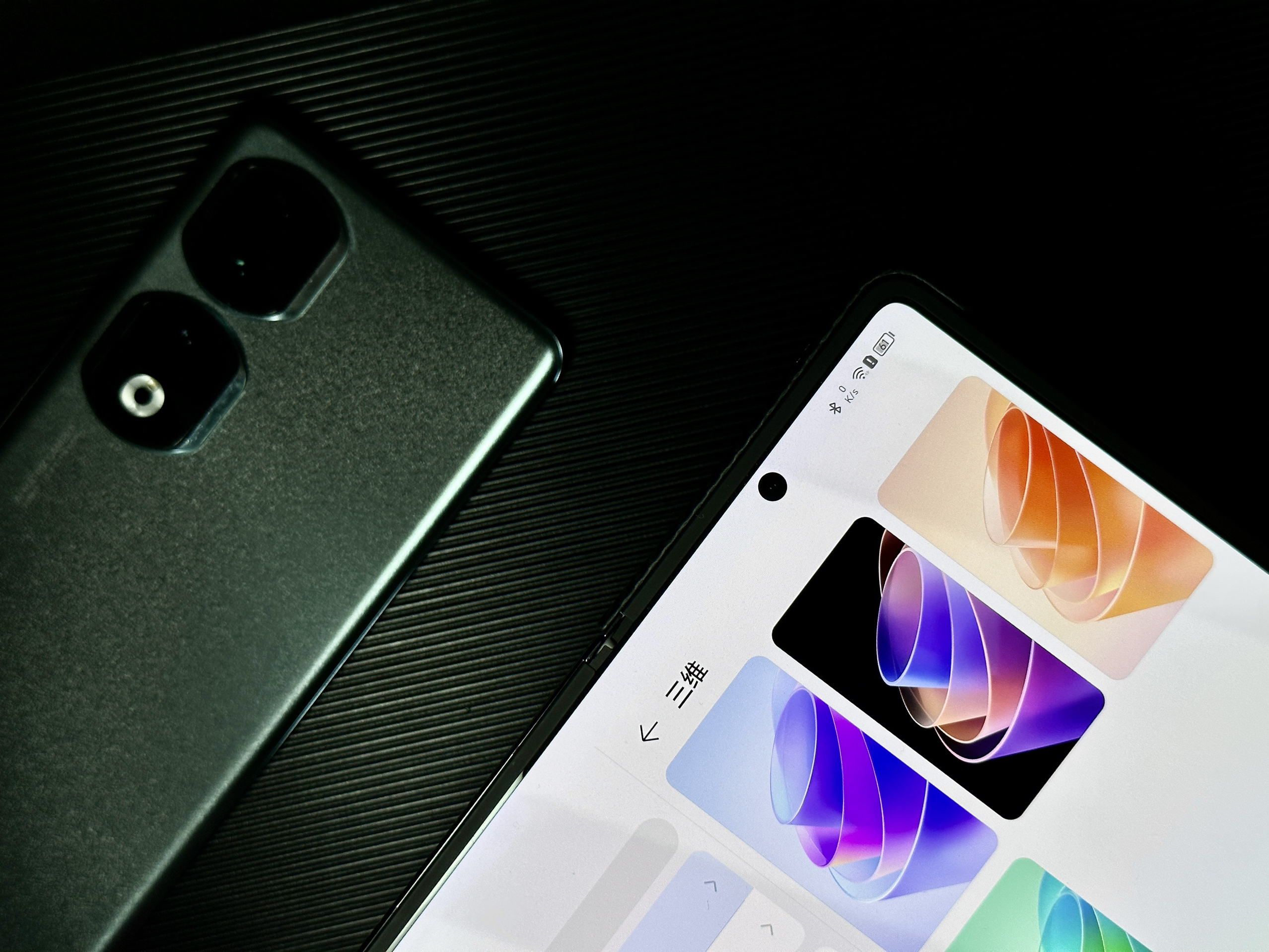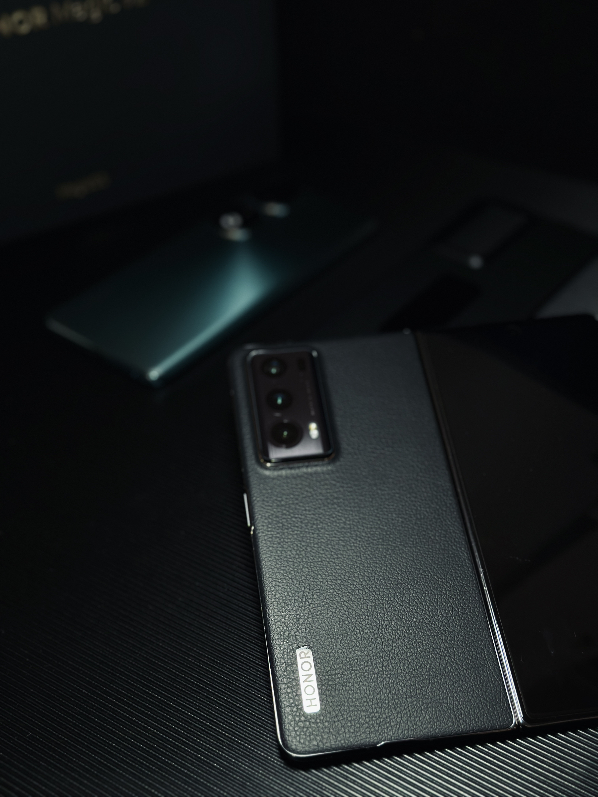 荣耀Magic V2雅黑色,后盖素皮材质,荔枝纹理触感清晰,比华为Mate 50 Pro那个素皮明显! 鲁班铰链,可以完完全全对折在一起,10.7mm的厚度,重量236g,犹如一台普通直板机。比华为Mate X3更薄更轻,比iPhone 14 Pro Max的裸机也轻4g。 屏幕也是拉满了,内外屏支持120Hz LPTO,内外屏均支持3840Hz PWM调光。如此轻薄的机身,还塞下了青海湖50...