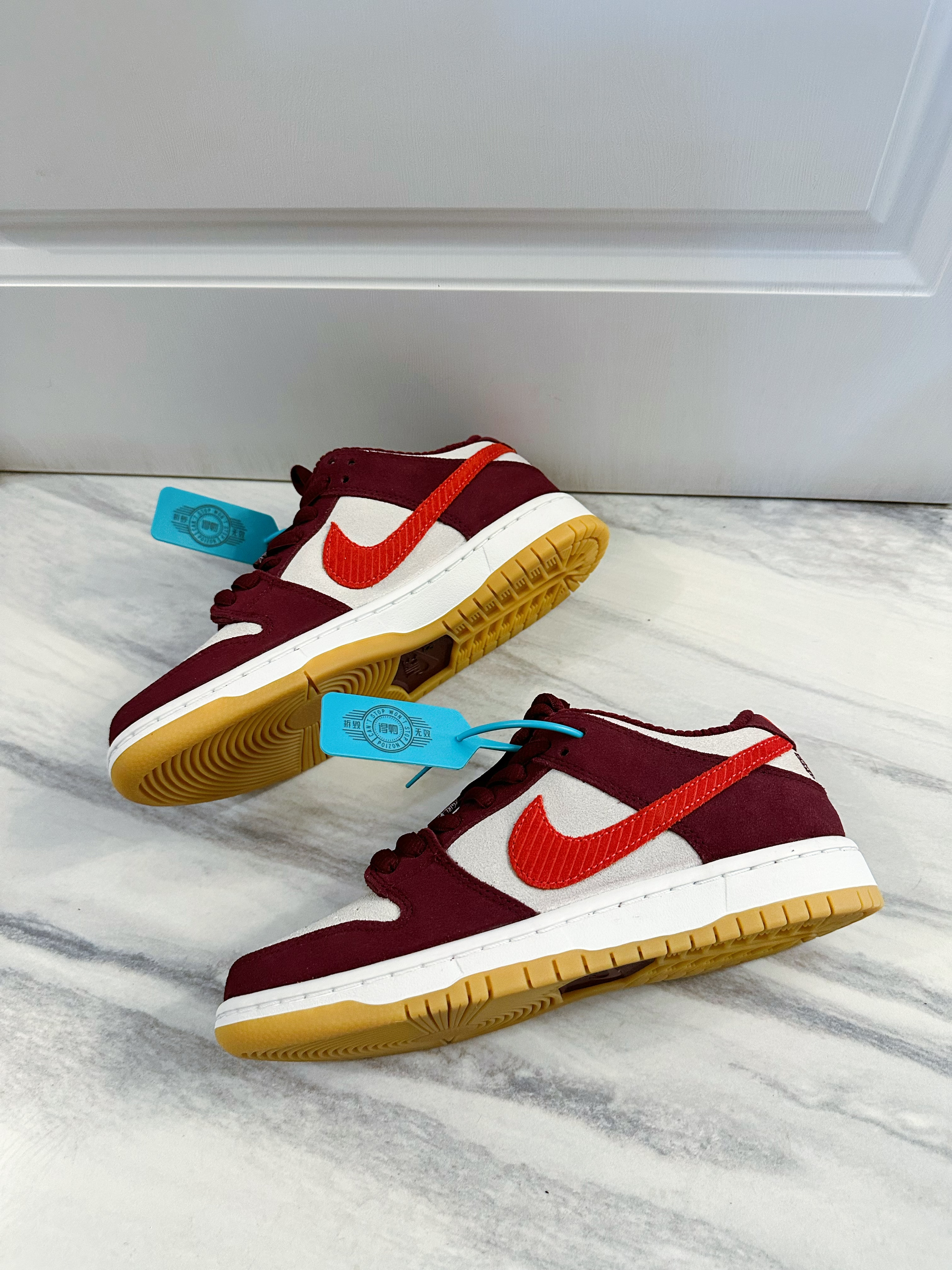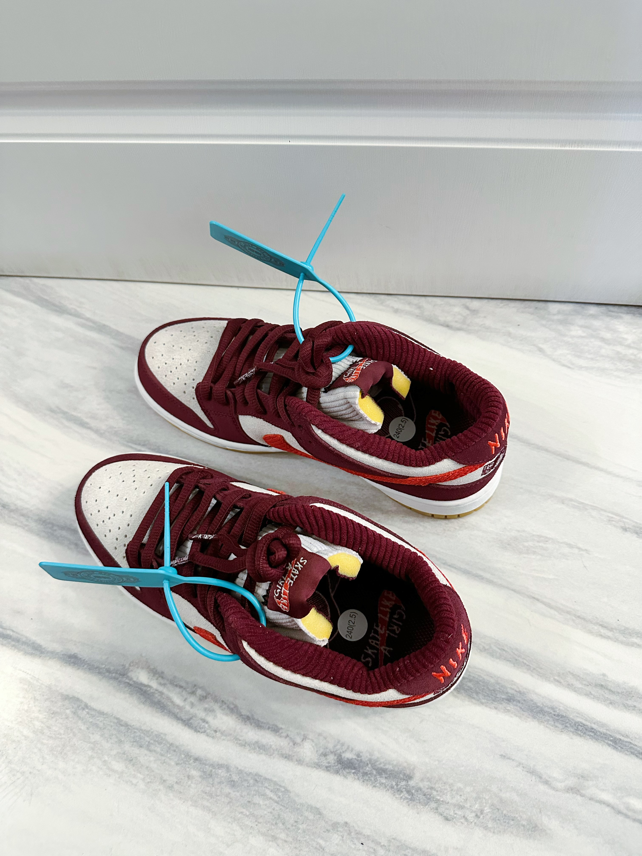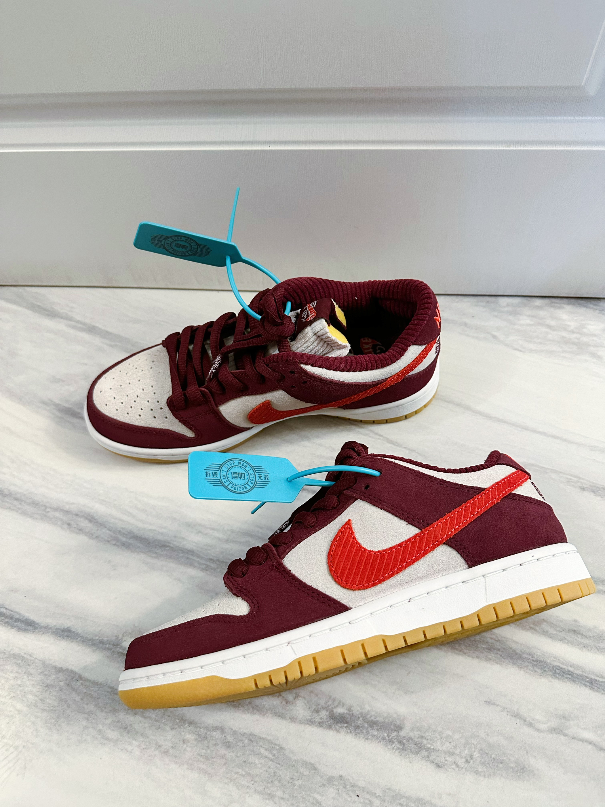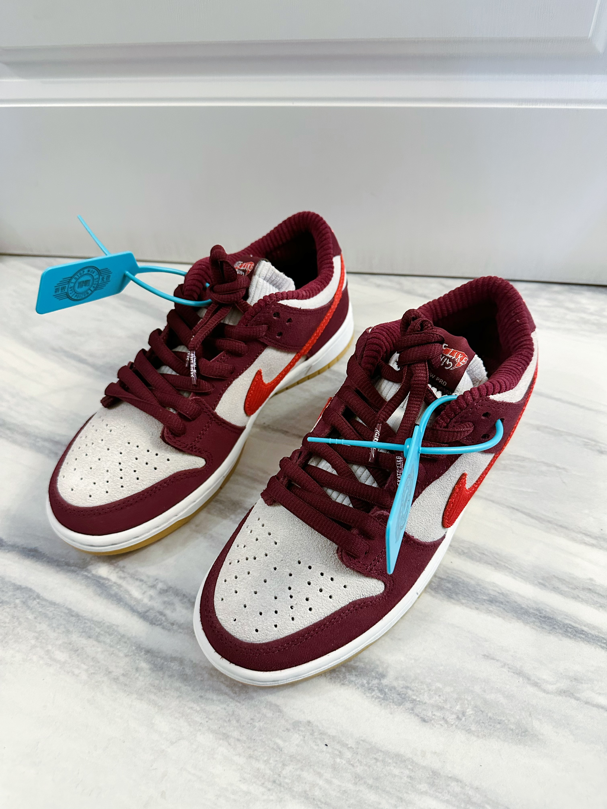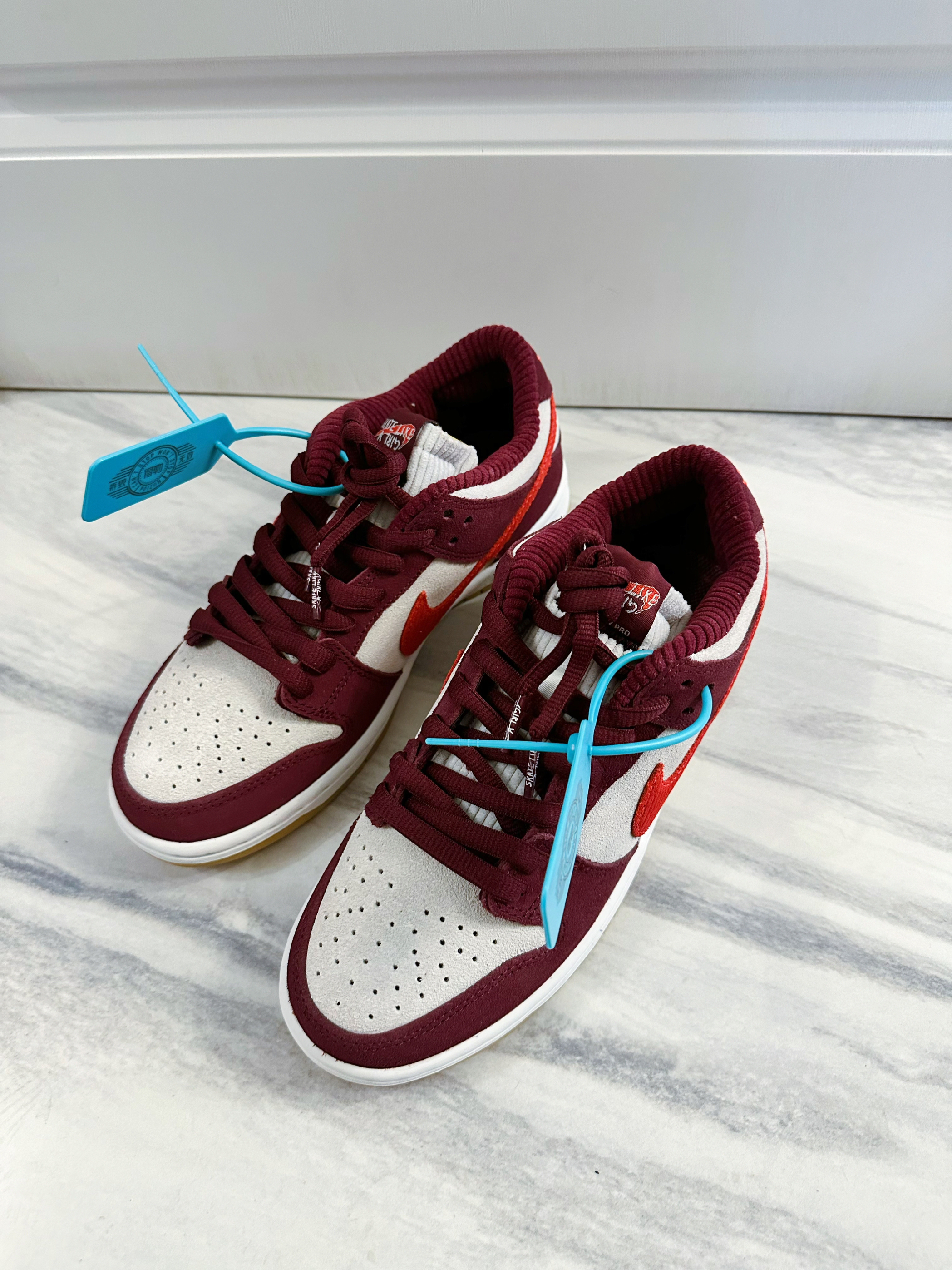 Skate like a girl与nike联名打造的SB Dunk low鞋型,酒红色和米白色的麂皮材质,实实在在的草莓熊配色十分治愈,鞋舌和内衬的灯芯绒材质舒适又十分高级,复古大底使整双鞋色彩搭配非常好看,饱和度很高并且十分百搭。后跟还有Skate like a girl得logo刺绣彰显联名身份,细节十足