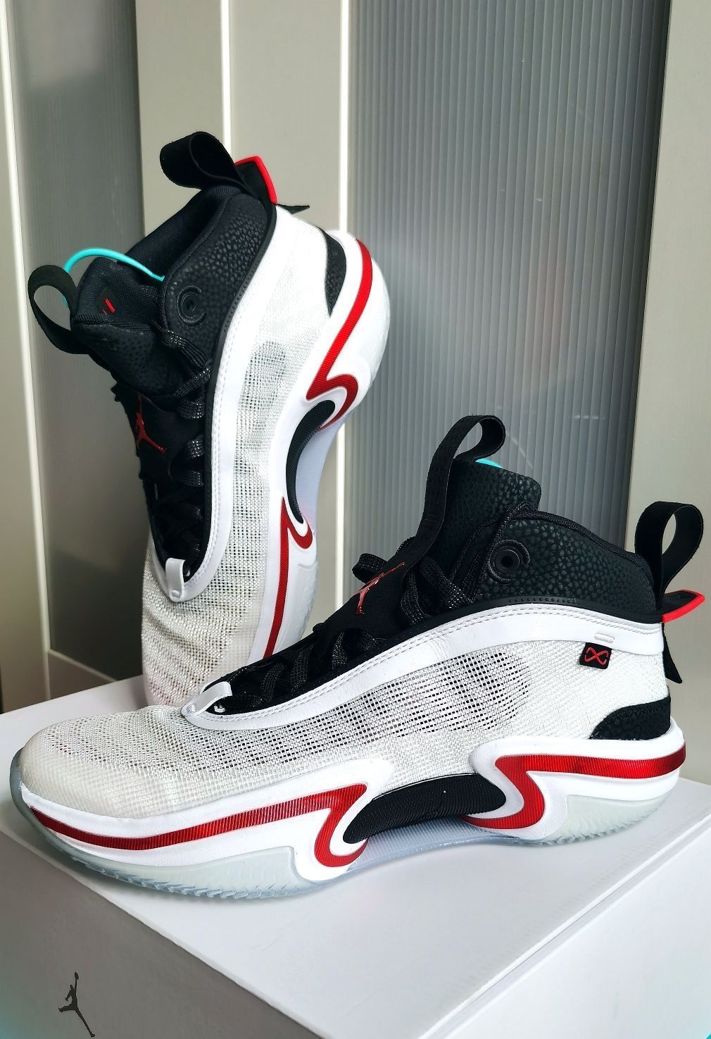 👟球鞋名称:国外版AJ36白红 🔍分享理由:颜值高,透气,抓地力强 🤔整体感受:这款白红AJ36国外版,主要区别就是鞋底采用的水晶底,抓地力和摩擦力都提升了不少,而且鞋底往两边上翻延续的还可以,加大了防侧滑面积,个人感觉AJ36是将打球和压马路结合的比较好看的鞋型,平时打打球,日常压压马路都可以兼顾