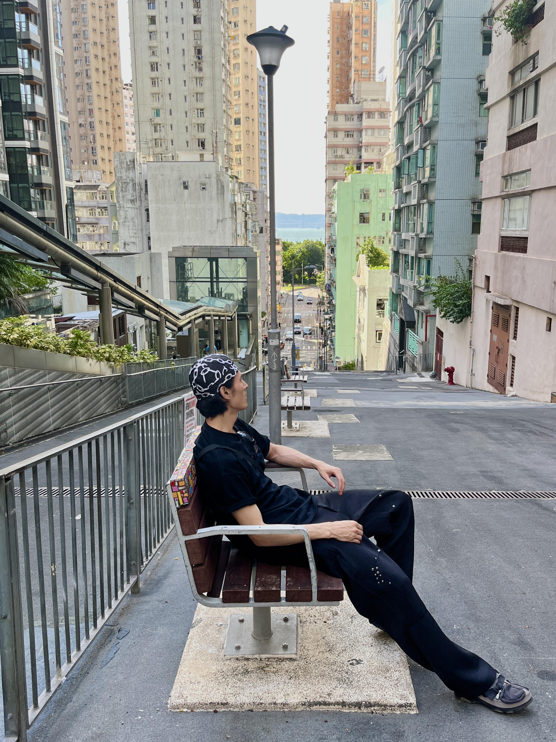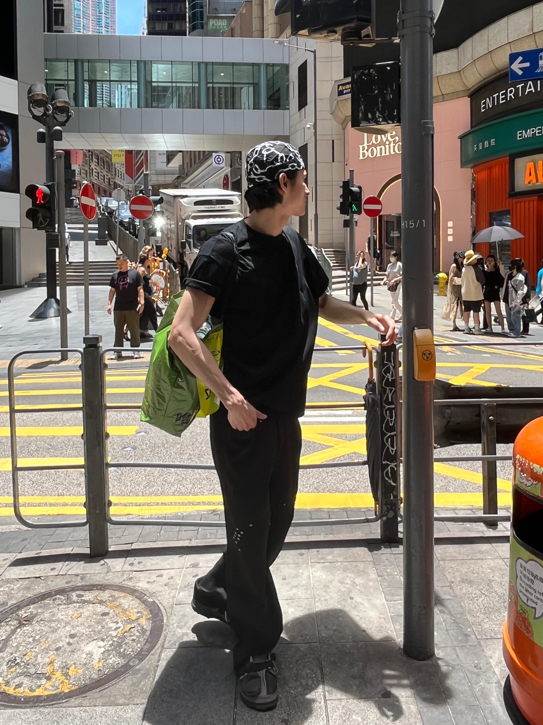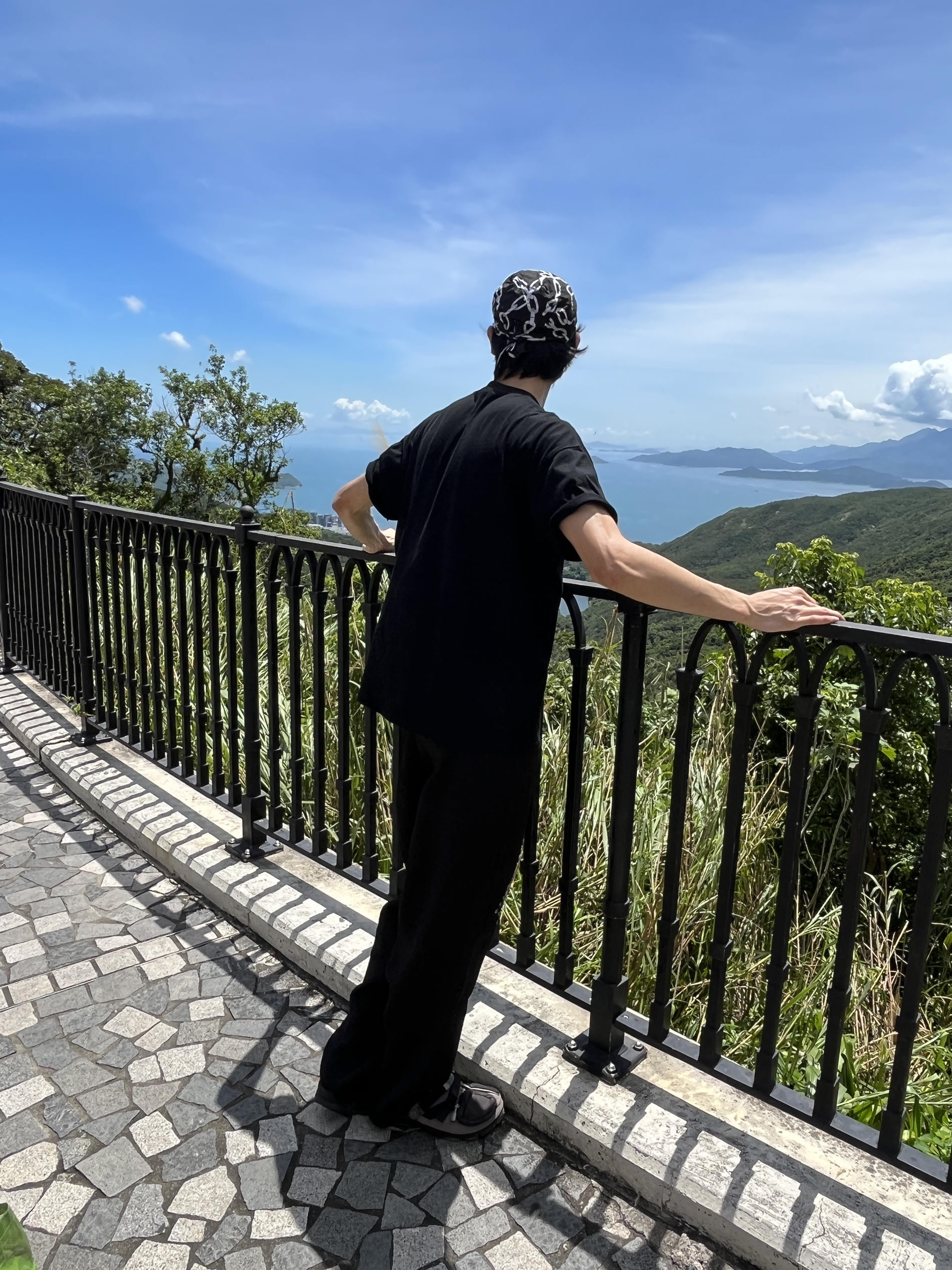身高|体重:188 70 🧍♂️ 穿搭风格:cleanfit 👔 上衣:黑色T恤 👖 下装:休闲阔腿裤 👟 鞋子:cross拖鞋 🎒配饰:头巾