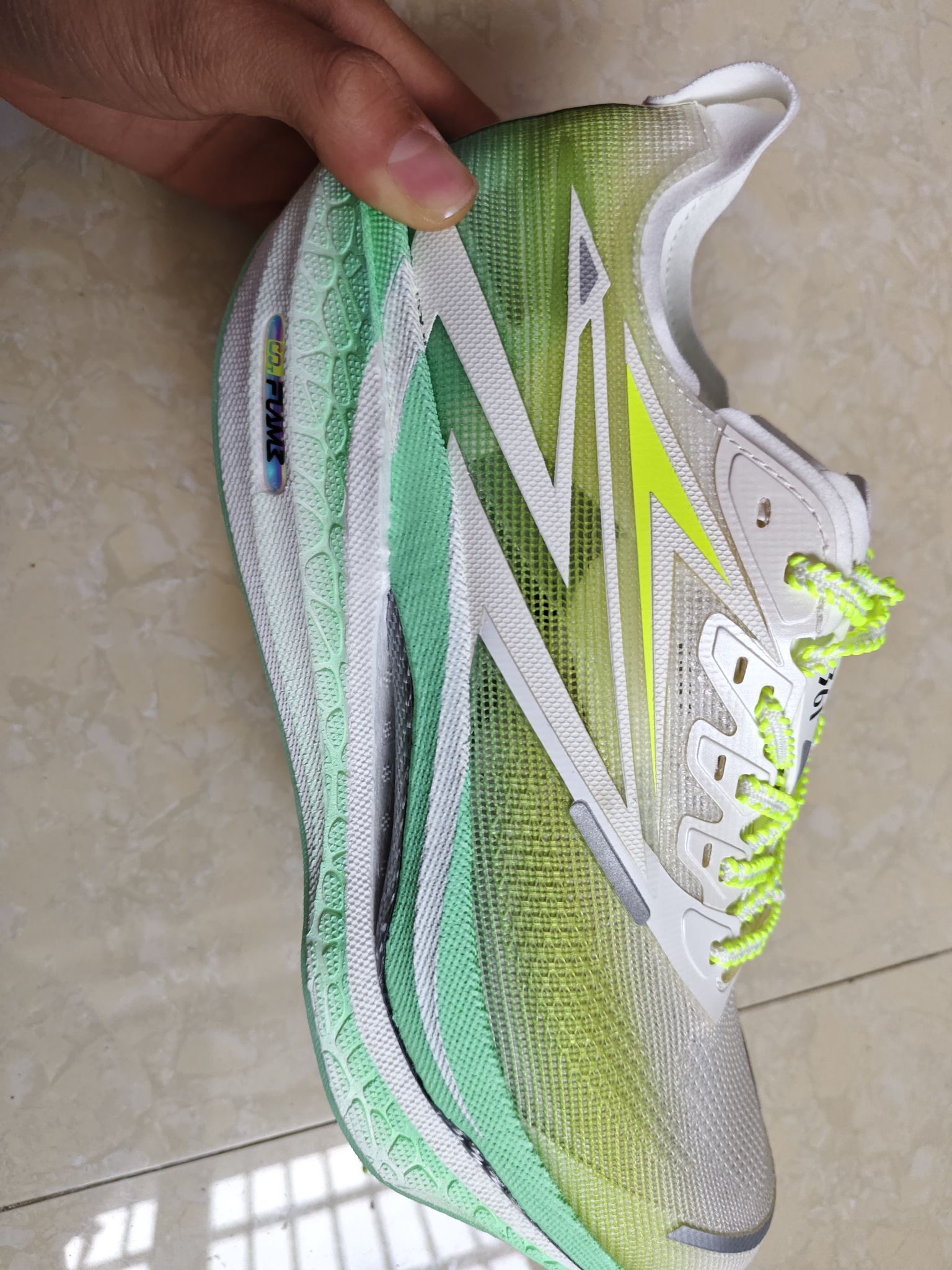 这双比Fly3脚感要硬一些,可能新鞋没踩开,重量的话这个43码240克,fy3的话42码250克,码偏小半码,还没跑,试了下脚感后边的泡棉就有褶皱了,感觉黑色穿起来怪怪的,前脚掌由于鞋面材质弹性空间挺大的,脚瘦的包裹性差点,价格400出头,性价比挺高的。