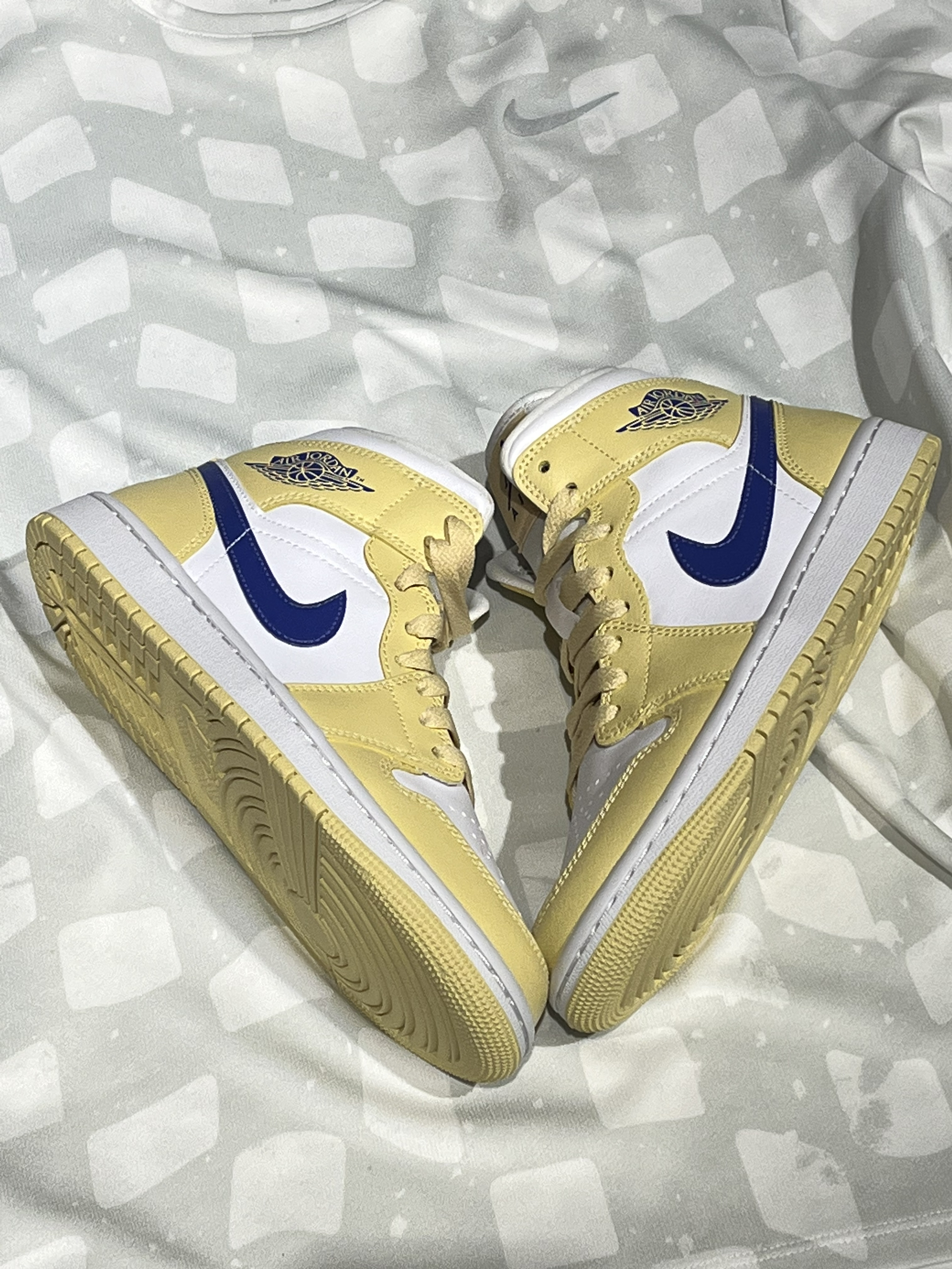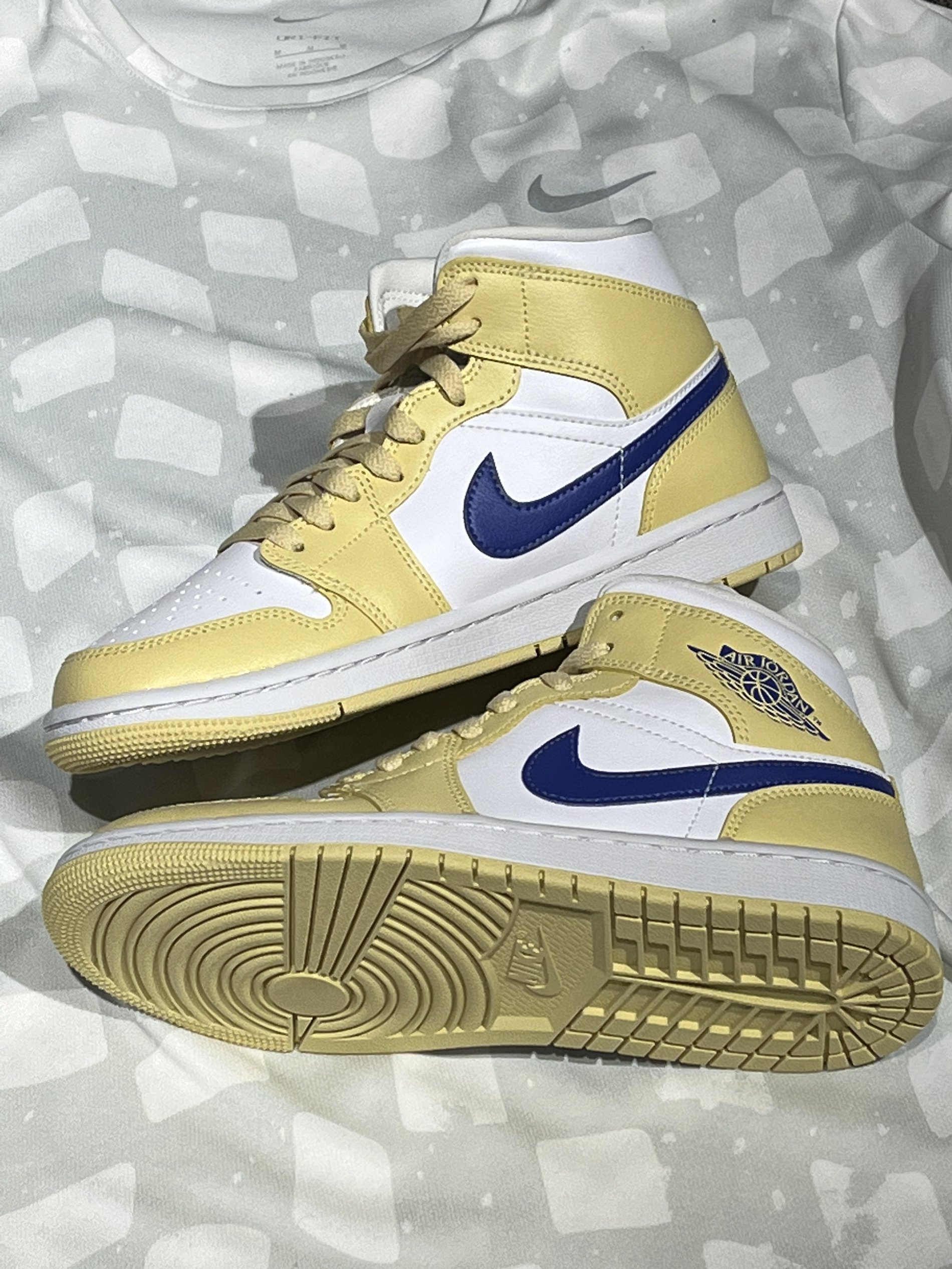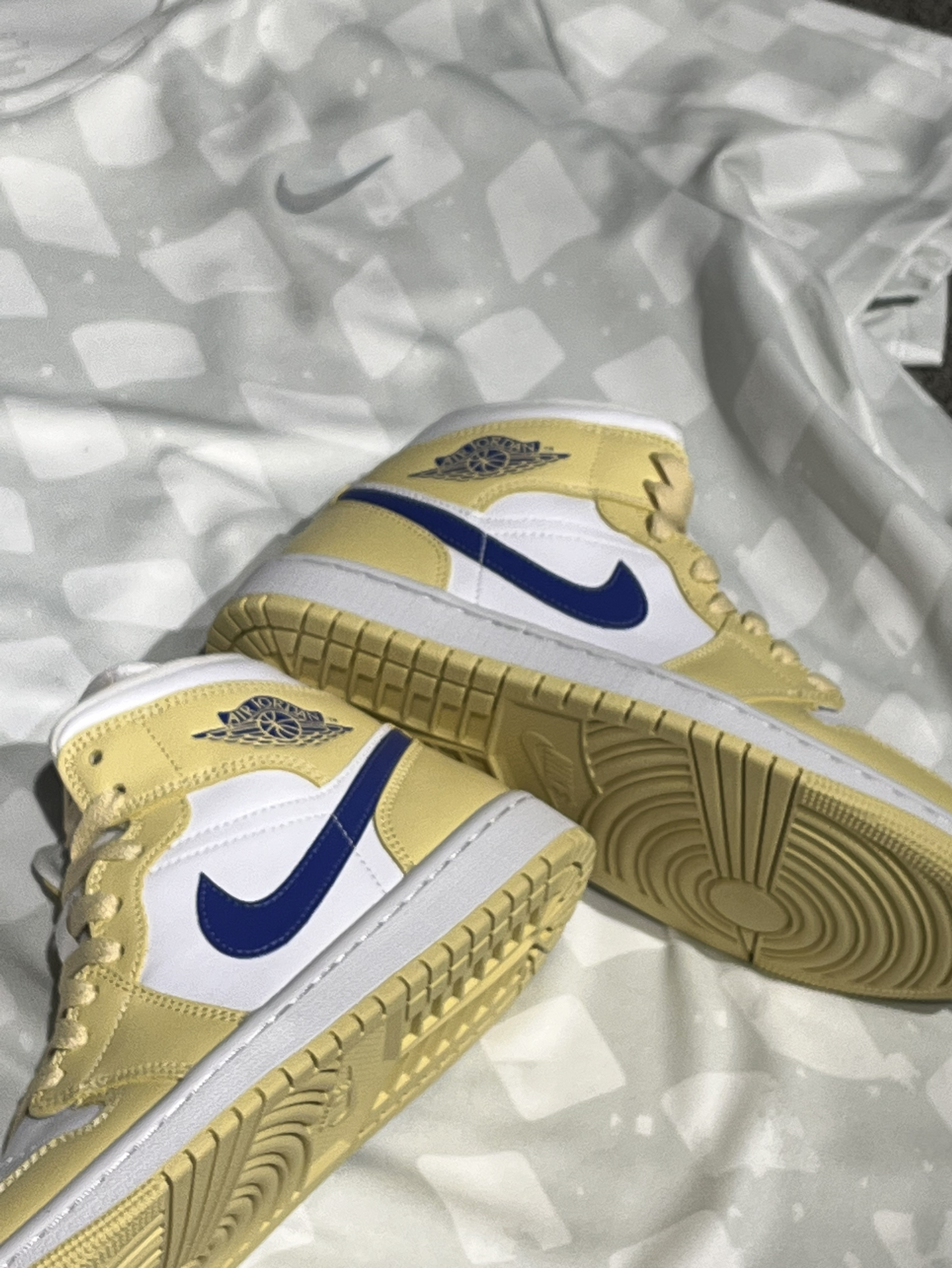 🏀🏀来自于Air Jordan 1 复古篮球鞋 中帮球鞋来自于乔丹一代,水洗柠檬🍋的配色,简约的白➕柠檬黄适合夏日的穿着,球鞋整体采用具有质感的材质,同时也是加上蓝色的Swooshe Logo的点缀,让球鞋配色不会单一化。 当然本双球鞋也是中帮球鞋也是,包裹性➕秋天时期的球鞋保暖效果还是不错滴!