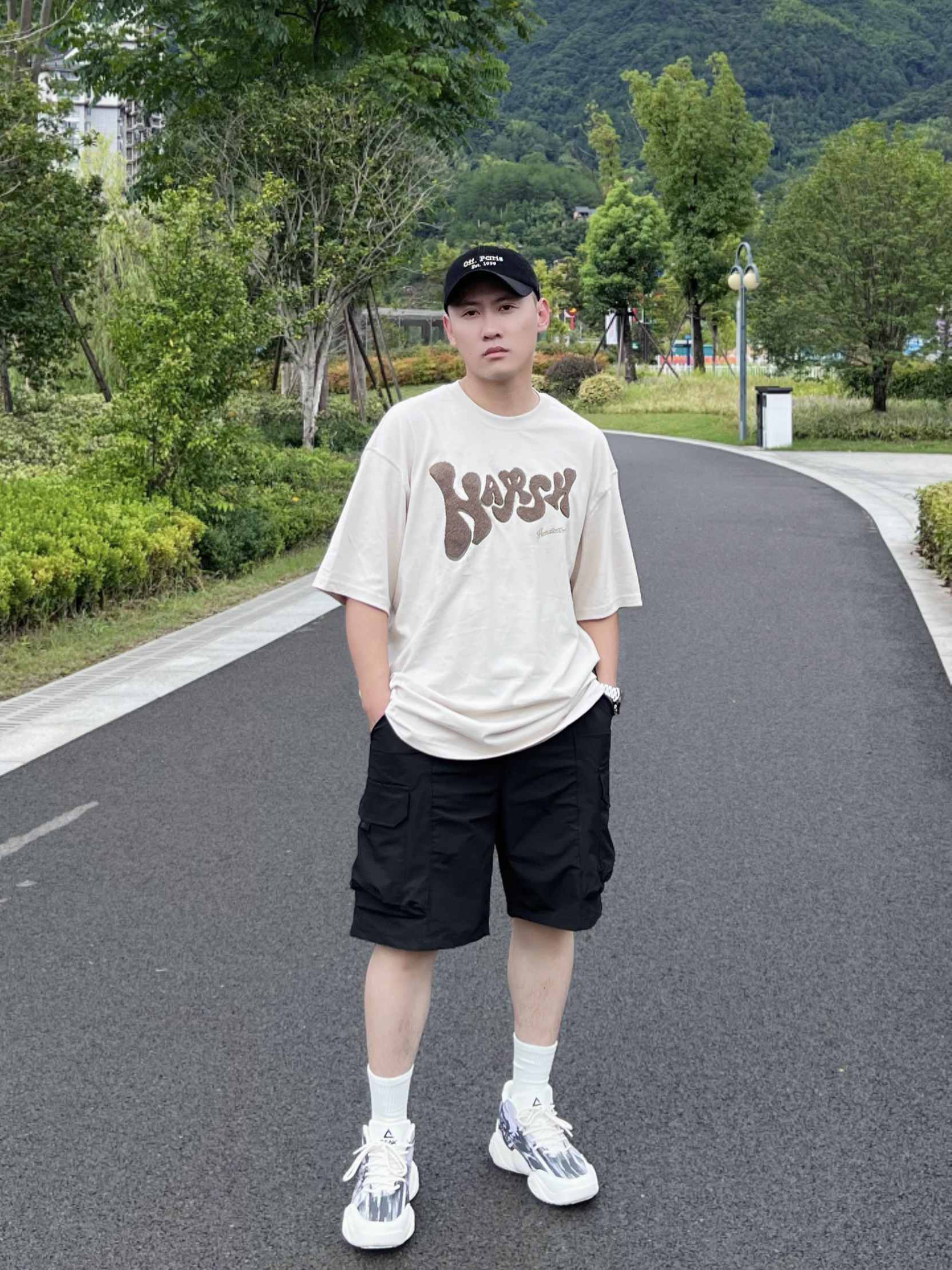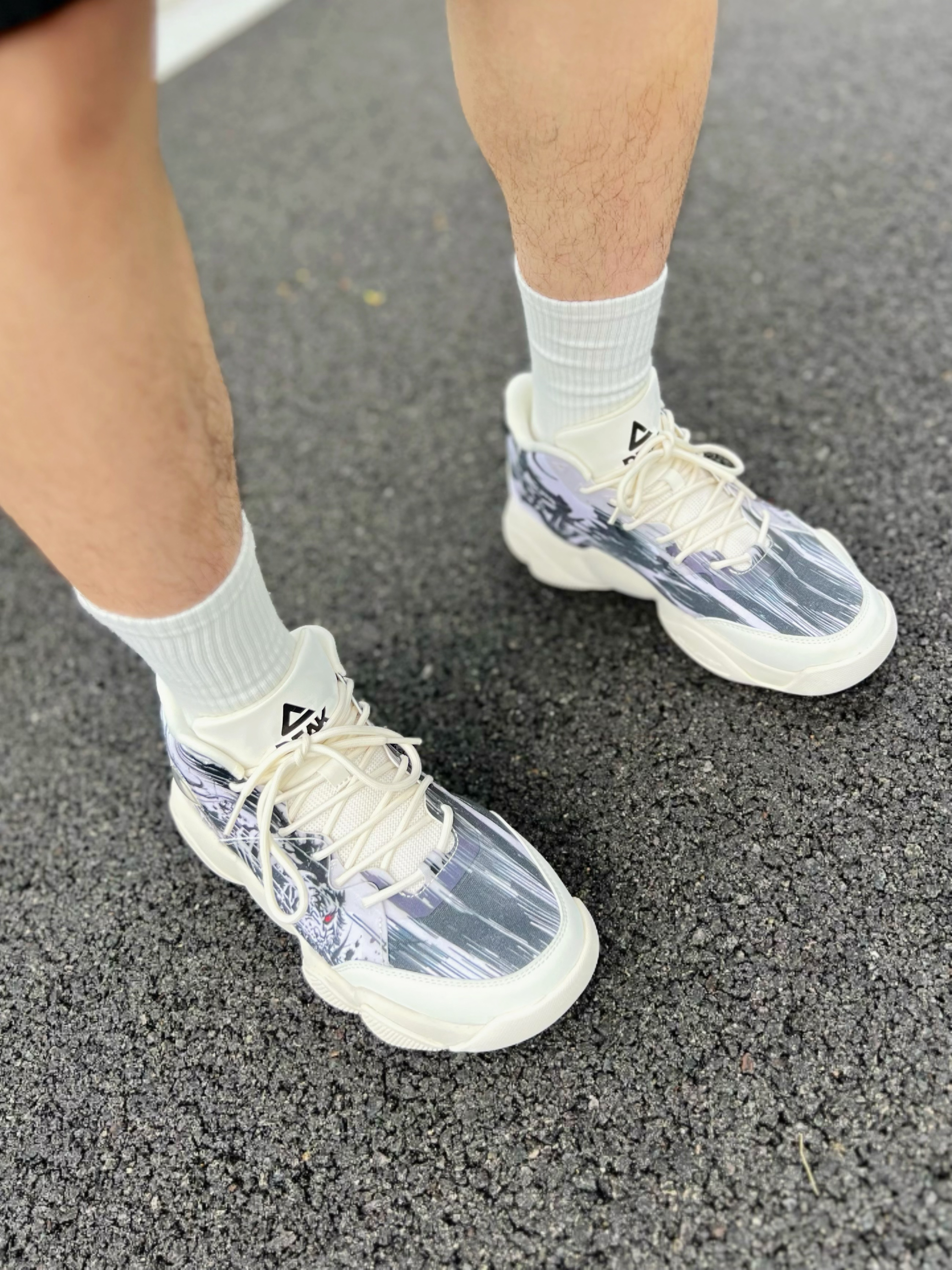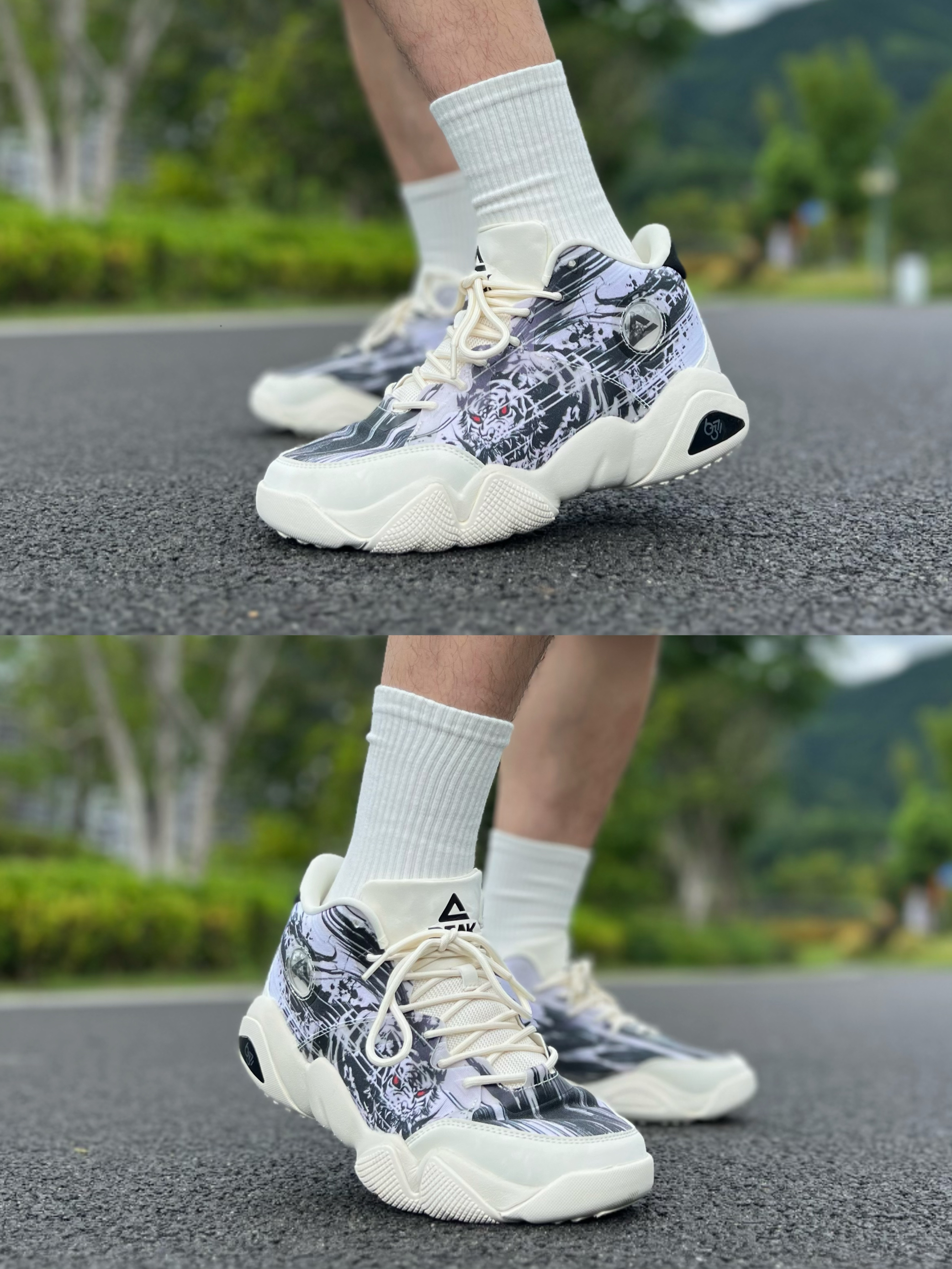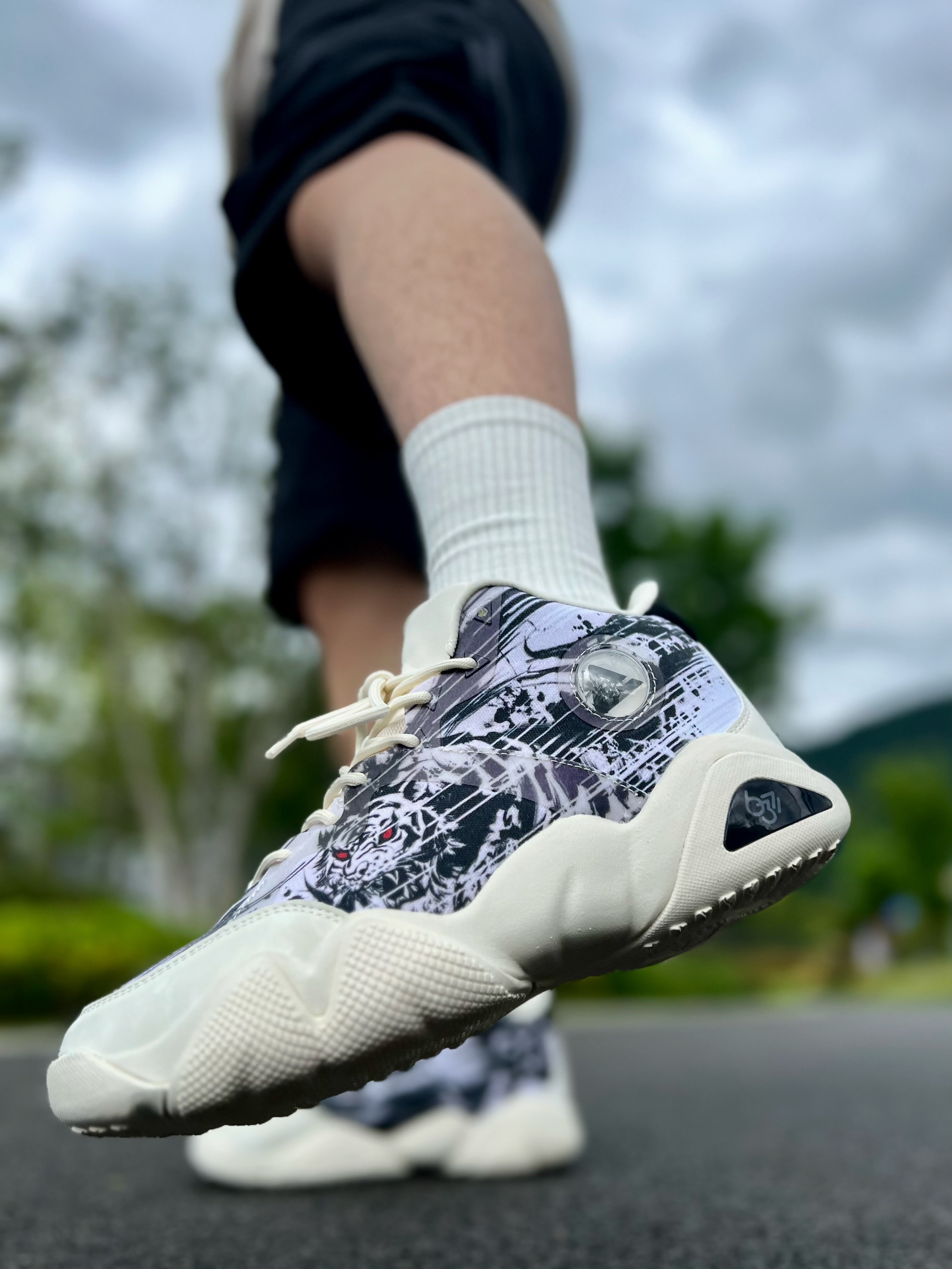 今日穿搭浅色🏻短袖➕黑色工装短裤🩳 配上一双风虎🐯休闲鞋👟 简单好看适合日常 ^_^ 鞋子设计的图案是“风虎云龙” 觉得那个红色的眼睛👀有点霸气的说 脚踝处的标“风”还会随鞋身而晃动的嘞[WOW] 上脚后有种类似篮球鞋的那种软弹感 但是包裹感却不会像球鞋那么强,蛮适合☀️夏天哦! 👟: 匹克