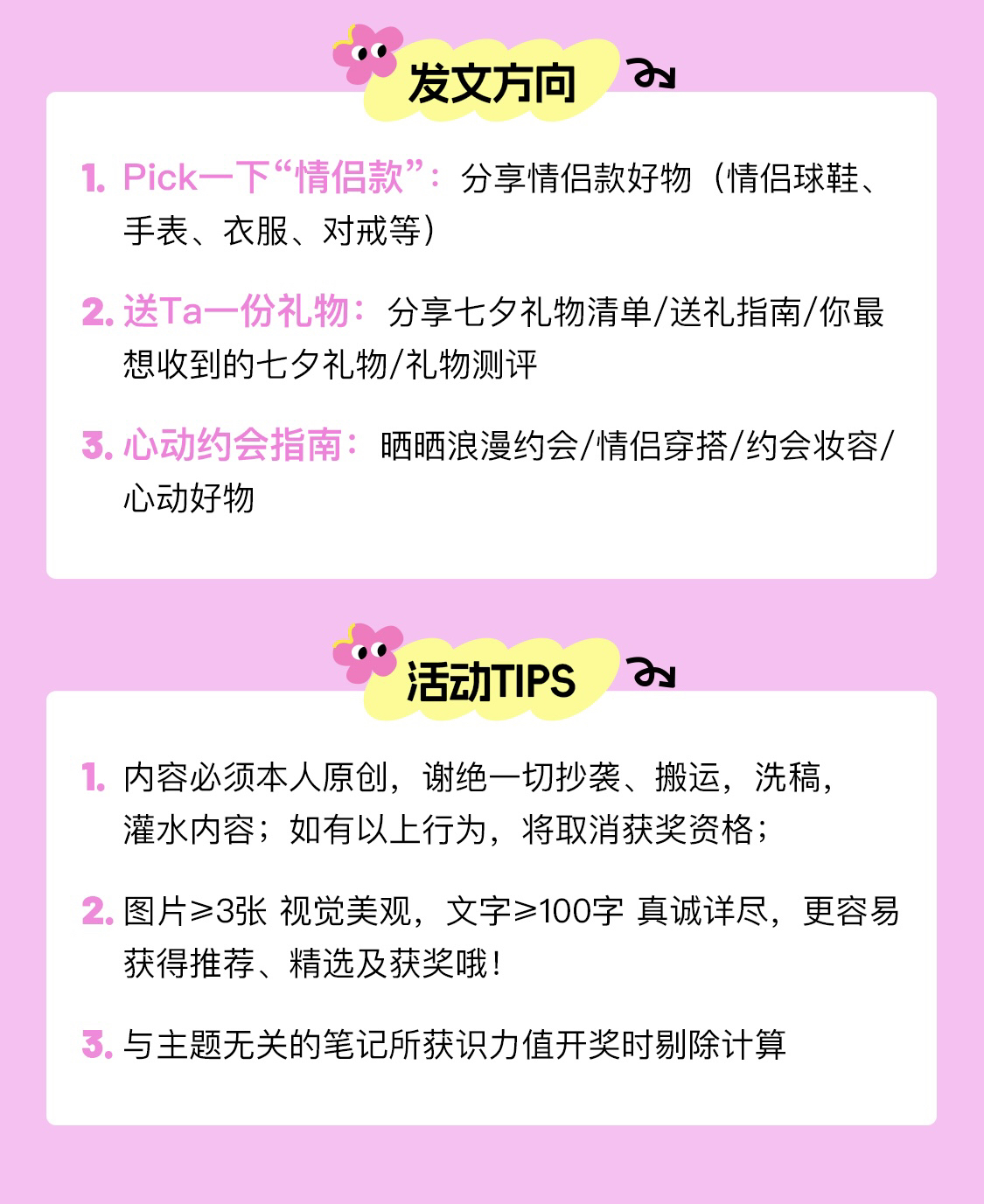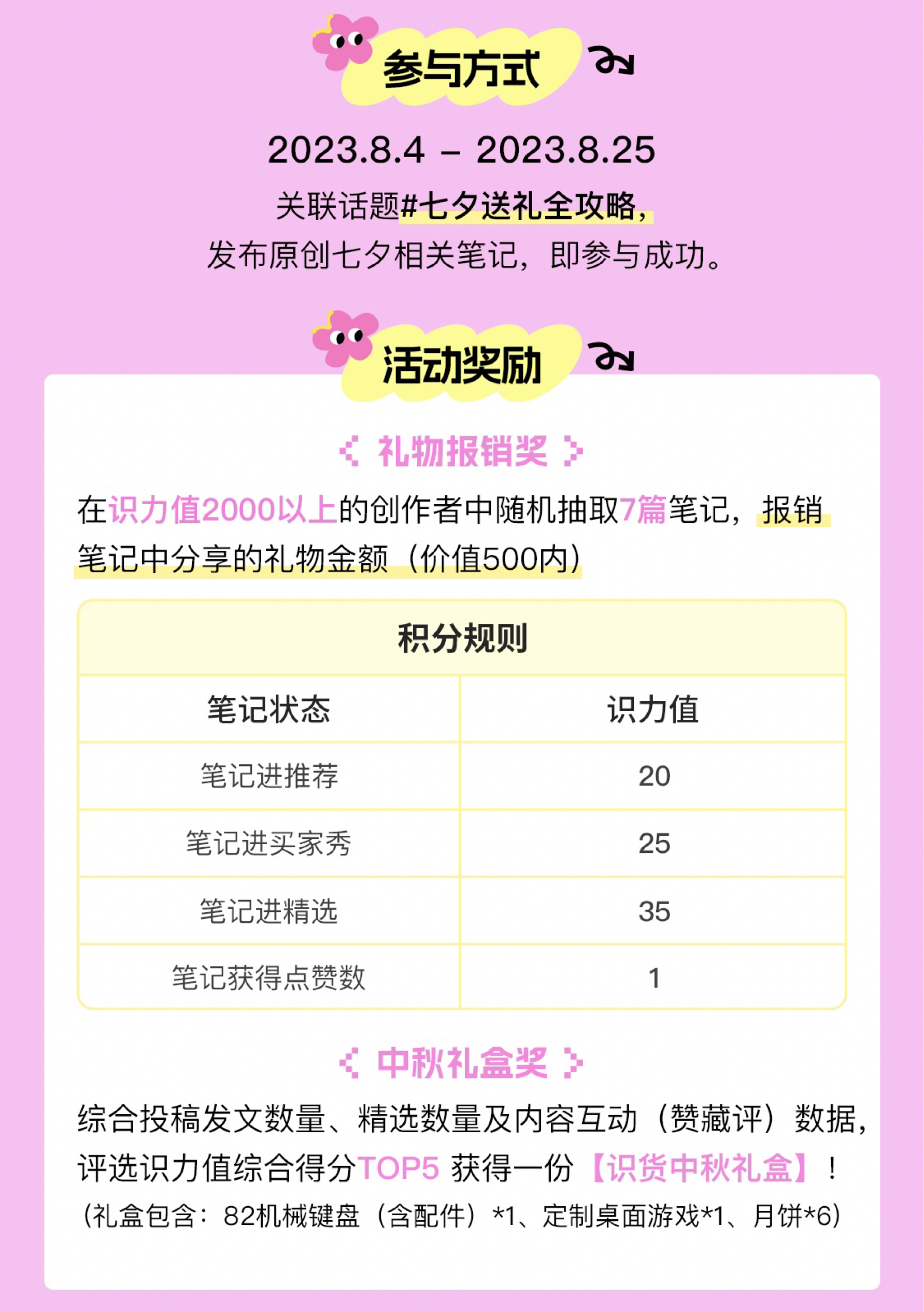 分享送礼指南,你的礼物我报销! 【活动时间】 2023.8.4-8.25 【参与规则】关联话题#七夕送礼全攻略,发布原创七夕相关笔记,即参与成功。 【活动奖励】 ①在识力值2000以上的创作者中随机抽取7篇笔记,报销笔记中分享的礼物金额(价值500内) ②综合投稿发文数量、精选数量及内容互动(赞藏评)数据,评选识力值综合得分TOP5 获得一份【识货中秋礼盒】! 【发文方向】 ①Pick一...