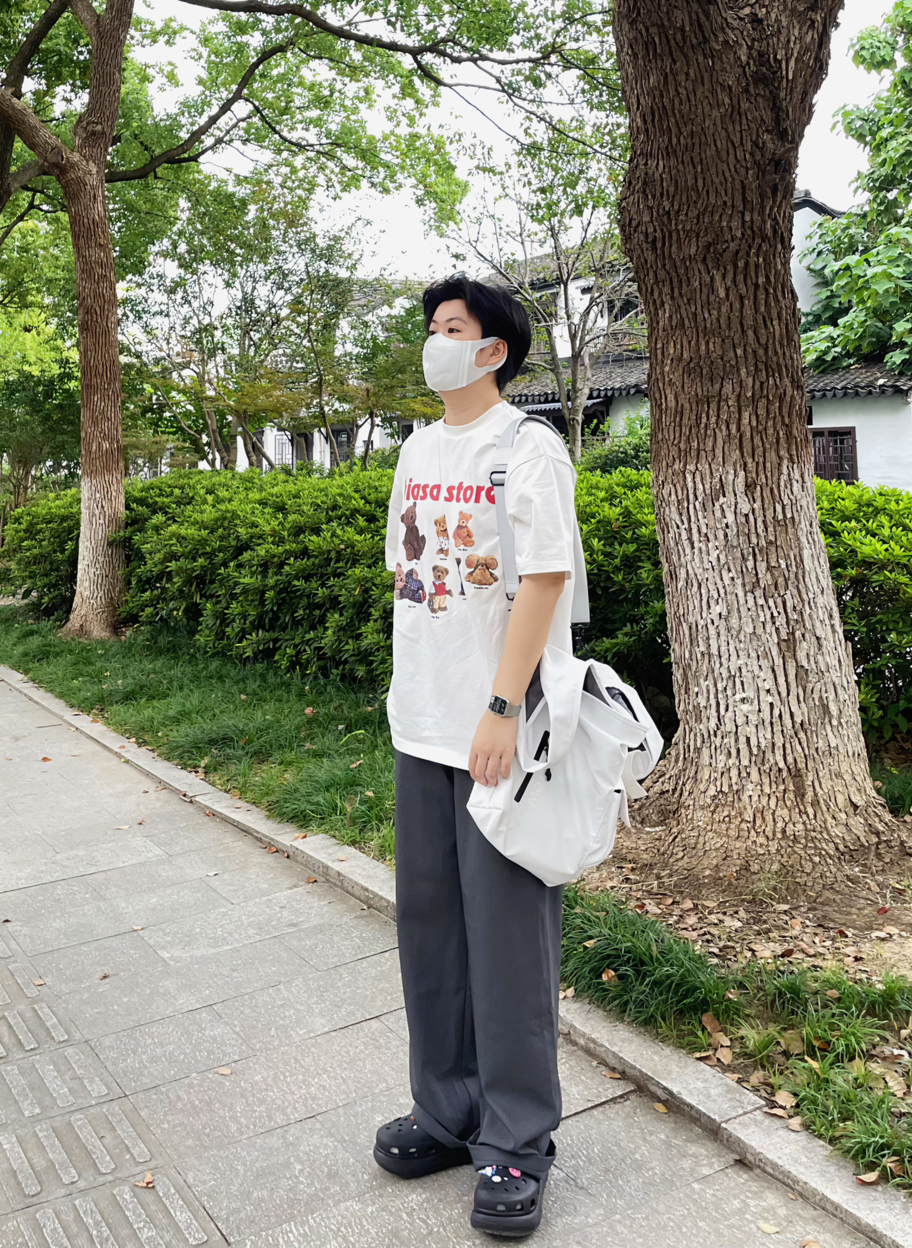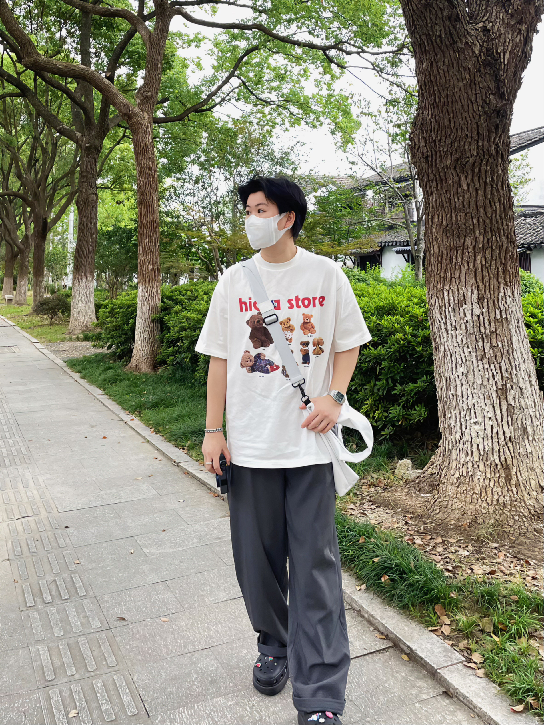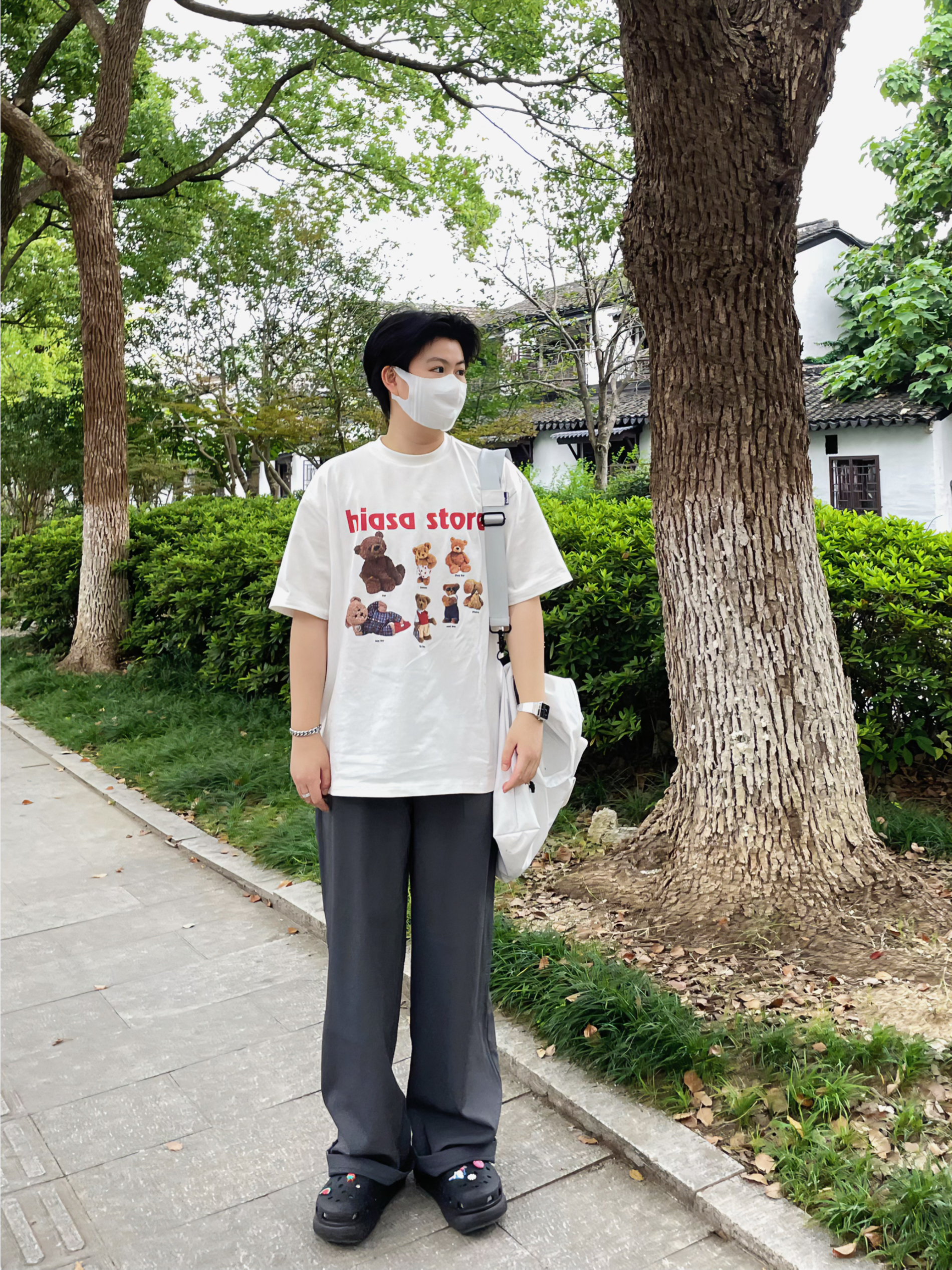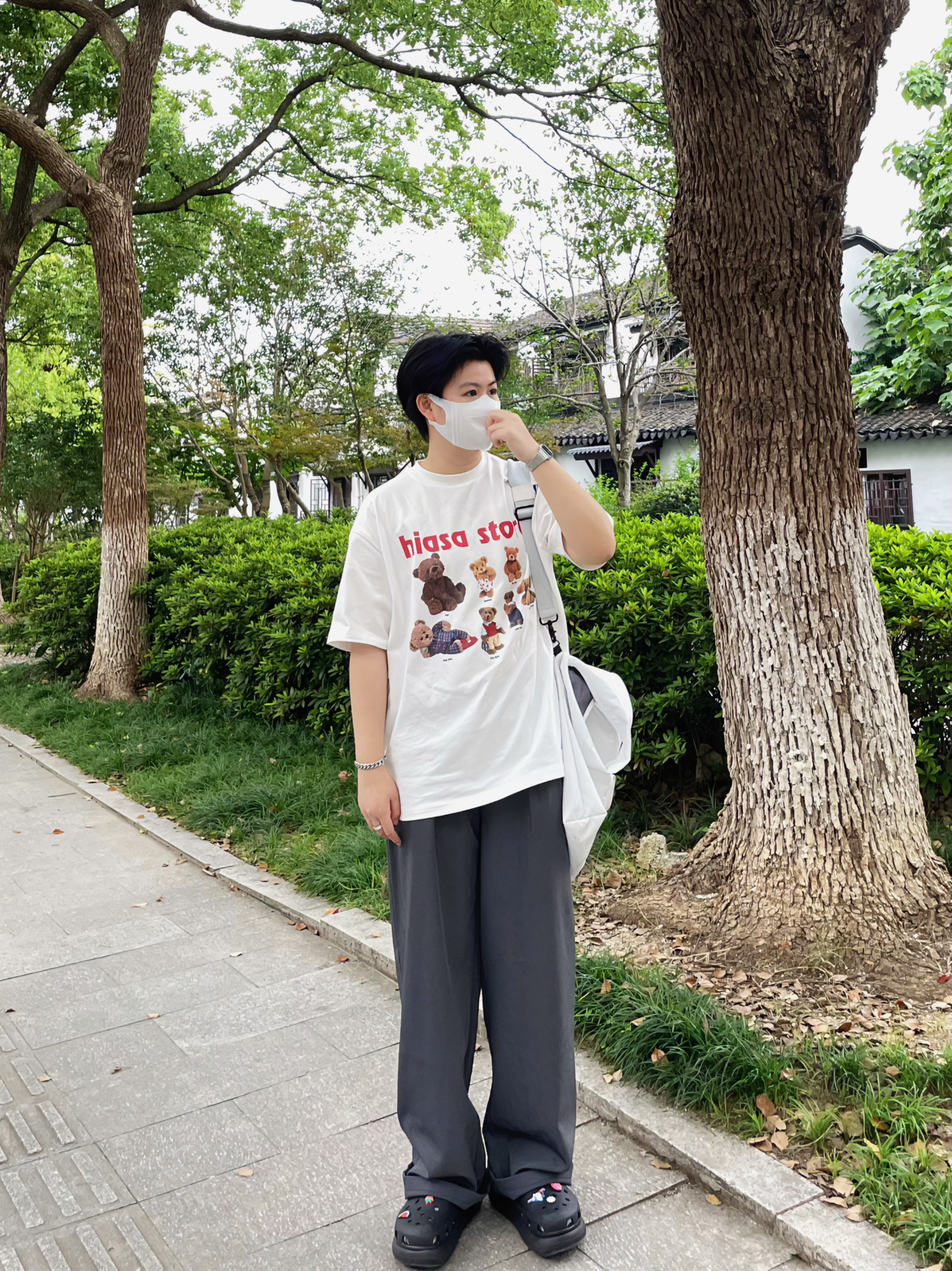 ✨小熊T恤的可爱度 真的随意搭什么裤子都很好看 灰色的拖地裤和黑色洞洞鞋的适配度很高
