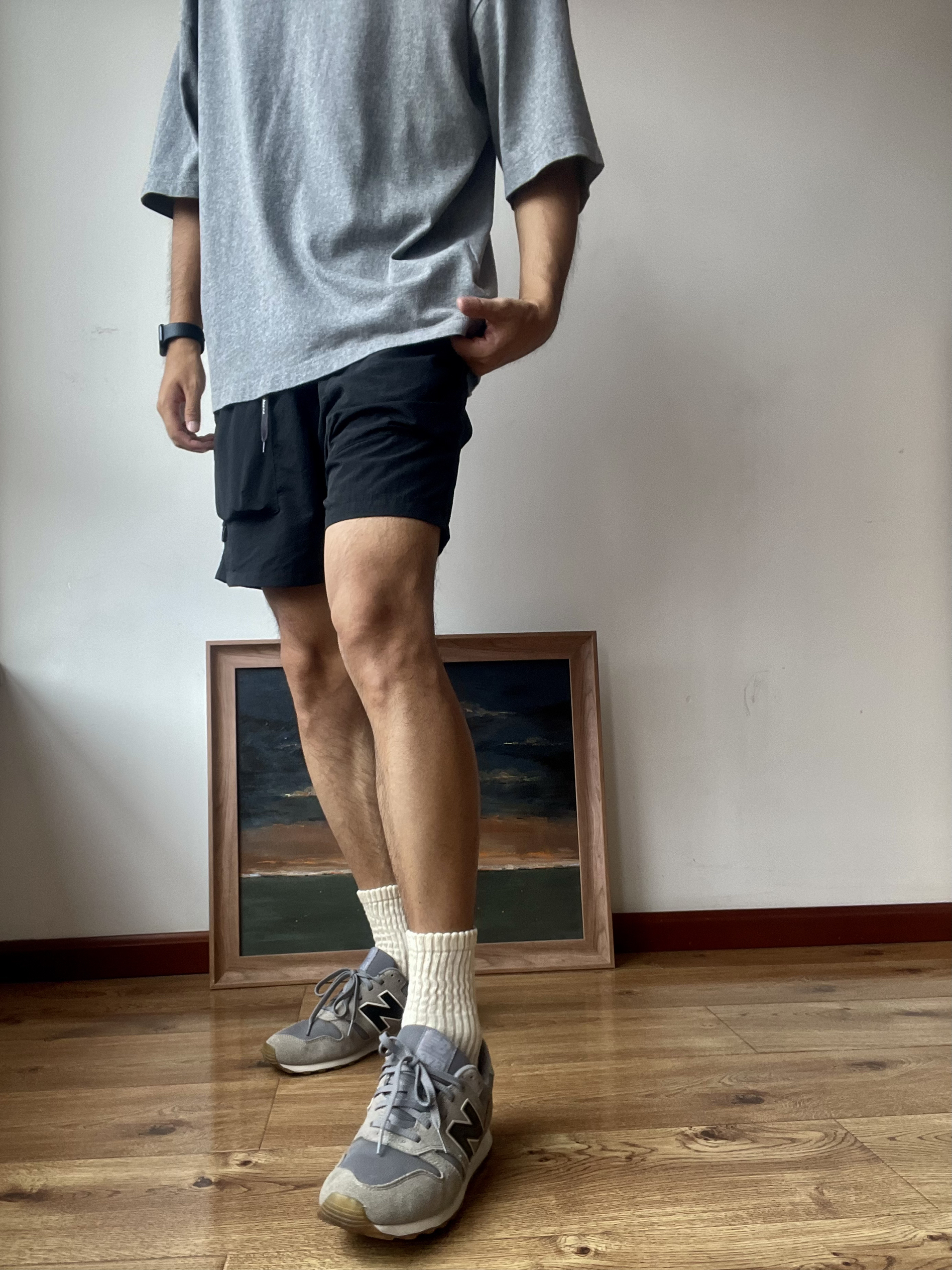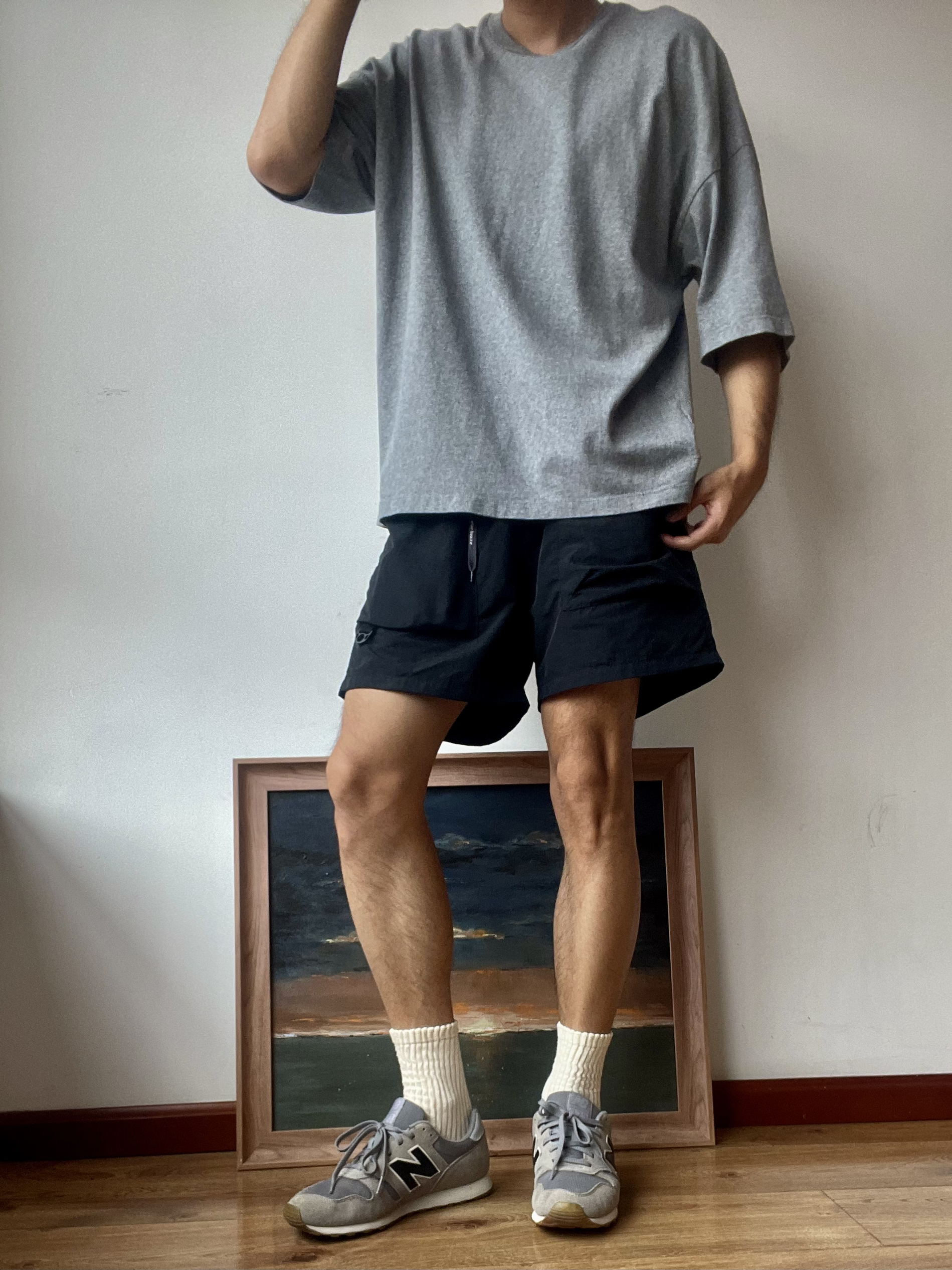 穿搭: 灰色系穿搭复古跑鞋街头氛围又不缺简约风格 细节: 鞋子颜色与上衣tee颜色呼应 上衣版型要落肩袖