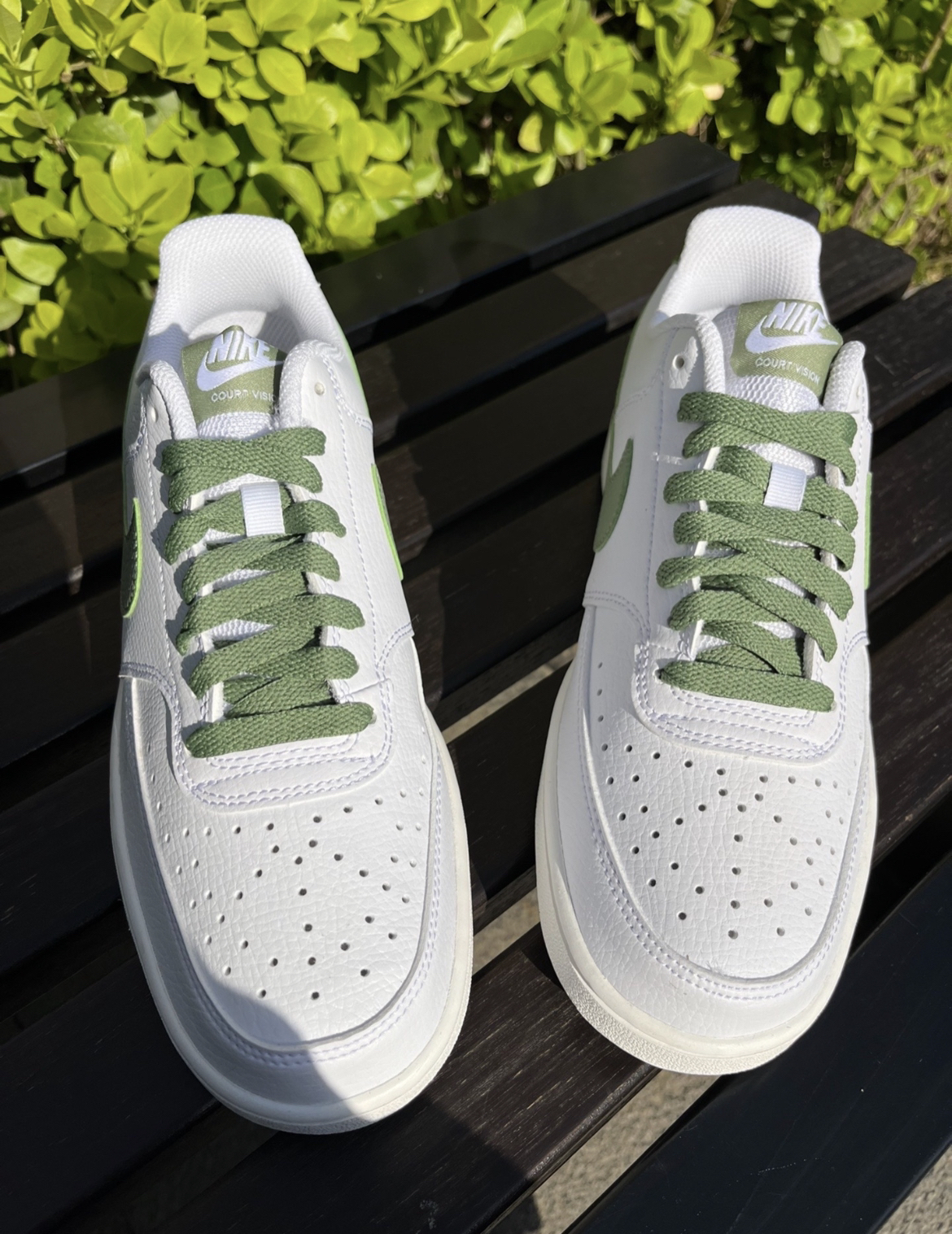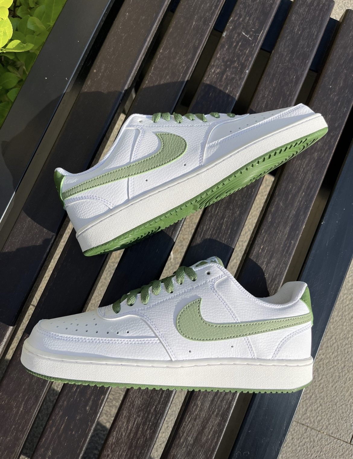 夏天已经悄悄来了 你的高颜值小白鞋备好了吗 如果还没有 那么这一期绝对是你的菜 这款Nike出品的Court Vision白绿颜值真的太炸裂了 鞋身大面积的白色光面皮革 加上鞋身内外两侧淡淡的抹茶绿配色的swoosh 配色真的清新淡雅 像极了夏天的颜色 鞋头处的透气孔也清晰可见 大大提升了鞋子的透气性能 同时鞋舌采用了白色织物材质 也能起到一定的透气作用 鞋舌上方还配有绿色的标识 与swoosh的...