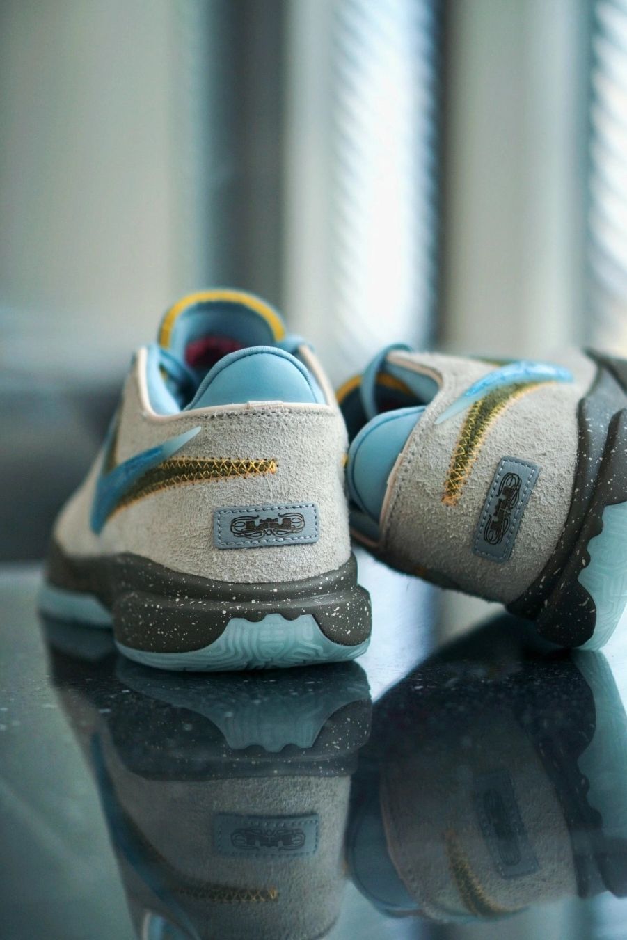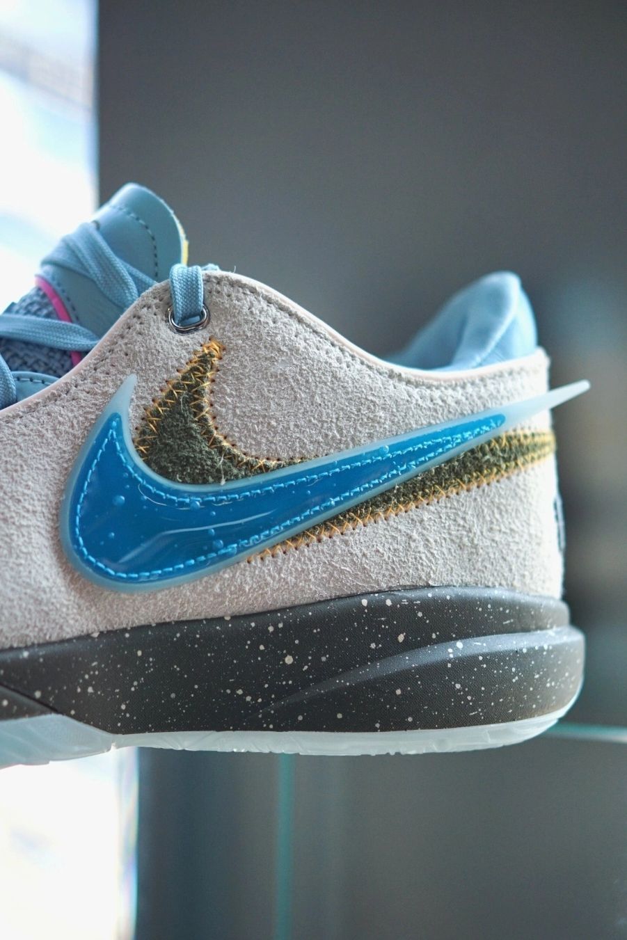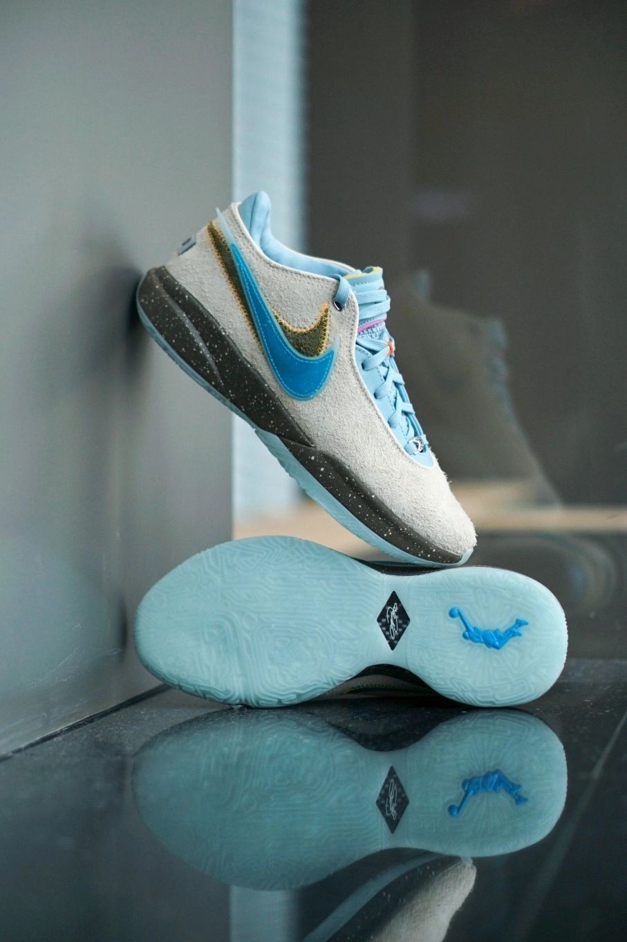 这双全新配色的LeBron xx是与迈阿密品牌UNKNWN联名的【瓶中信】主题版本,鞋面为灰色长绒面革设计,双SWOOSH分别为蓝色和水草绿色设计,鞋舌和内衬为水蓝色,外底带有夜光效果, 附赠两幅同色鞋带。该鞋店也是有詹姆斯本人的股份,还是有一点私心的