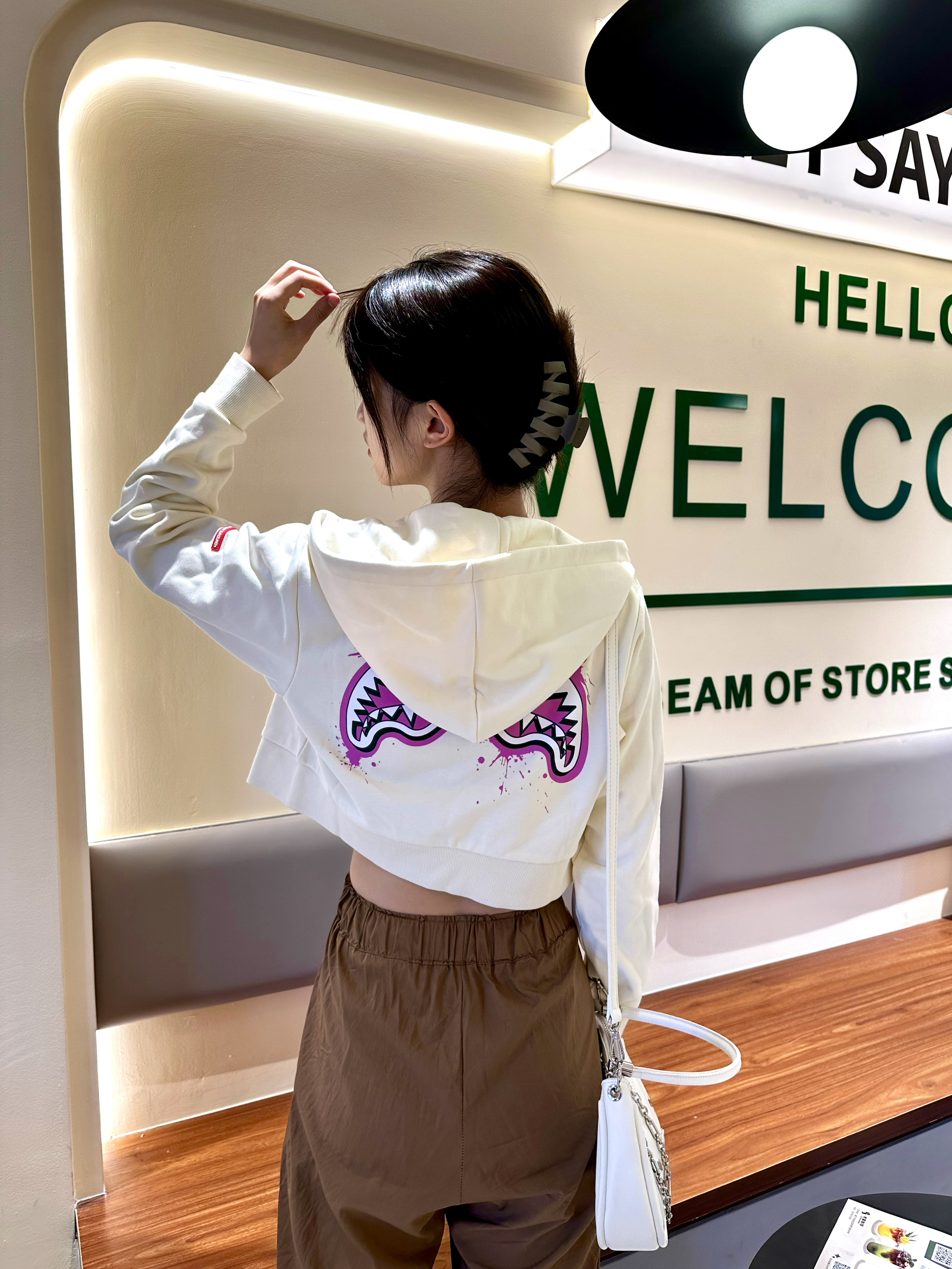 hi这里是大双啊👧 今日分享SPRAYGROUND鲨鱼嘴卫衣,经典鲨鱼嘴设计我太爱了!一次性入手两个颜色,短款卫衣+休闲裤是初秋的标配!!!出街、上课轻松Get√√√ 天气转凉不知道穿什么就套用这身搭配不管是运动鞋小板鞋椰子鞋轻松驾驭 姐妹们,!短款卫衣搭配why play海洋星星手链,不挑人戴,粉粉的少女心泛滥了!真的真的很好看,卫衣还有大帽子戴起来贼好看~ 下面再穿条休闲裤,一套元气满满!!