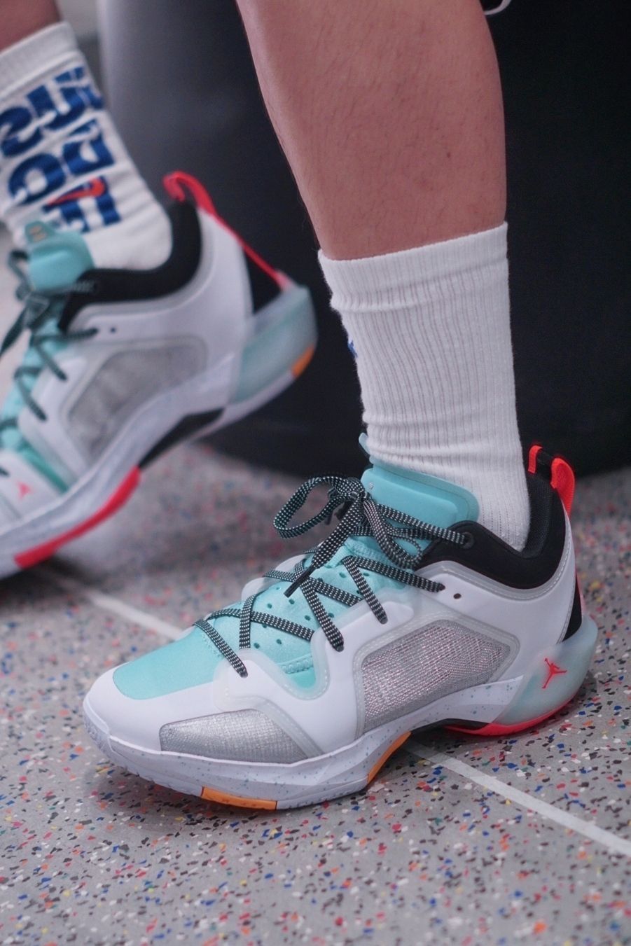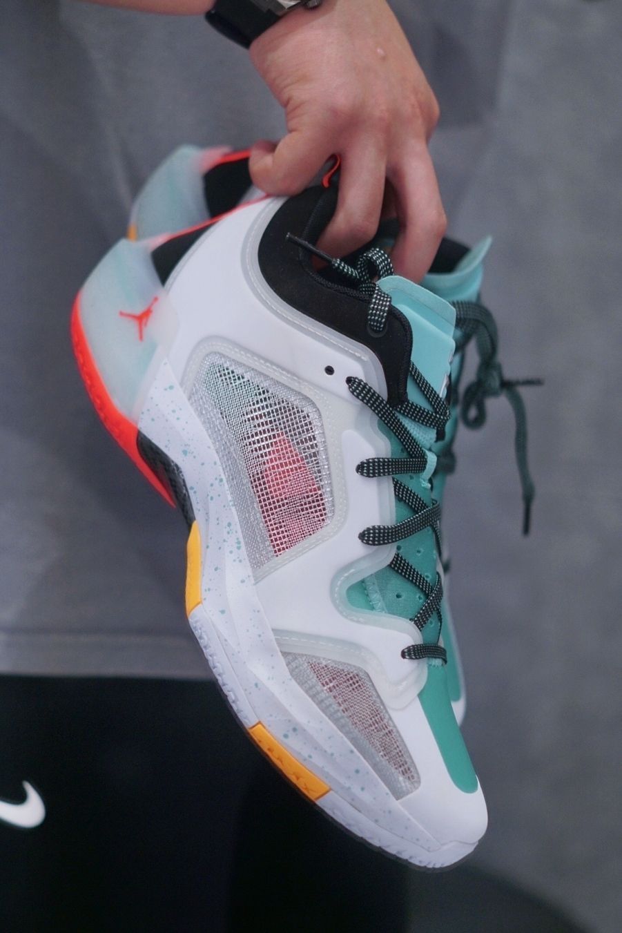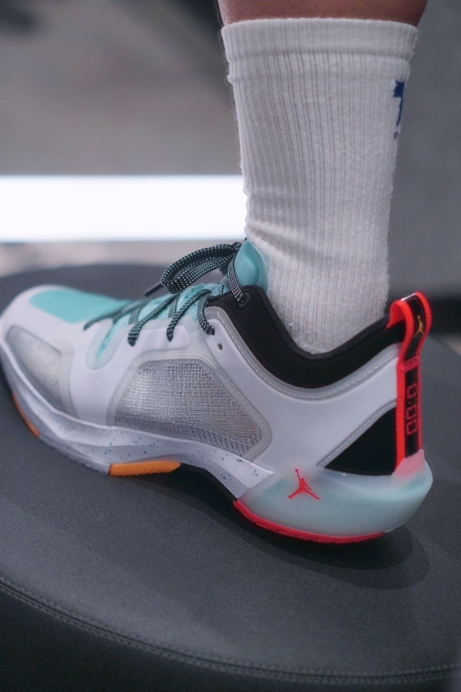 薄荷绿的颜色一直是郭艾伦PE的代表色 从李宁到Jordan brand 但是全部绿色总会有点单调 出了这么多也有点审美疲劳了 这次37low加入了一些黄色橘色点缀 细节更加丰富了 鞋面的材质也与普通版本有些区别 可以说这双设计上还是用了心的