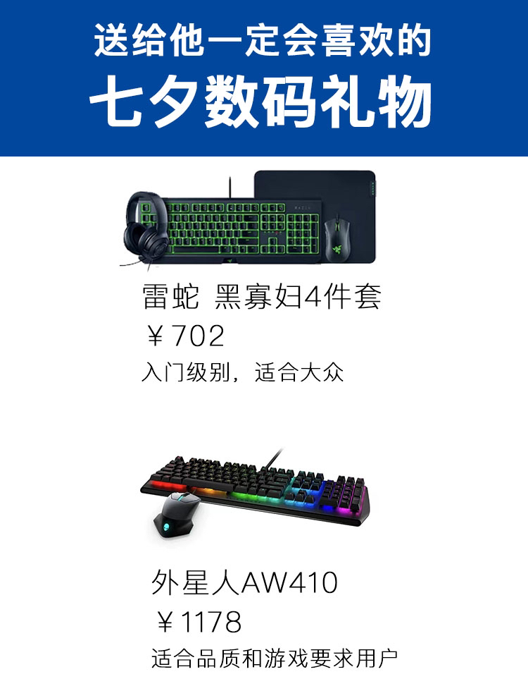 适合送给喜欢玩游戏的男友或老公,这么一套键鼠组合,会令男生极为兴奋,更会夸你真的很懂他们,至于品牌,选择范围蛮广,推荐了2款,雷蛇和外星人,也都是电竞的常客,品牌知名度有了送礼拿得出手的,女生可以根据经济情况选择。有能力建议大家一步到位,免得后悔。