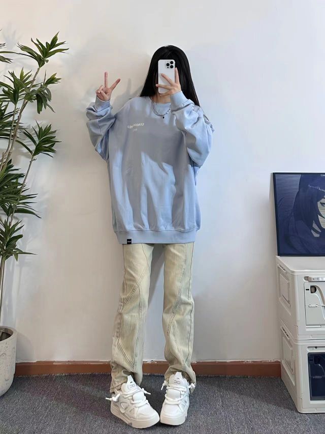 这条立体解构泥黄色牛仔裤,上身超好看。 有一点微喇版型,很高街风,vibe风。 真的是超级百搭。秋天可以穿哦。 趁现在赶紧抢