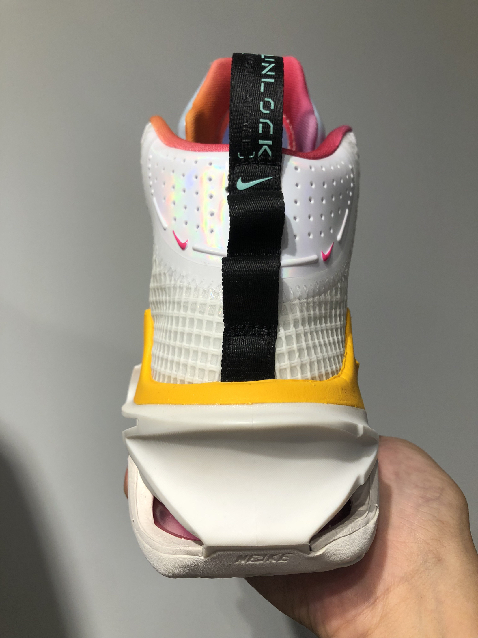 Nike Air Zoom G.T.Jump “Unlock Your Space” 白蓝橙 在配置方面,这双鞋没有任何的问题,配置非常的豪华,而且鞋子的脚感还有他的保护性支撑性都是没什么问题的! 外观方面其实也是属于一个比较帅气的水平,只不过超高帮的设计就是限制了他最大的灵活性,所以说这双鞋适合内线球员或者爆发力强的锋线球员!