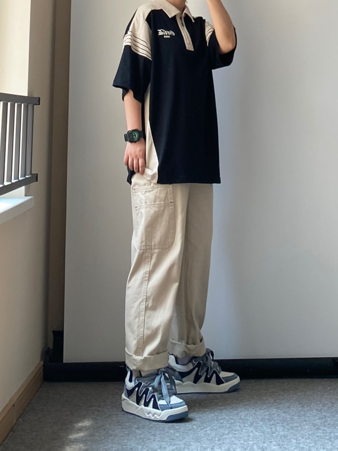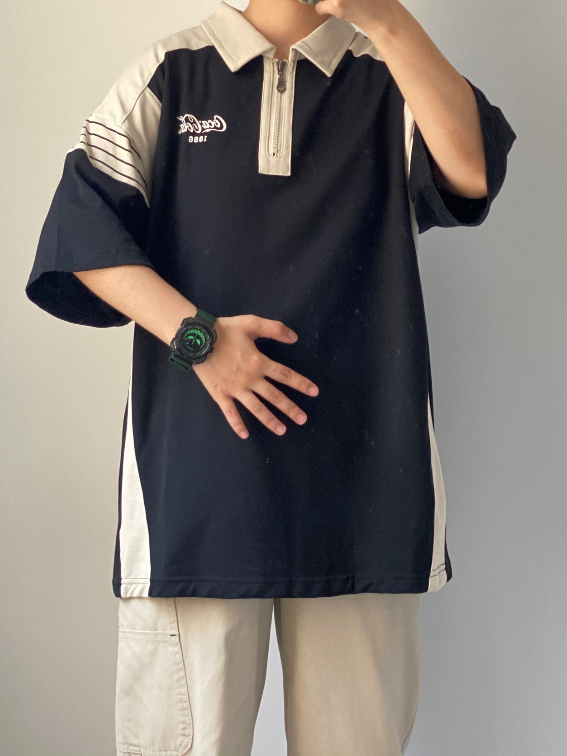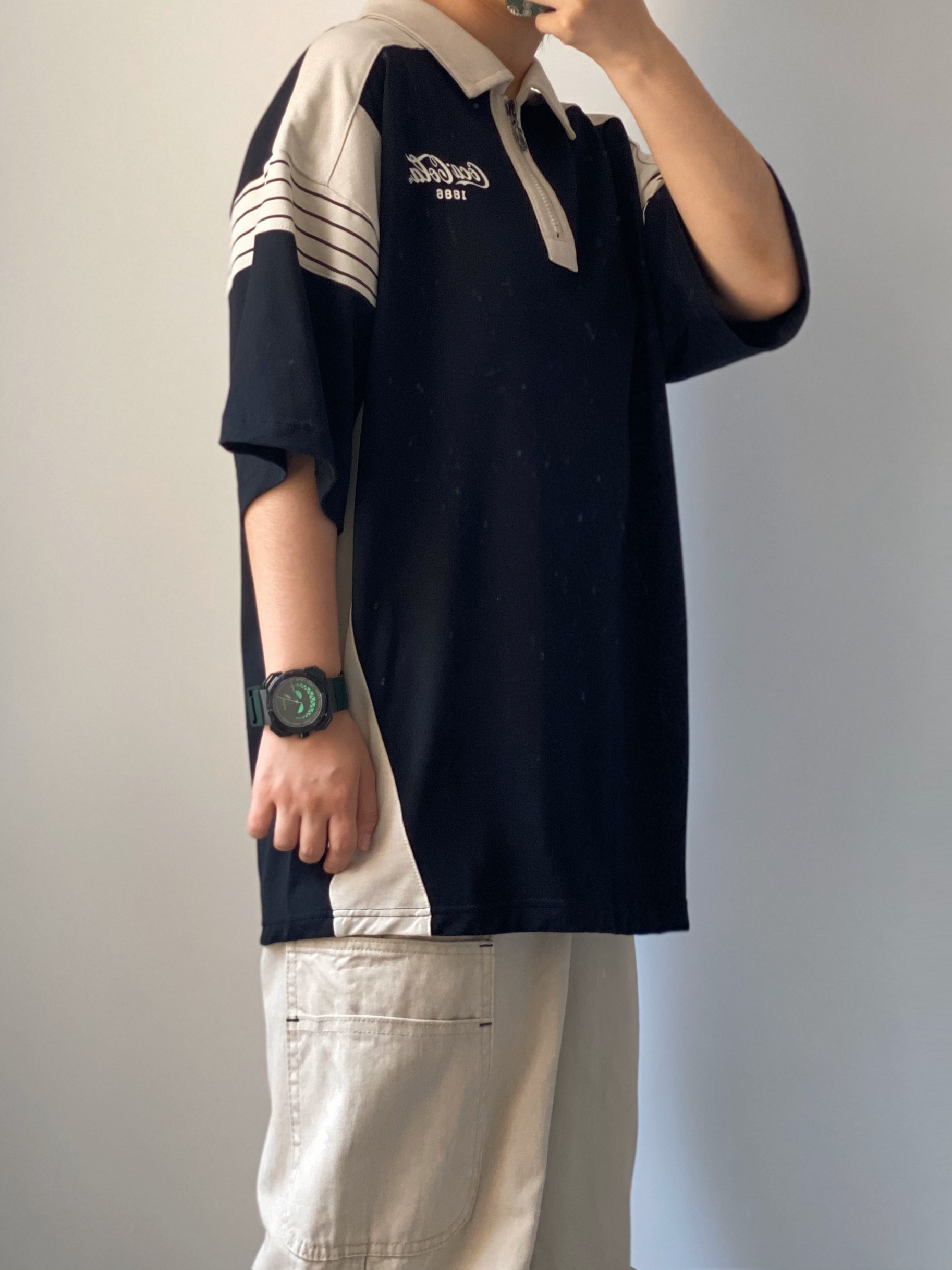 黑色+米色拼接撞色的polo衫👔 👖搭配一条杏色的直筒休闲工装裤 一整个都市休闲风🚶🏻 舒适百搭时尚 👟搭配板鞋或者面包鞋都可以 我今天穿的是白蓝撞色的面包鞋 牛仔蓝的点缀撞色很有夏天清爽的感觉🌊 出门搭配除了选好衣服当然少不了手表⌚️啦 雷诺的大魔王也太帅啦 带有夜光效果的绿色大魔王😈邪恶笑脸点缀表盘 搭配墨绿色的硅胶表带 是我夏天出门很喜欢戴的一块手表~ 最近的天气经常下雨☔️ 100...