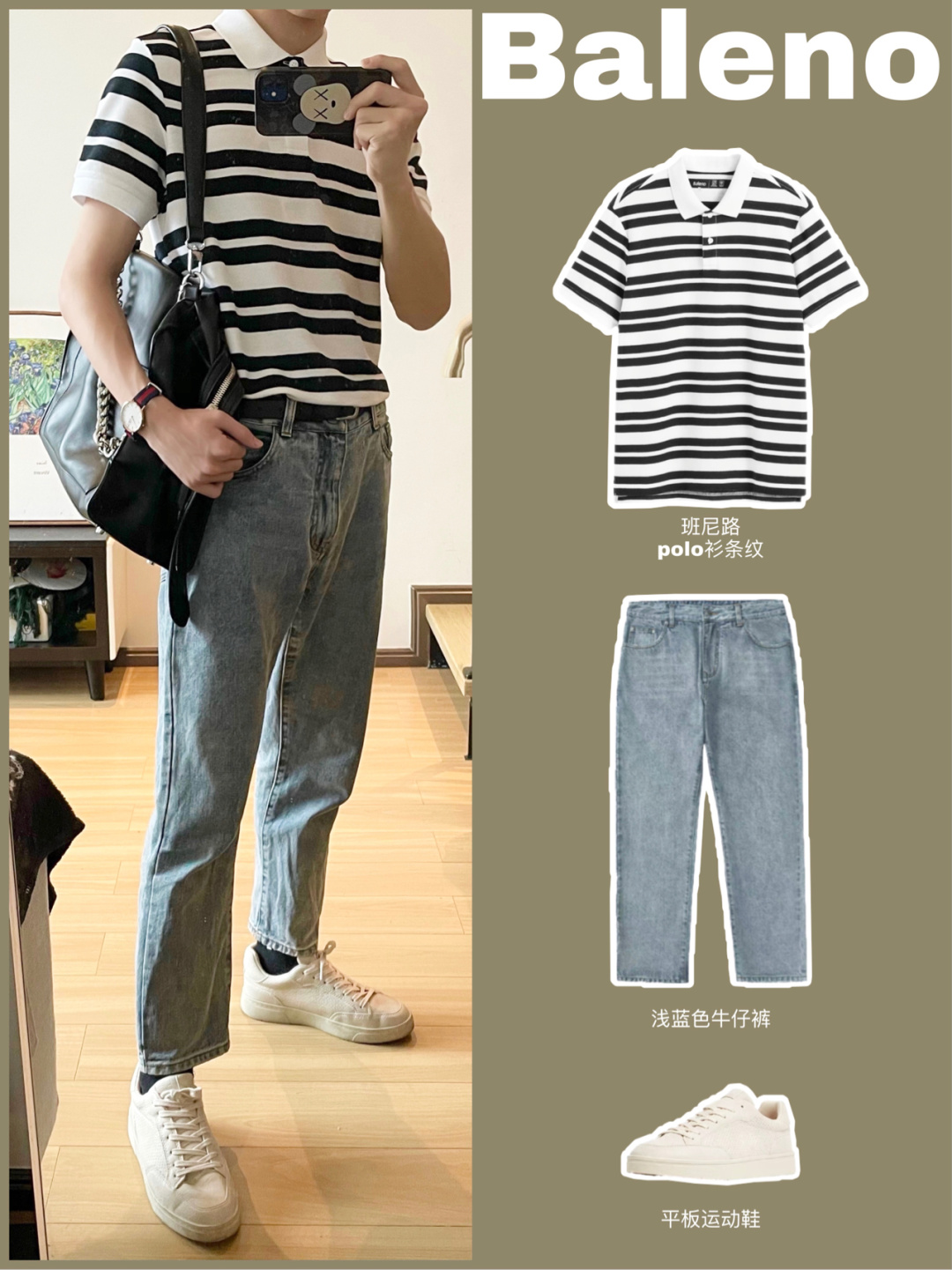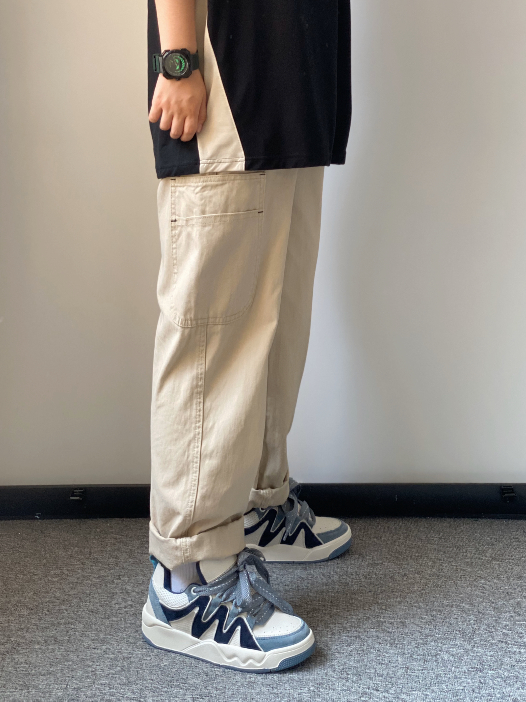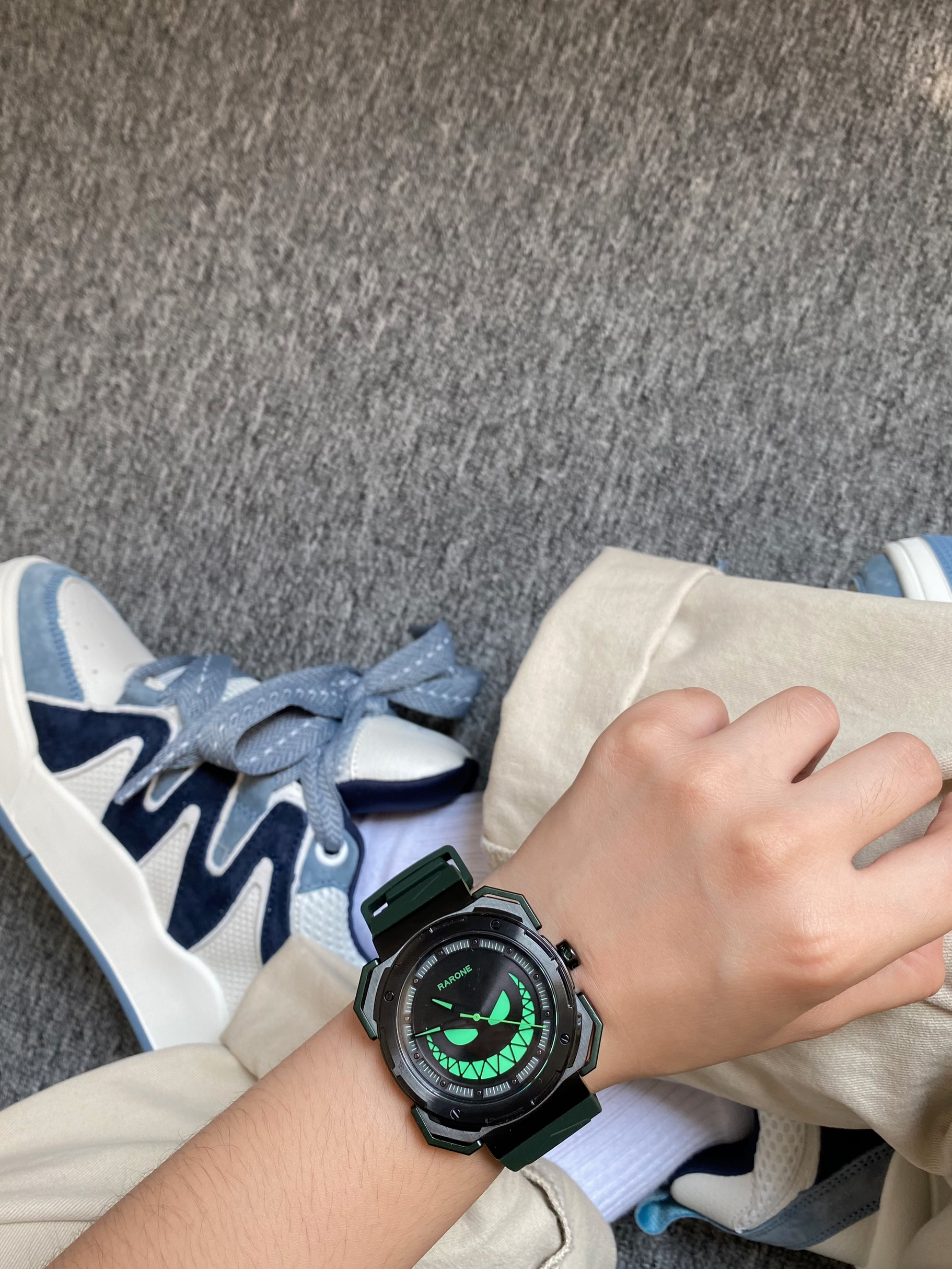 黑色+米色拼接撞色的polo衫👔 👖搭配一条杏色的直筒休闲工装裤 一整个都市休闲风🚶🏻 舒适百搭时尚 👟搭配板鞋或者面包鞋都可以 我今天穿的是白蓝撞色的面包鞋 牛仔蓝的点缀撞色很有夏天清爽的感觉🌊 出门搭配除了选好衣服当然少不了手表⌚️啦 雷诺的大魔王也太帅啦 带有夜光效果的绿色大魔王😈邪恶笑脸点缀表盘 搭配墨绿色的硅胶表带 是我夏天出门很喜欢戴的一块手表~ 最近的天气经常下雨☔️ 100...