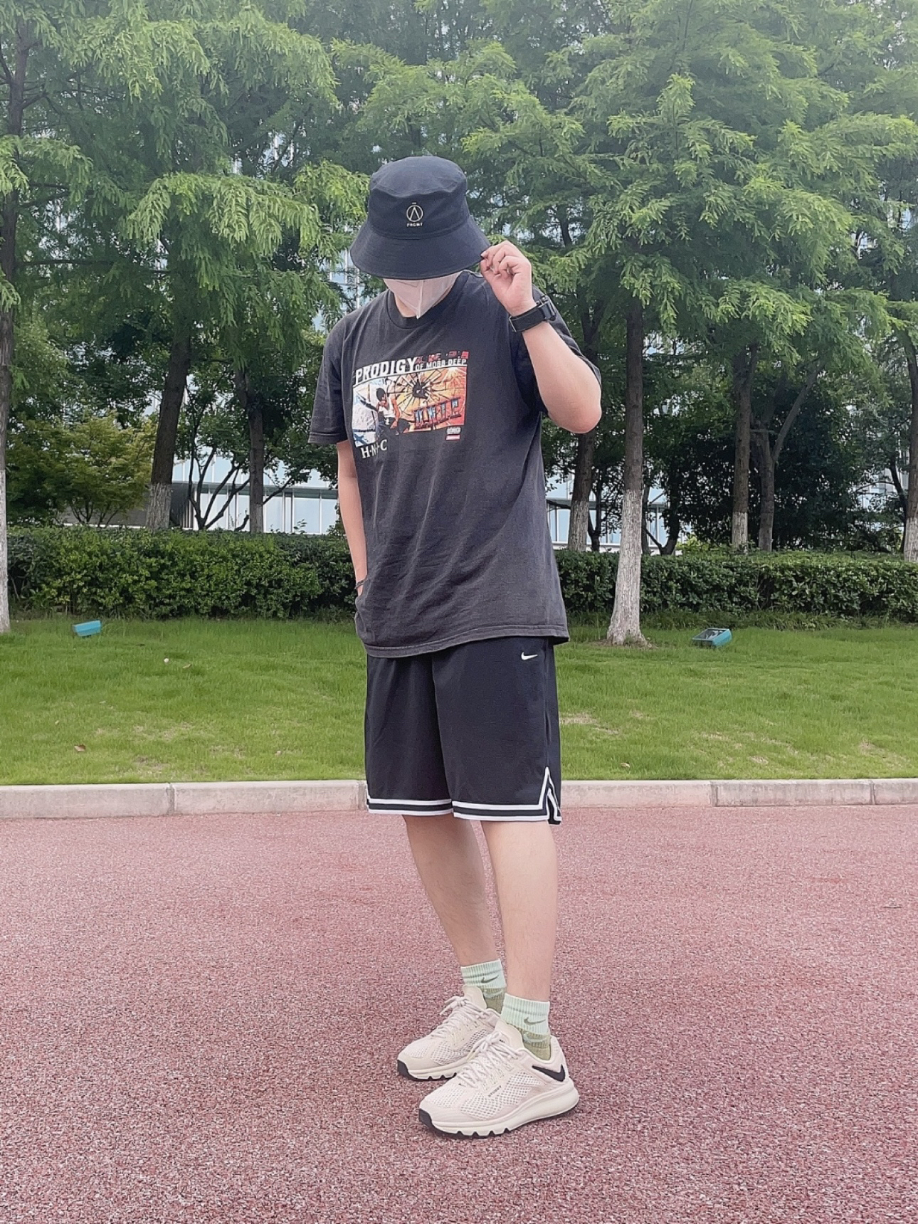 今日份穿搭球鞋分享 黑色水洗宽松短袖➕Nike ACG 多口袋工装短裤 搭配Nike 低帮空军一号 Off-White 联名 黑色鞋身➕白色钩钩 真的酷 鞋面相比基础空军透气轻盈 很适合夏天💗