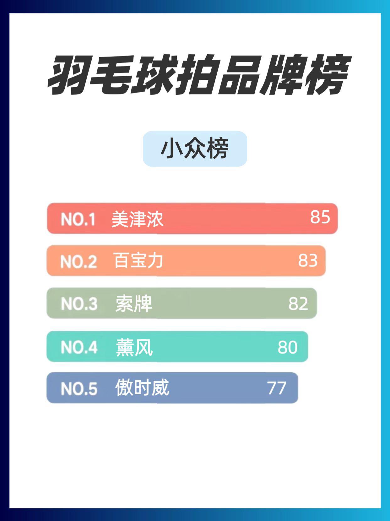 今天给大家整理了一期羽毛球拍品牌排行榜!小伙伴们在选羽毛球拍之前看一遍,绝对不踩雷! 1⃣️一线品牌(3大厂) 尤尼克斯/yy(绿厂) 威克多/胜利(蓝厂) 李宁(红厂) 2⃣️二线品牌(小众品牌) 美津浓 百宝力 索牌 薰风 3⃣️性价比榜 威克多 波力 李宁 凯胜 薰风 4⃣️高端榜 尤尼克斯 威克多 李宁 美津浓 索牌 🔥同时也欢迎各位喜欢羽毛球拍的小伙伴给出自己的意见哦!一起学习...