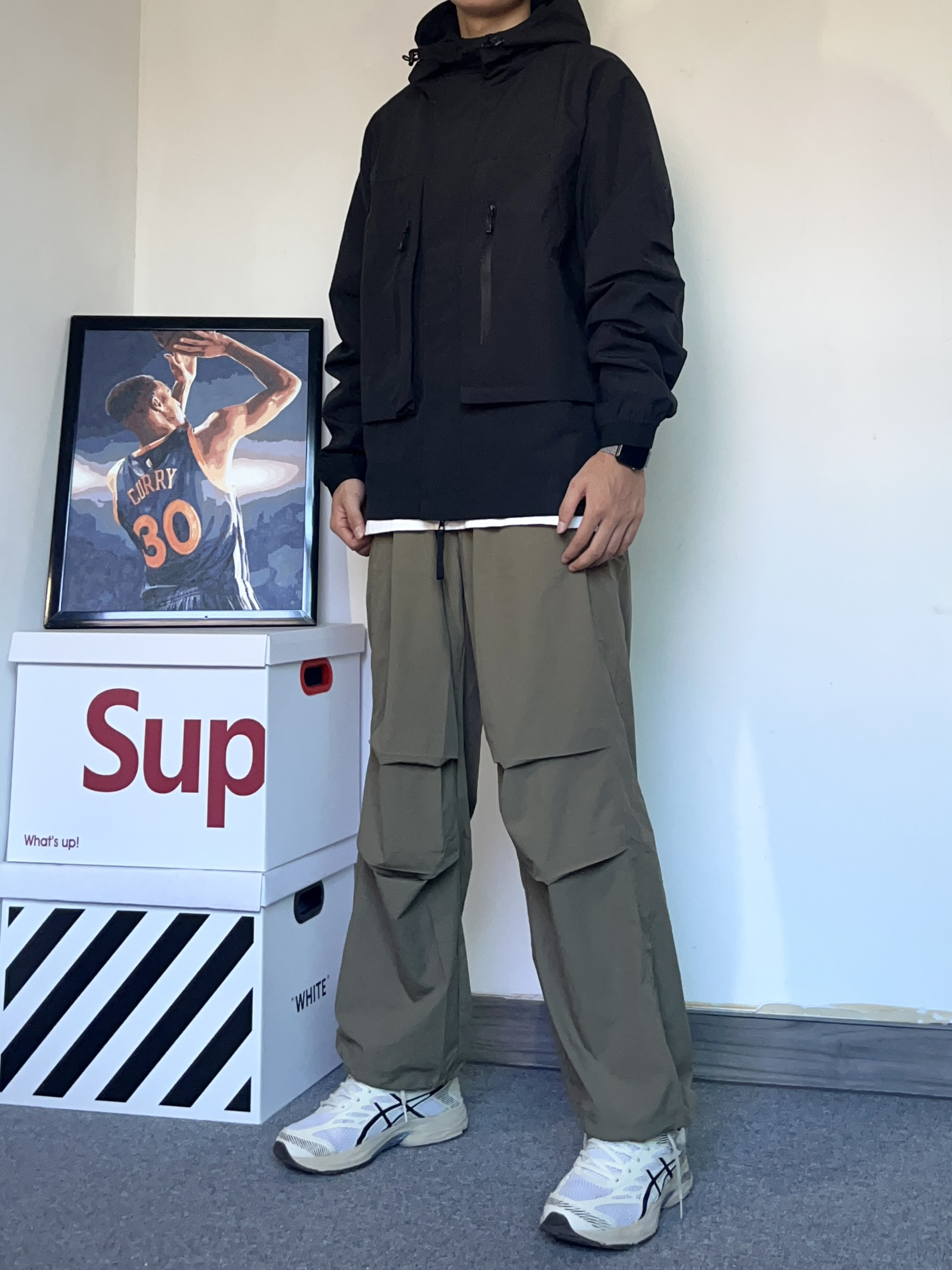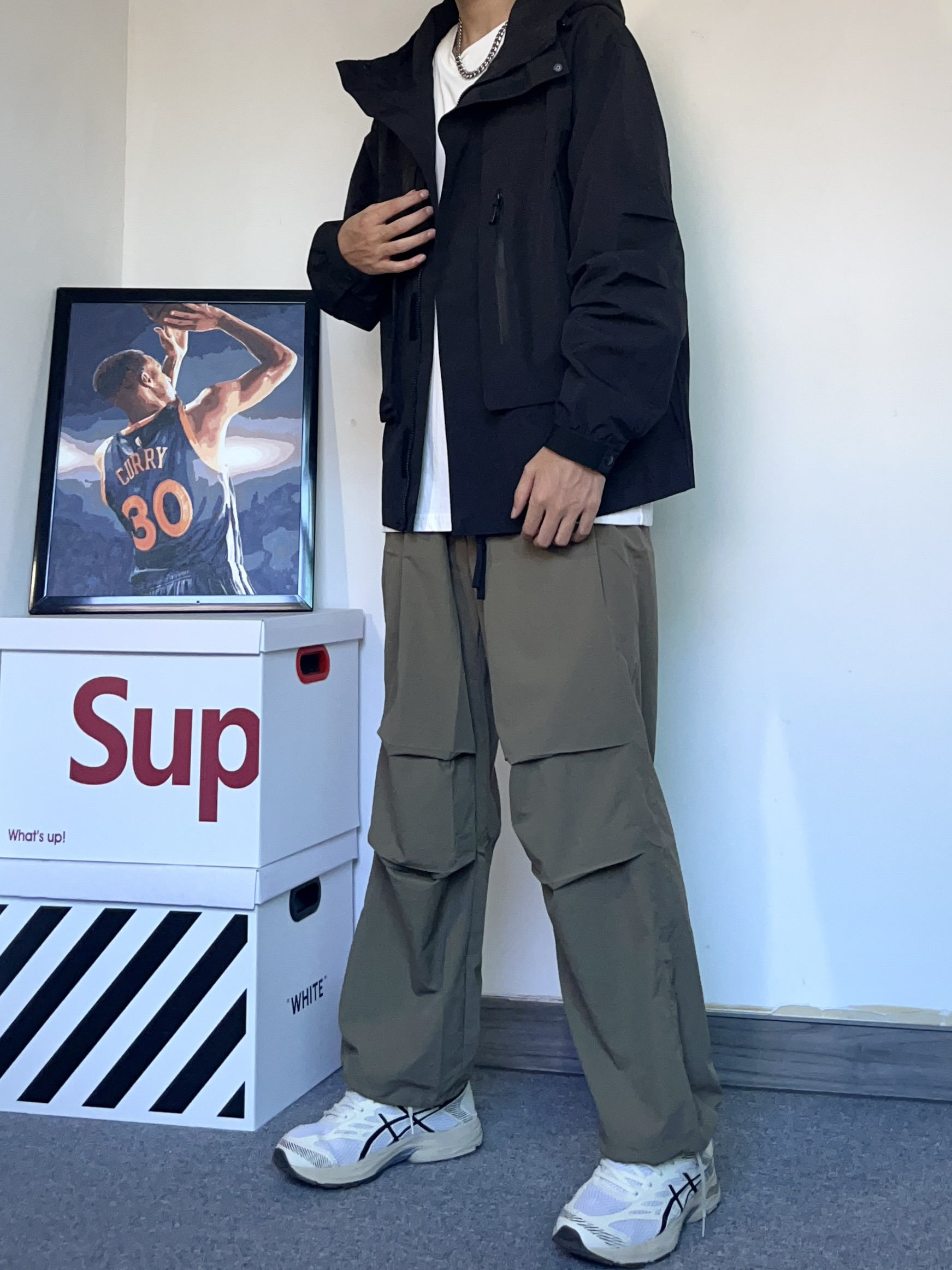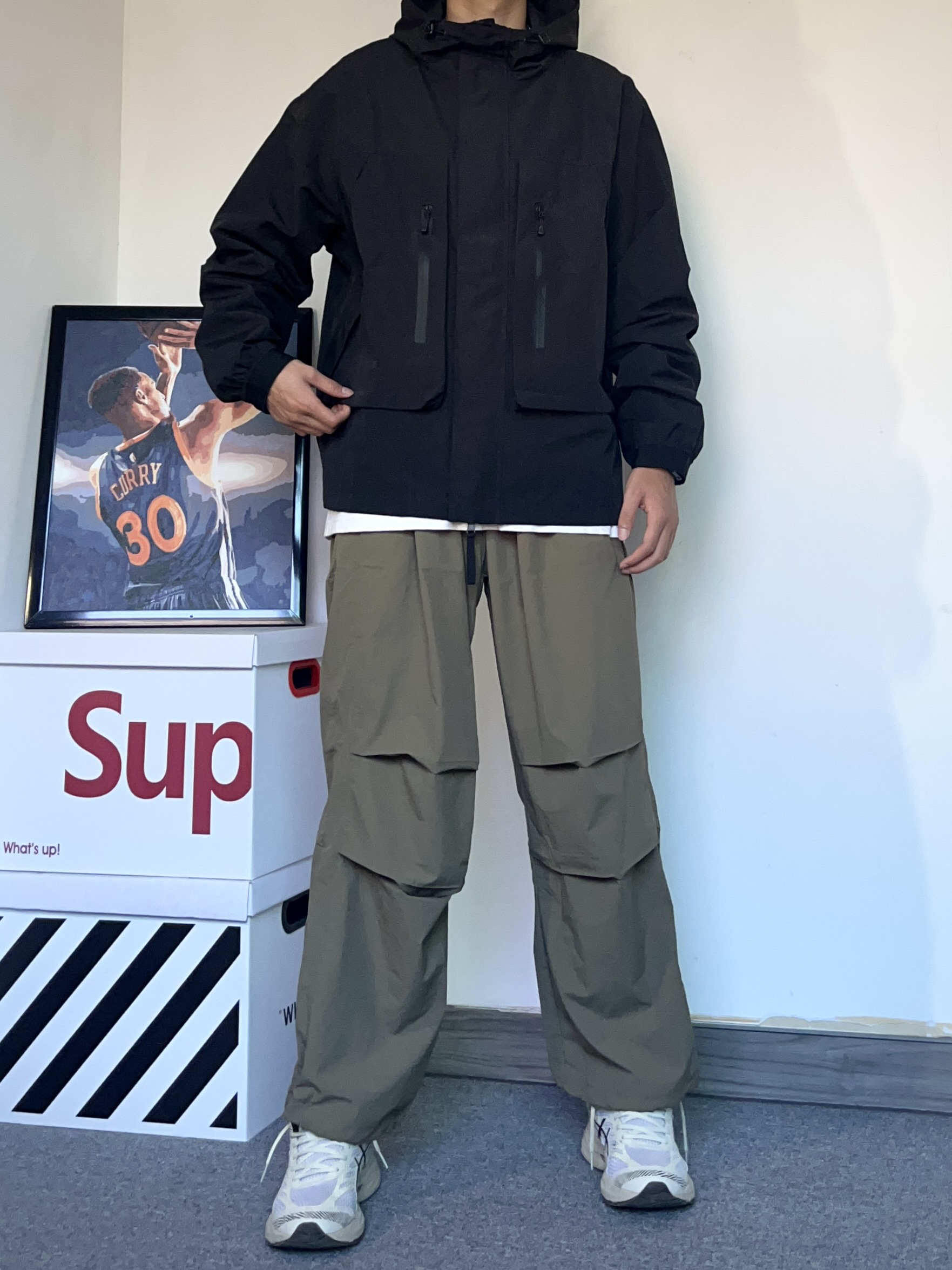 现在正值旅游季!今天分享一套旅行户外穿搭!既防晒又帅气! - 今天了一身冲锋衣+工装裤! 上身是一件黑色的冲锋衣,版型特别好,很硬挺! 材料穿着很舒服,最重要的是防水!真的很适合去爬山或者户外旅行 - 搭配裤一条浅一点的军绿色工装裤!速干的材质即使是夏天穿也很舒服贼拉透气,很轻薄 主打一个户外氛围感穿搭!